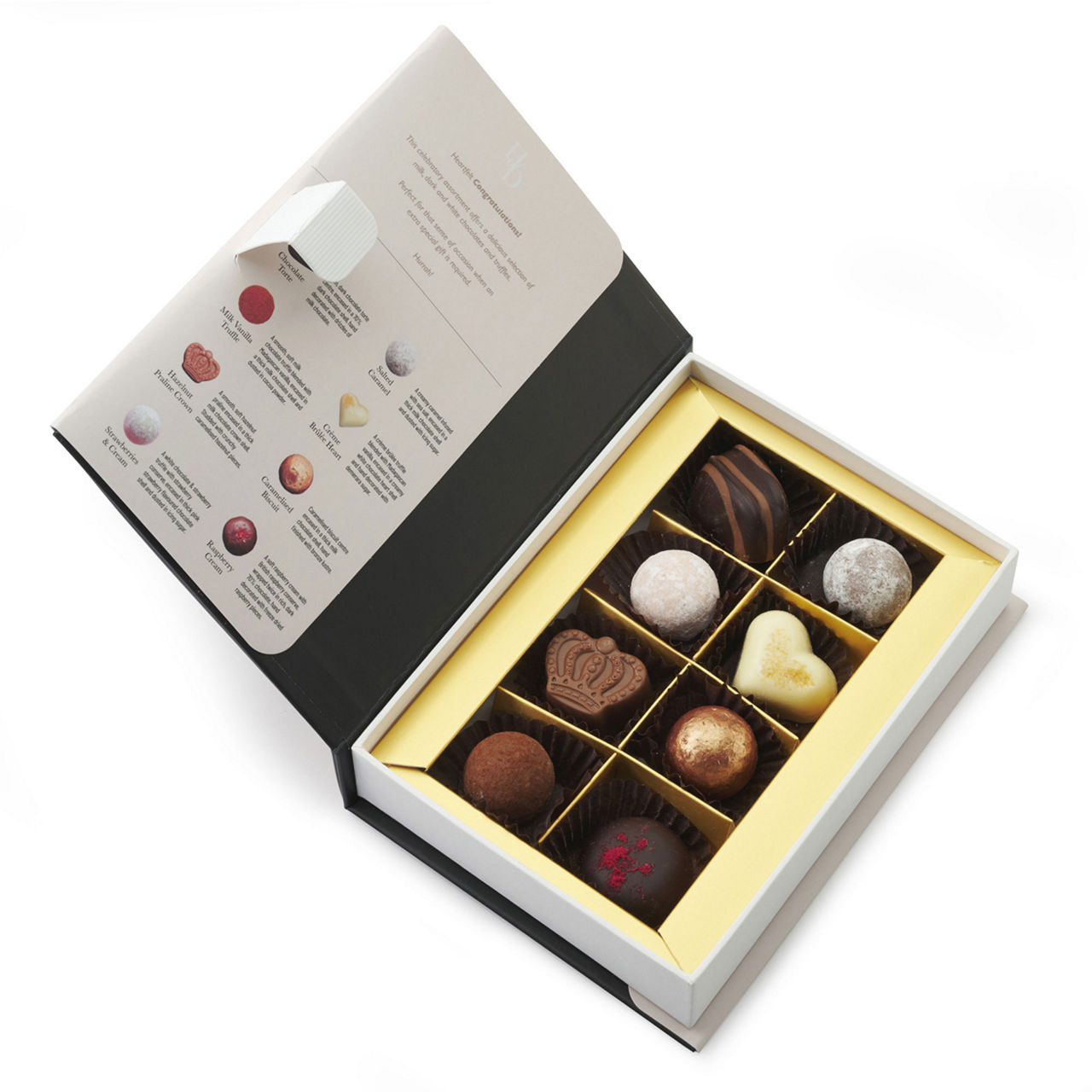 • A selection of milk, white and dark chocolates, eight chocolates in total, presented in a gift box