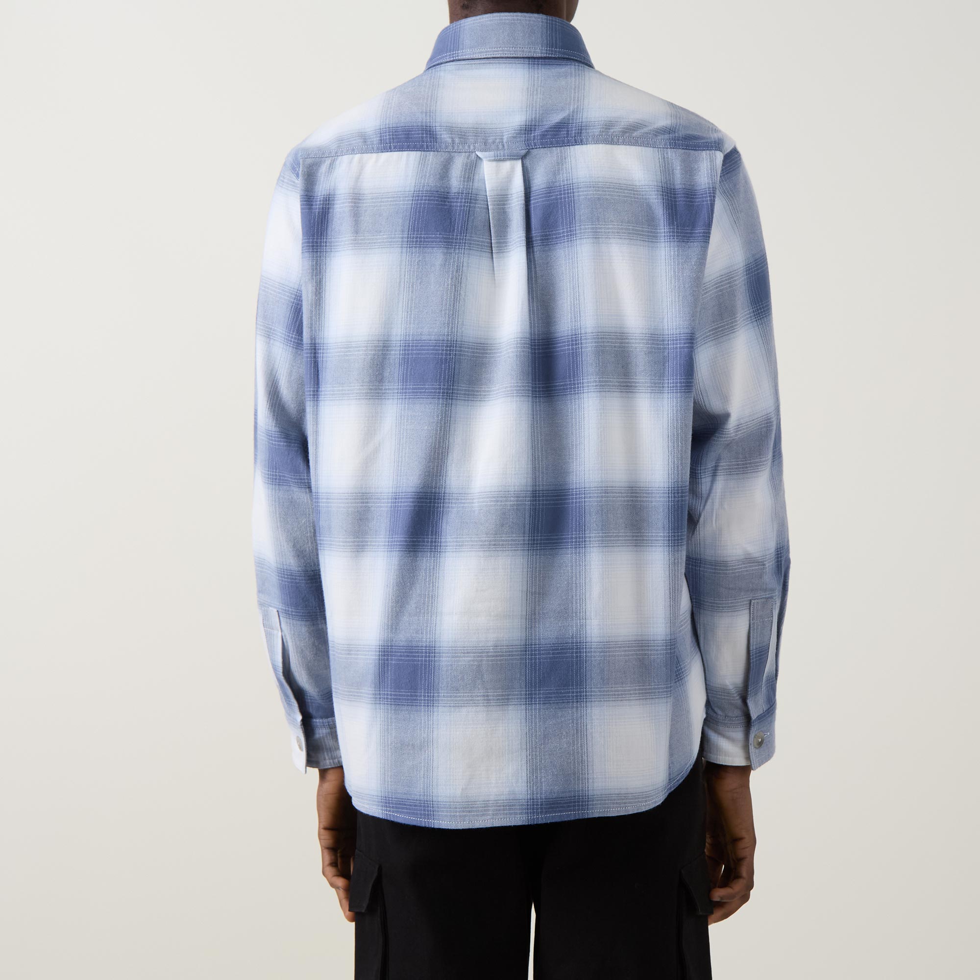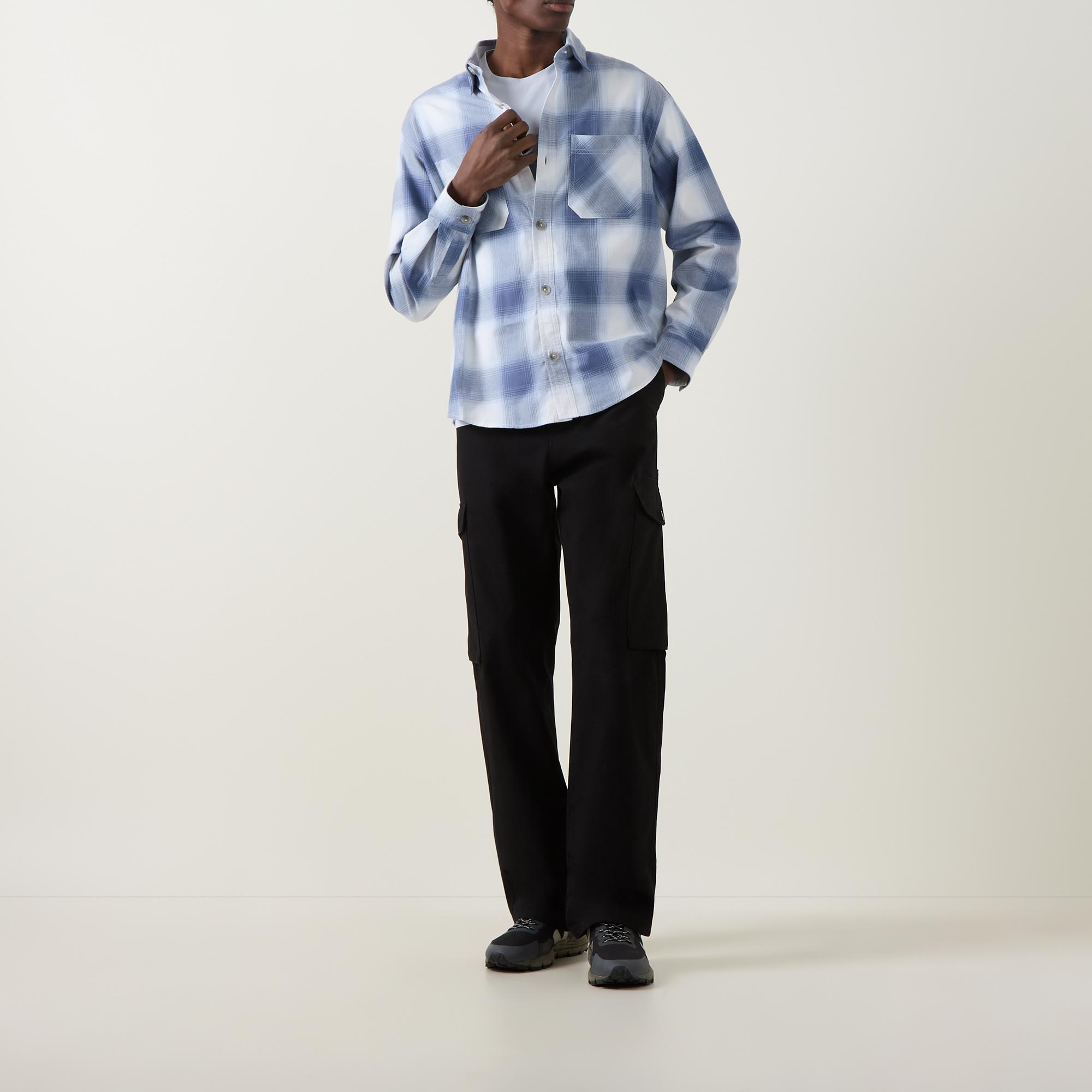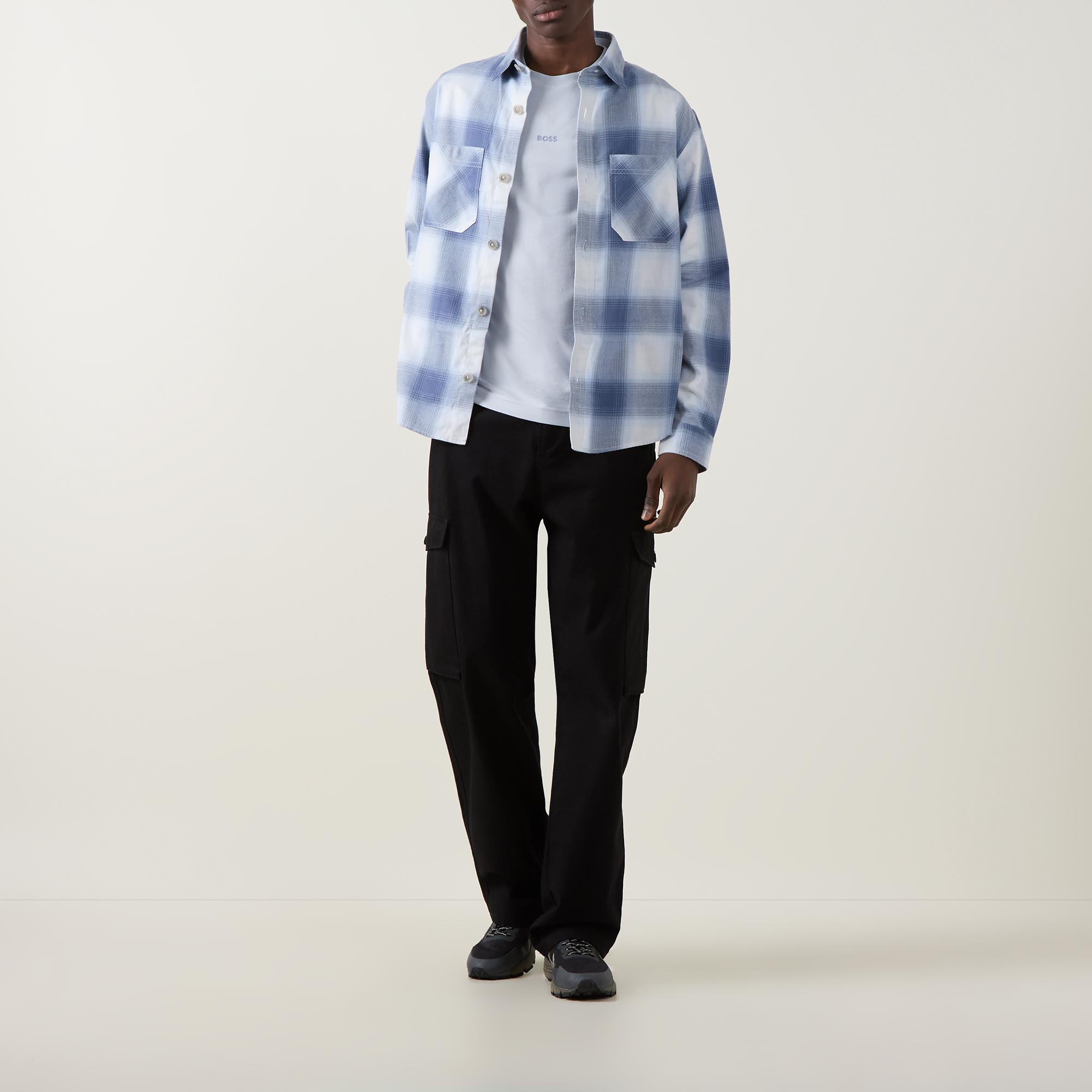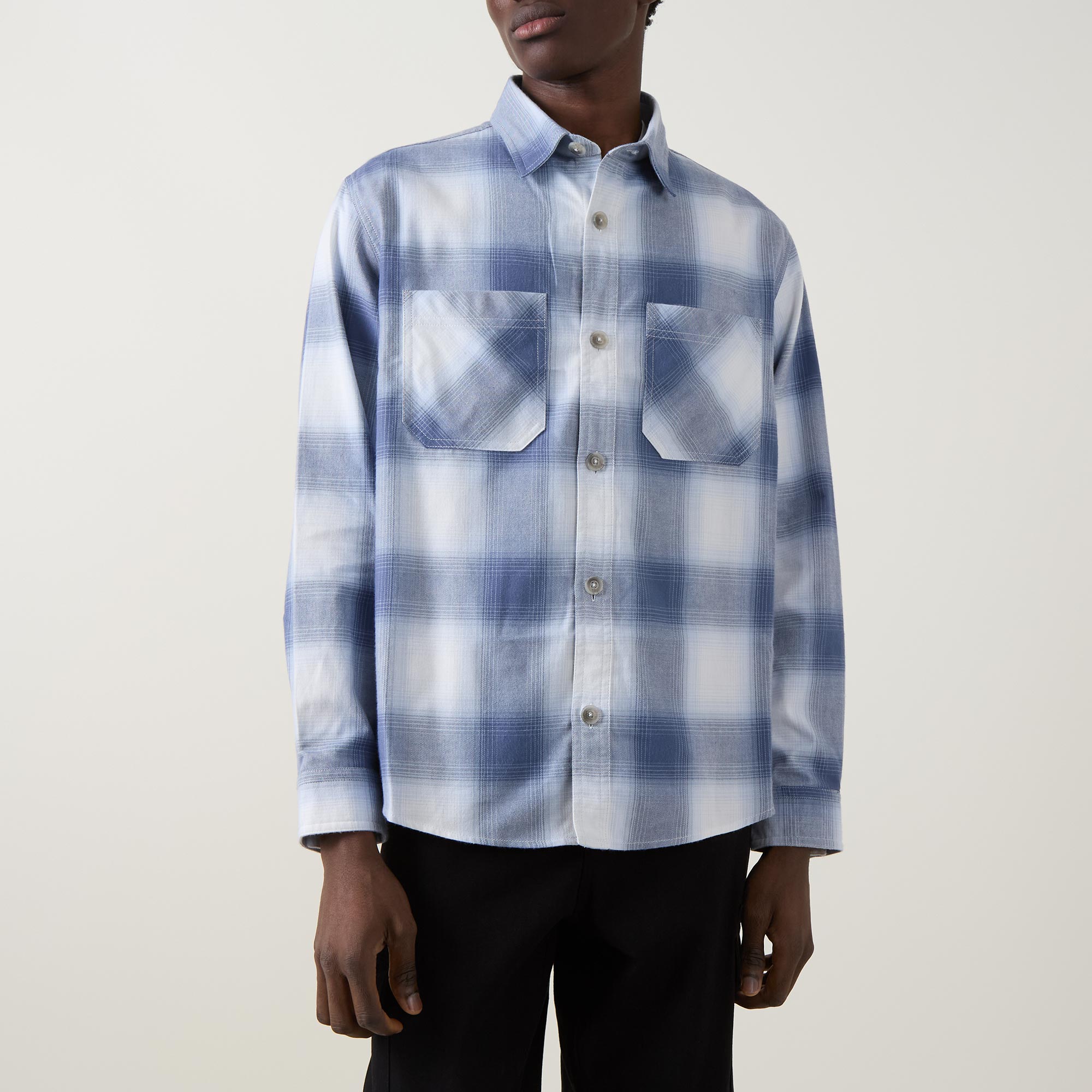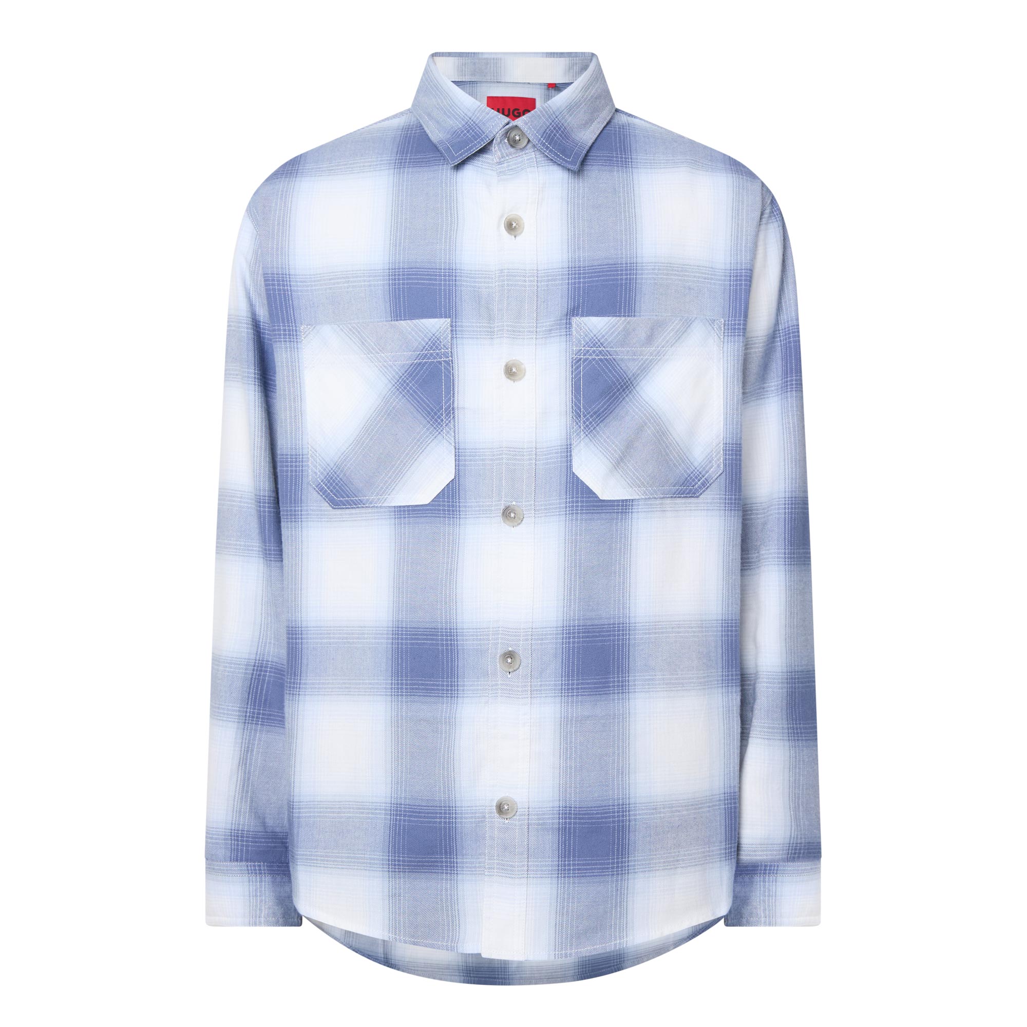 • Chest pockets, pointed collar, check pattern, button fastenings, curved hemline, long sleeves