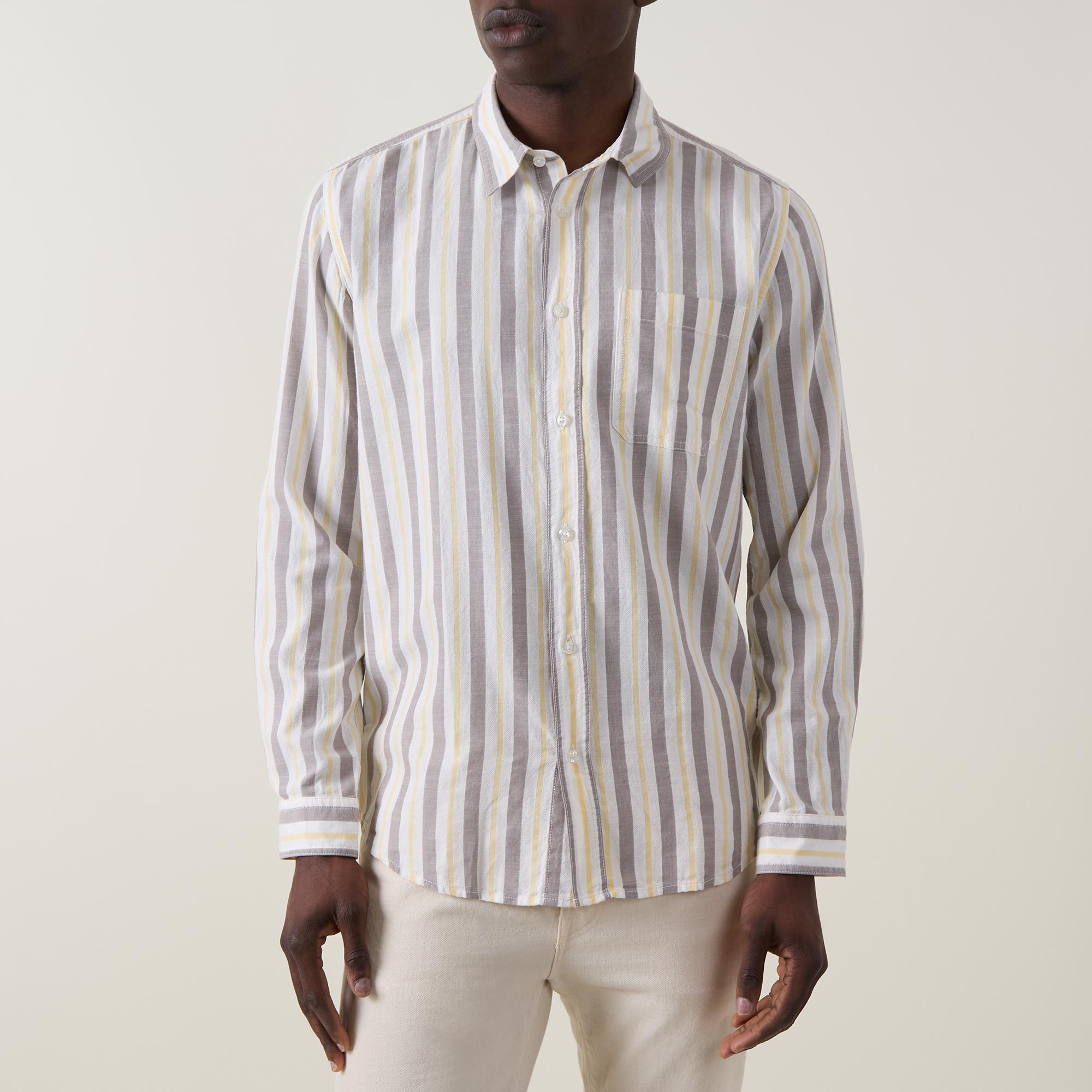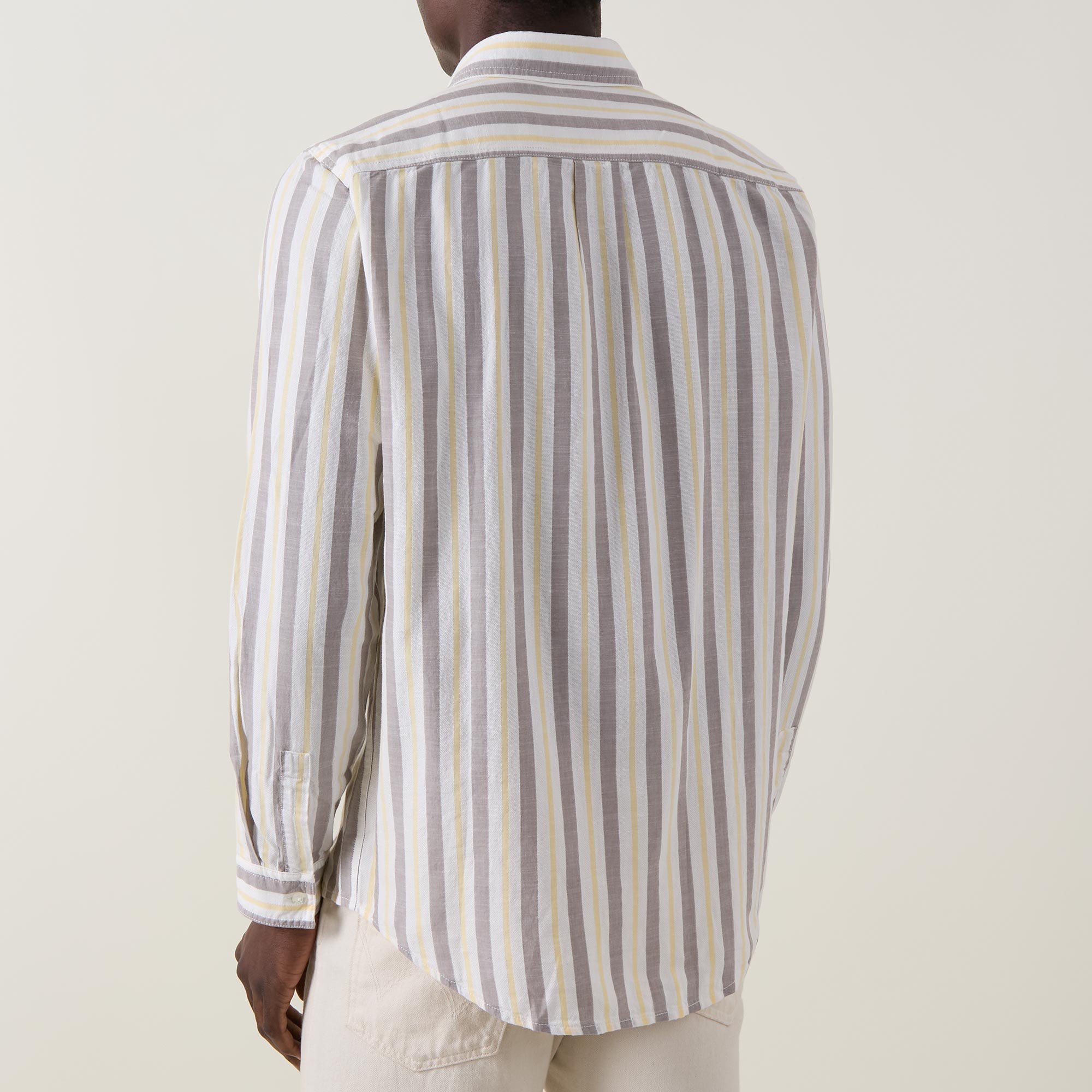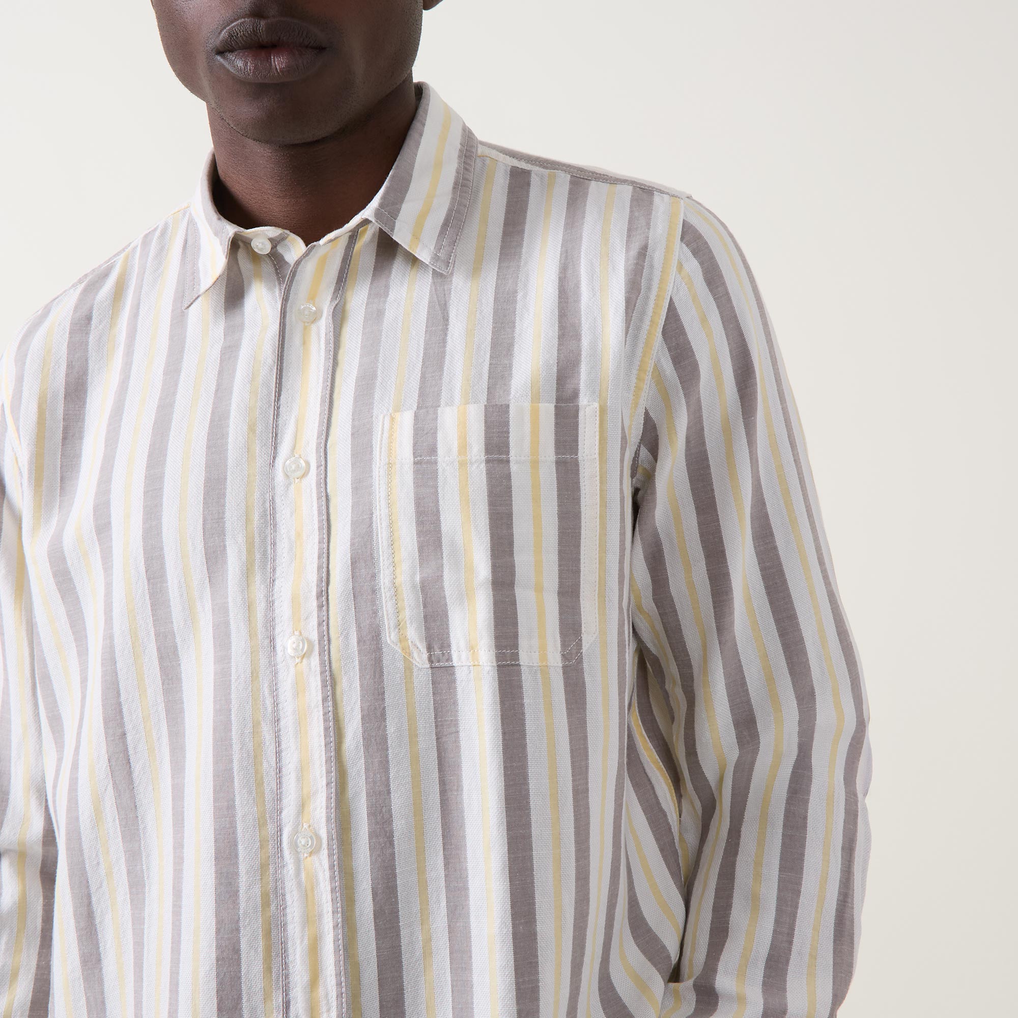 - Point collar, long sleeves, buttoned cuffs, front button fastening, one chest patch pocket, curved hem, rear box pleat, striped pattern