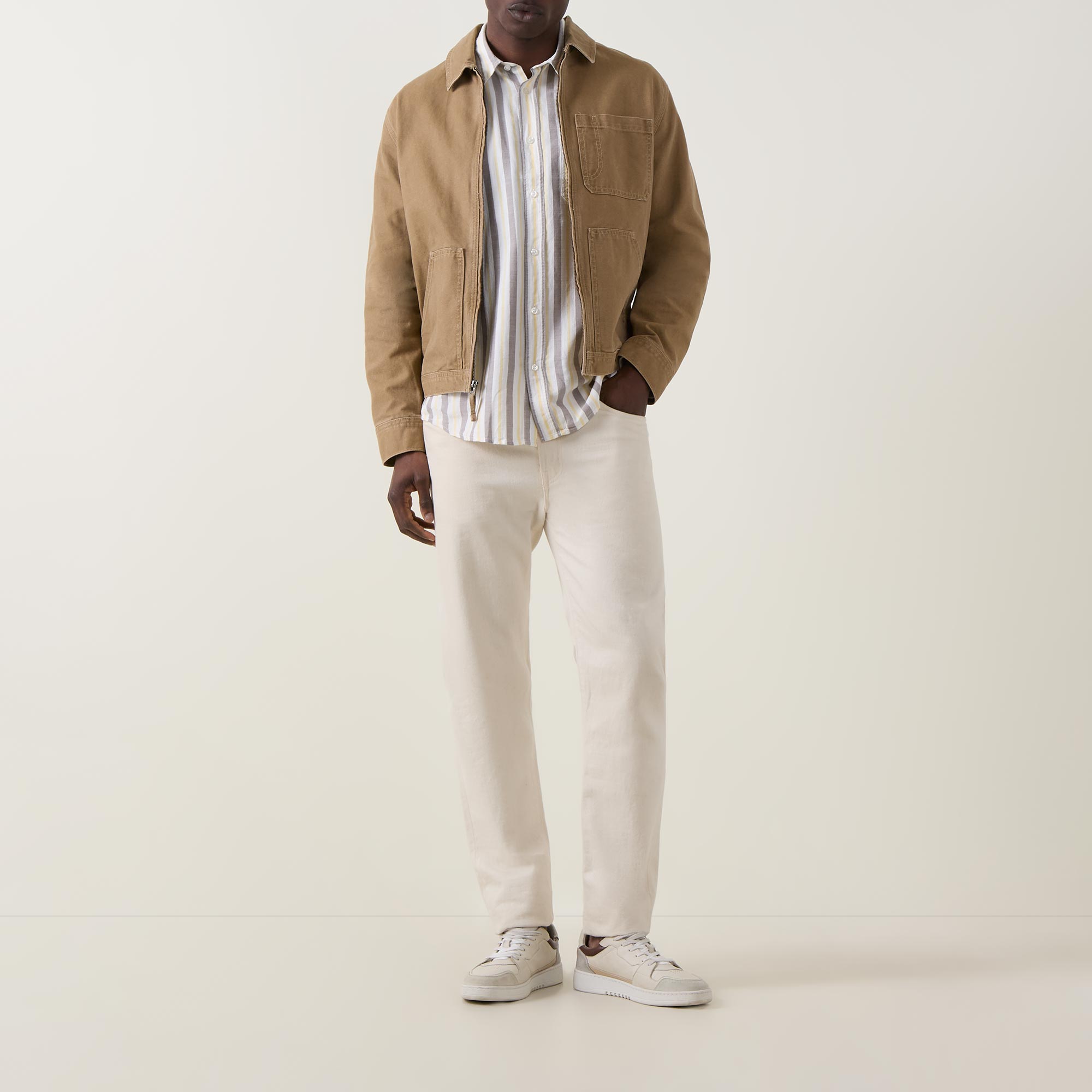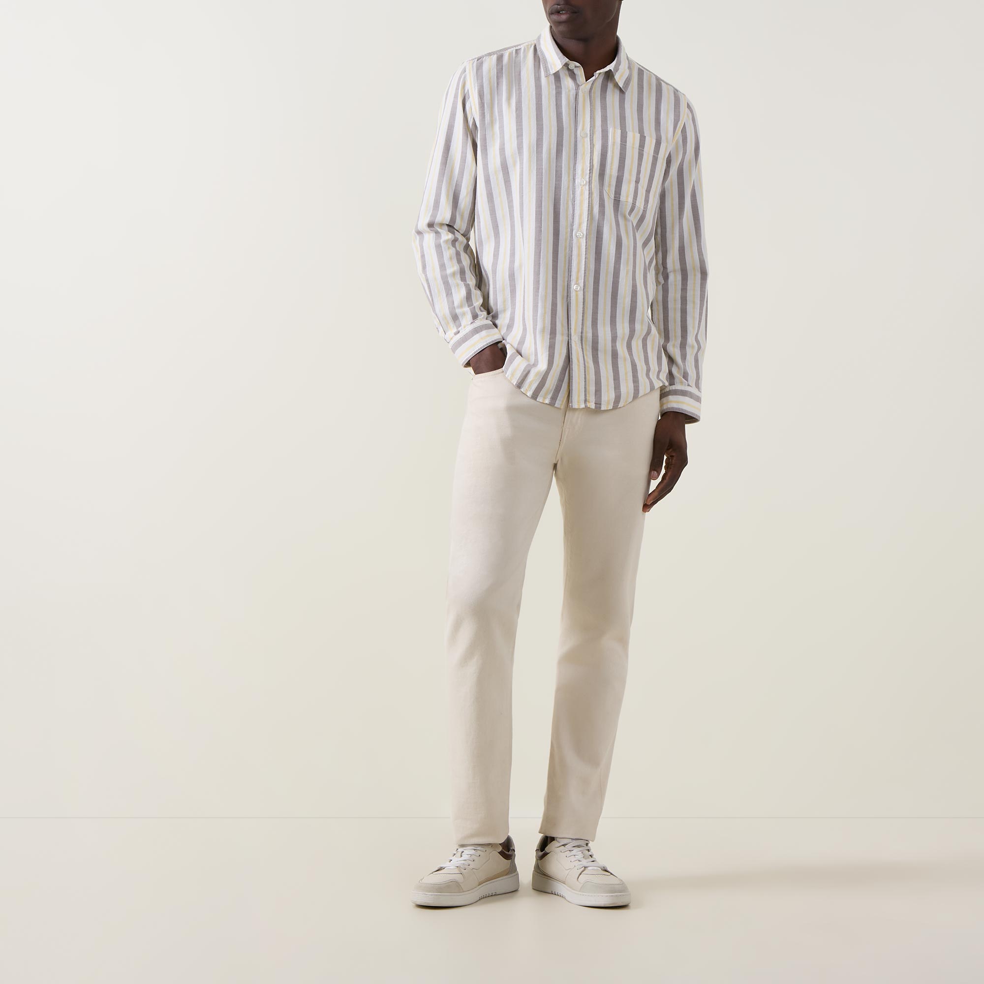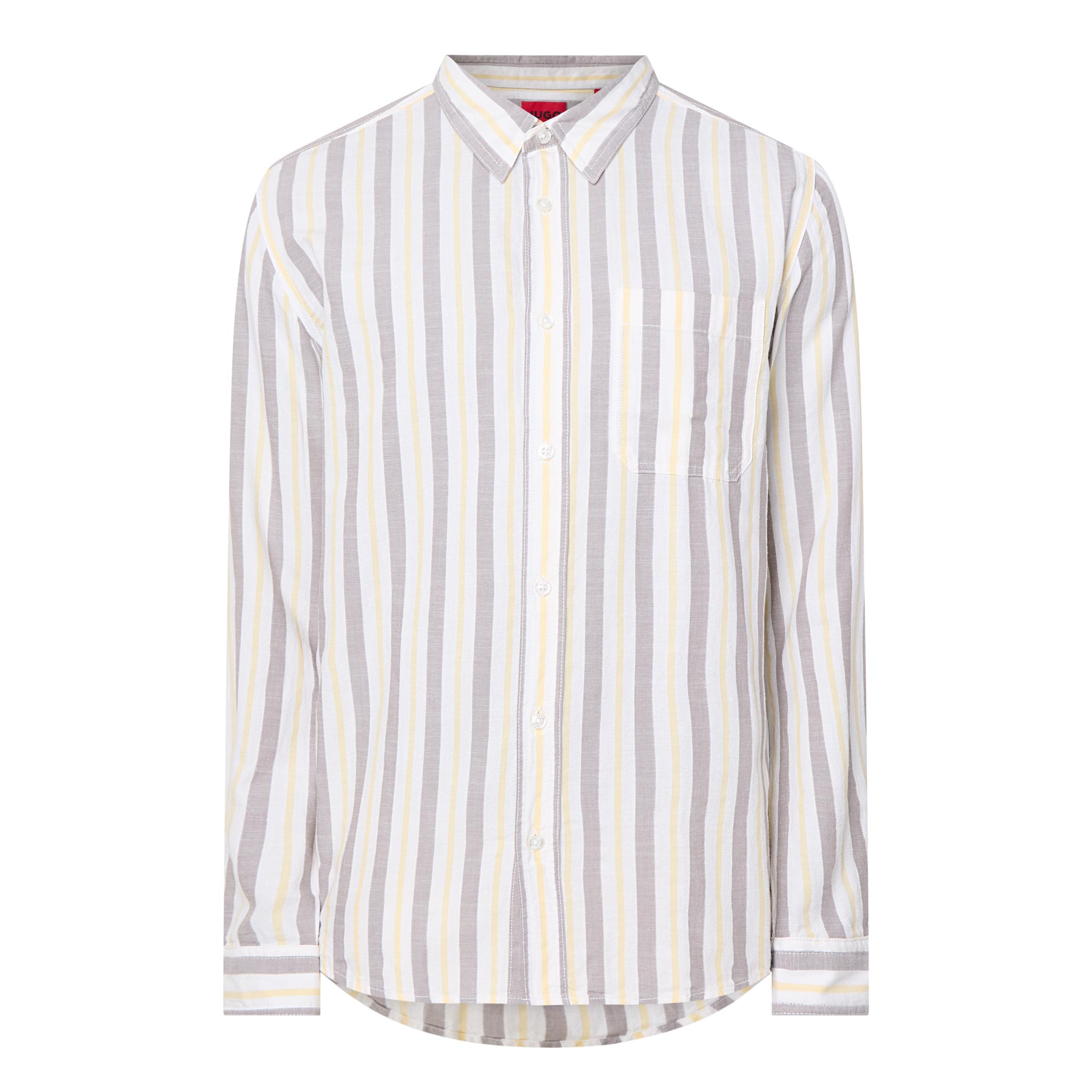 - Point collar, long sleeves, buttoned cuffs, front button fastening, one chest patch pocket, curved hem, rear box pleat, striped pattern