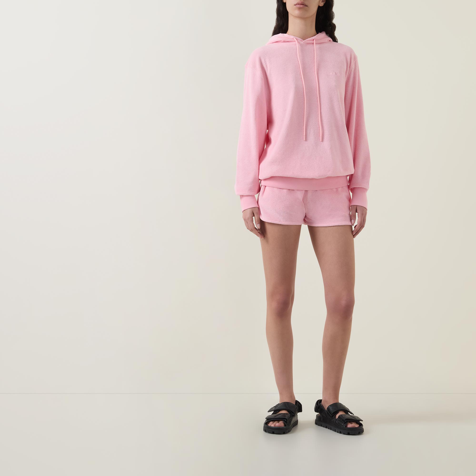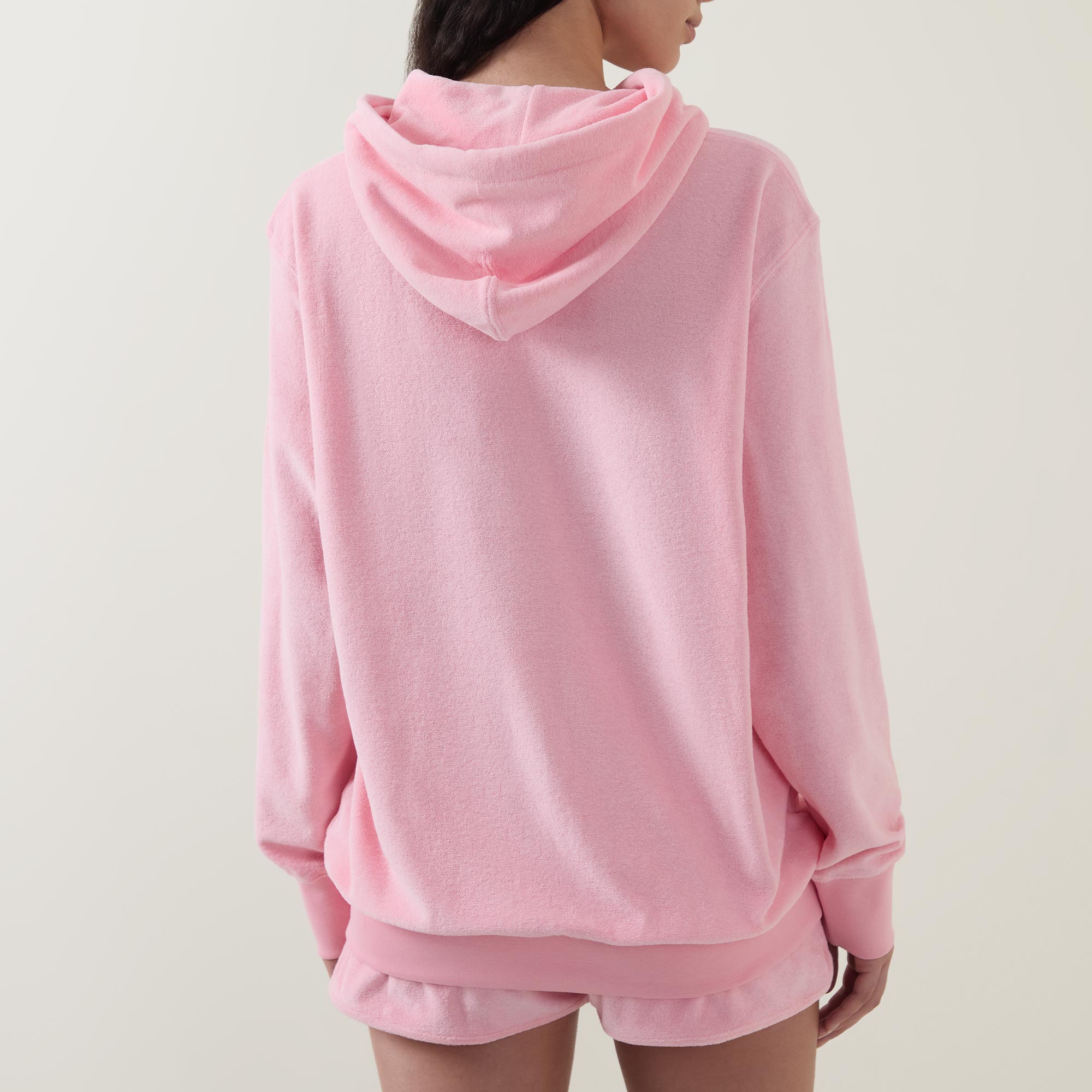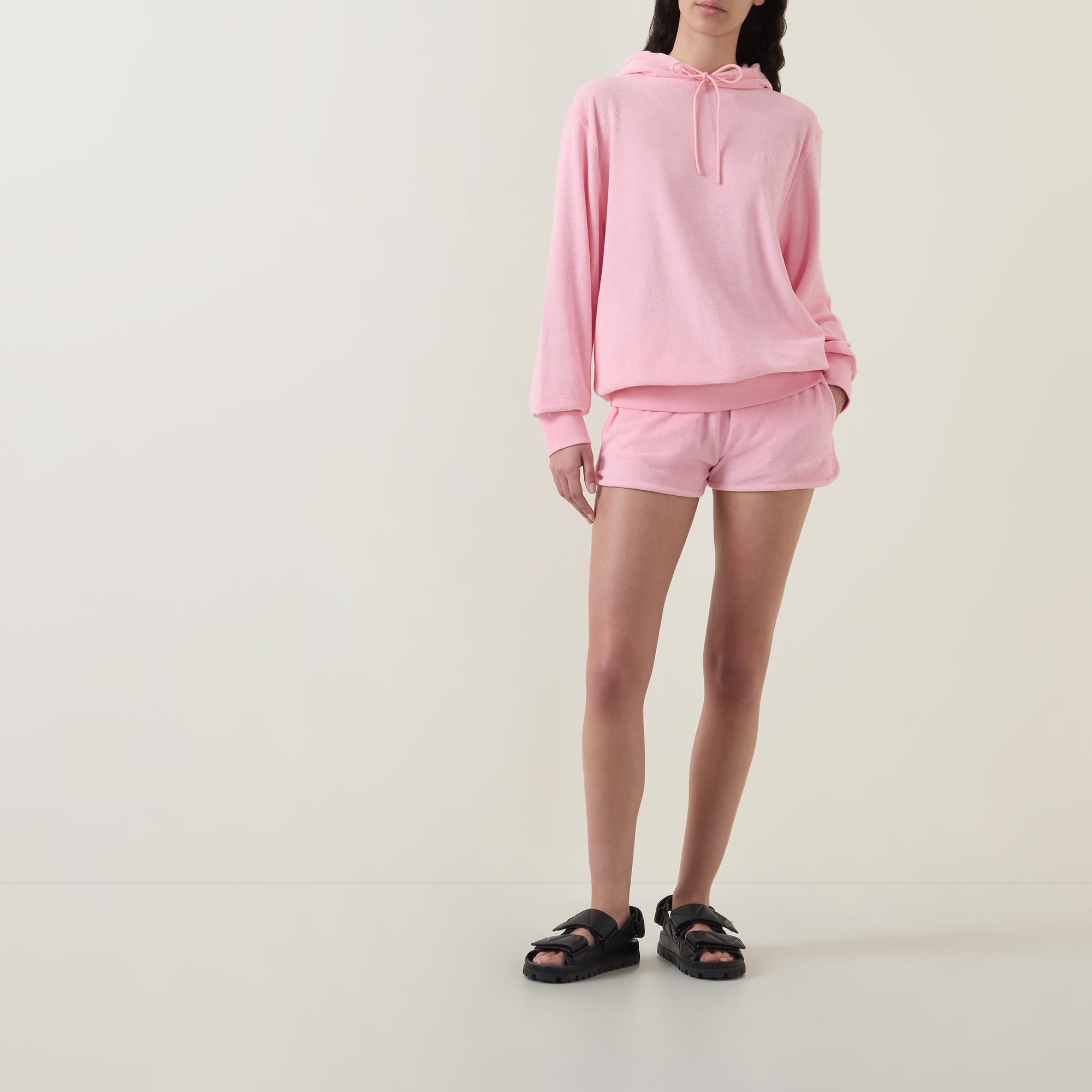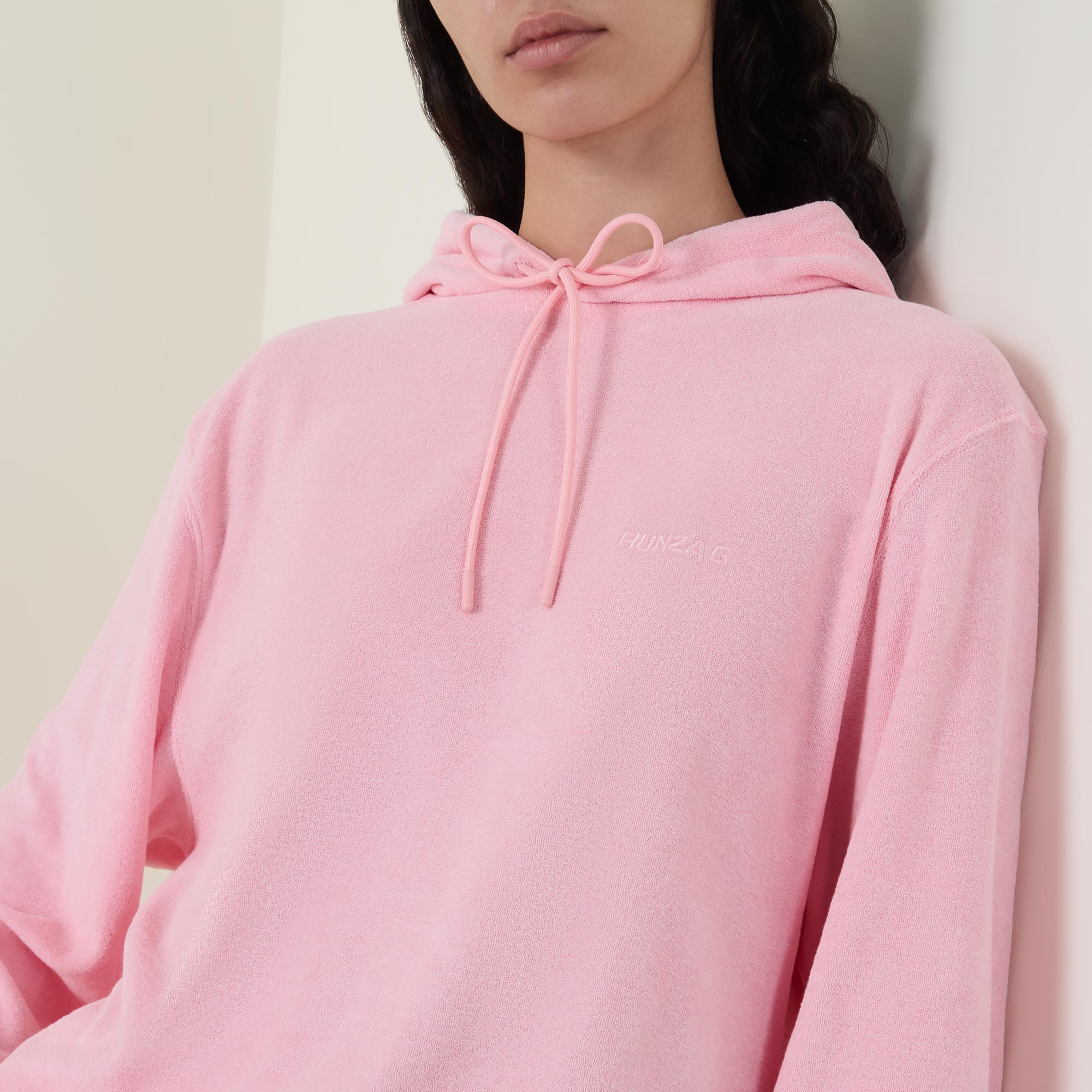 - Hood with drawstring adjustable fit, ribbed trims, dropped shoulders, long sleeves, terry towelling fabric, embroidered logo details