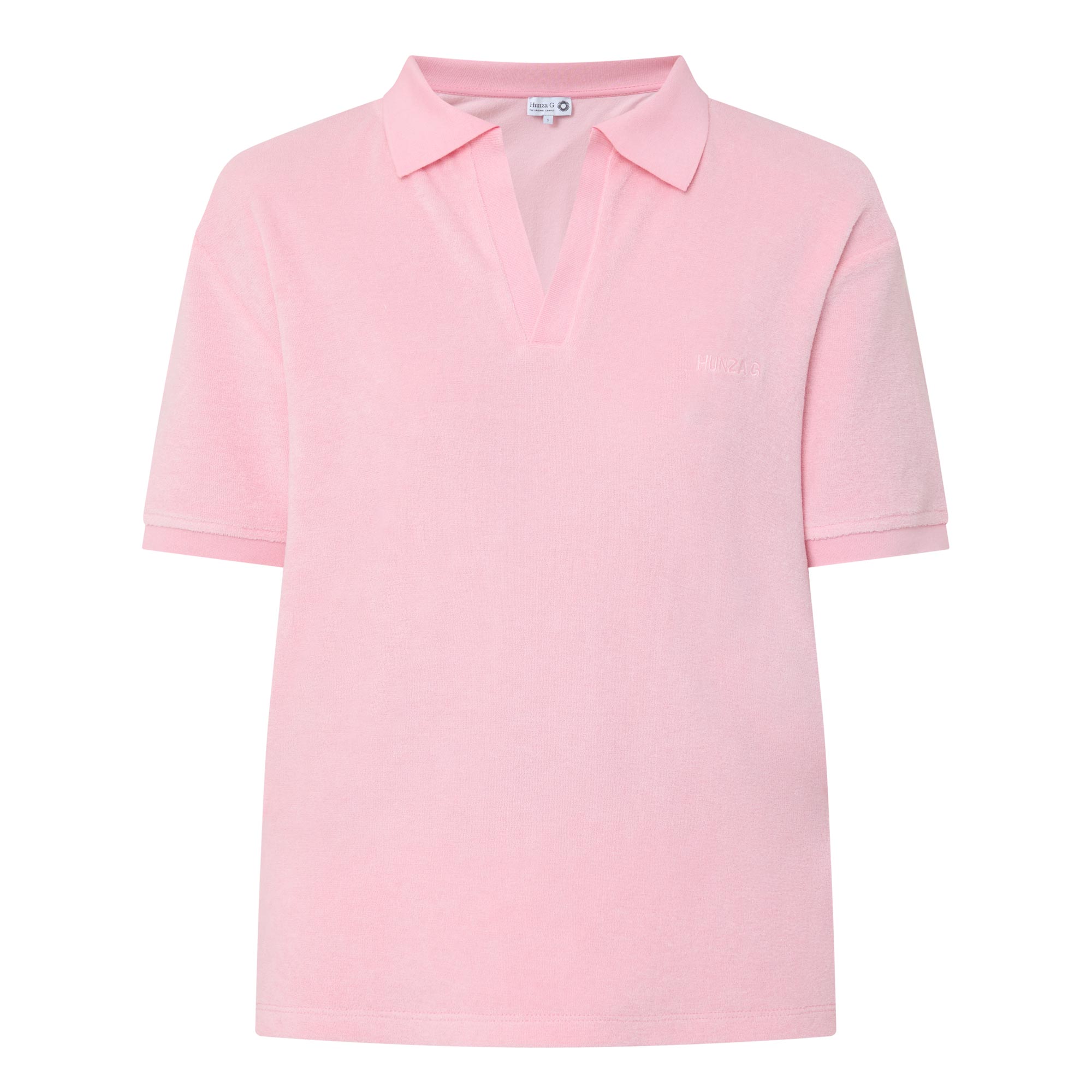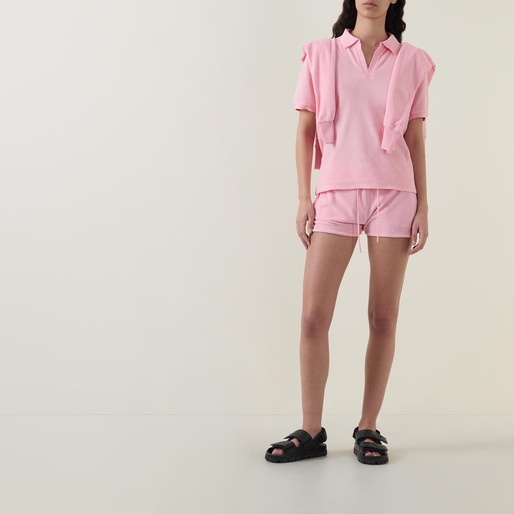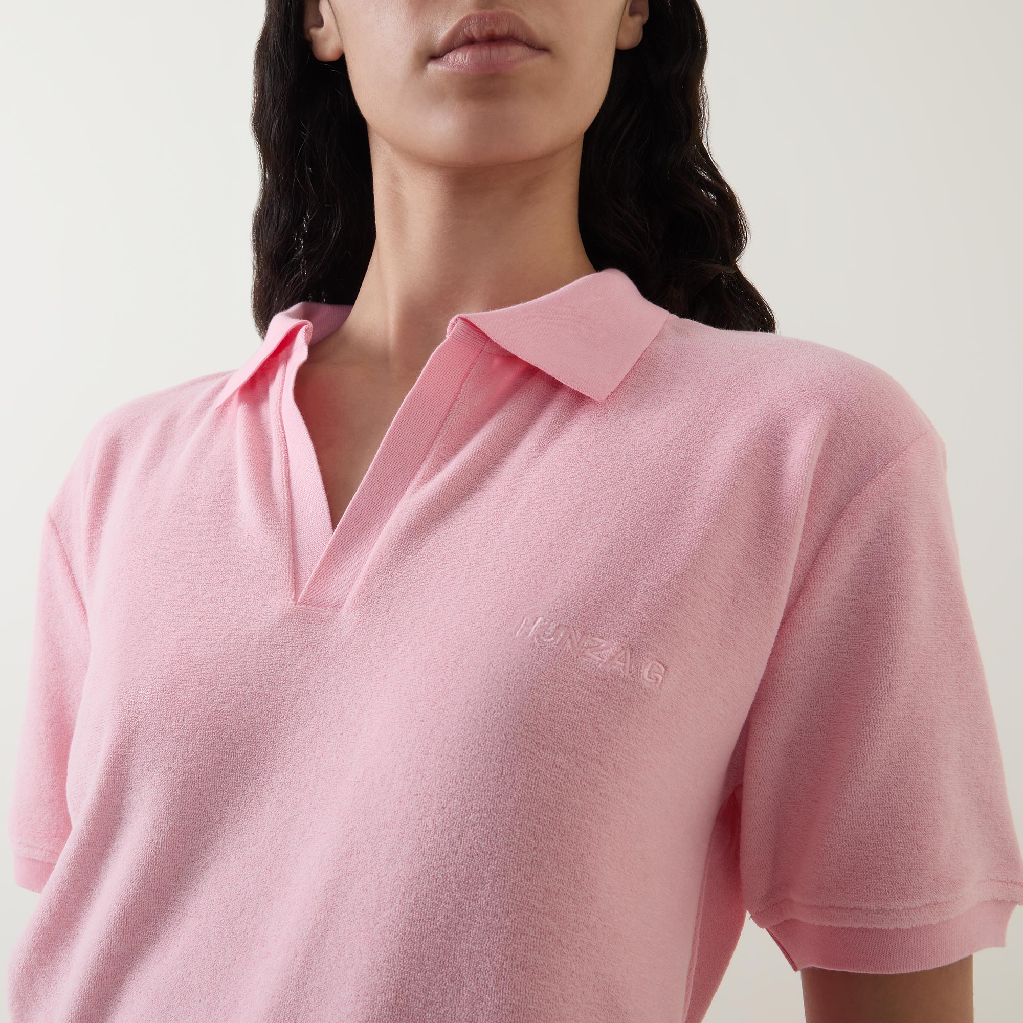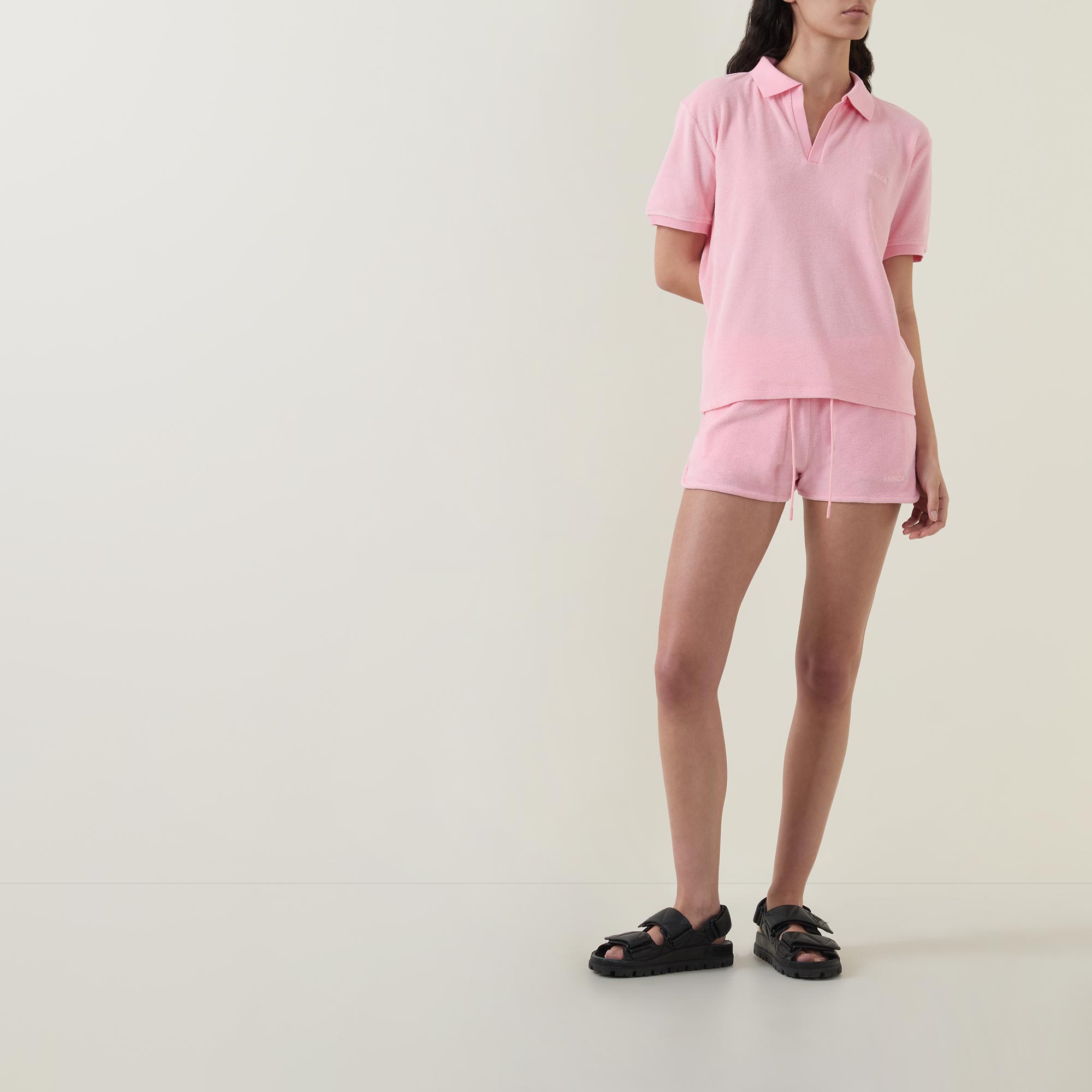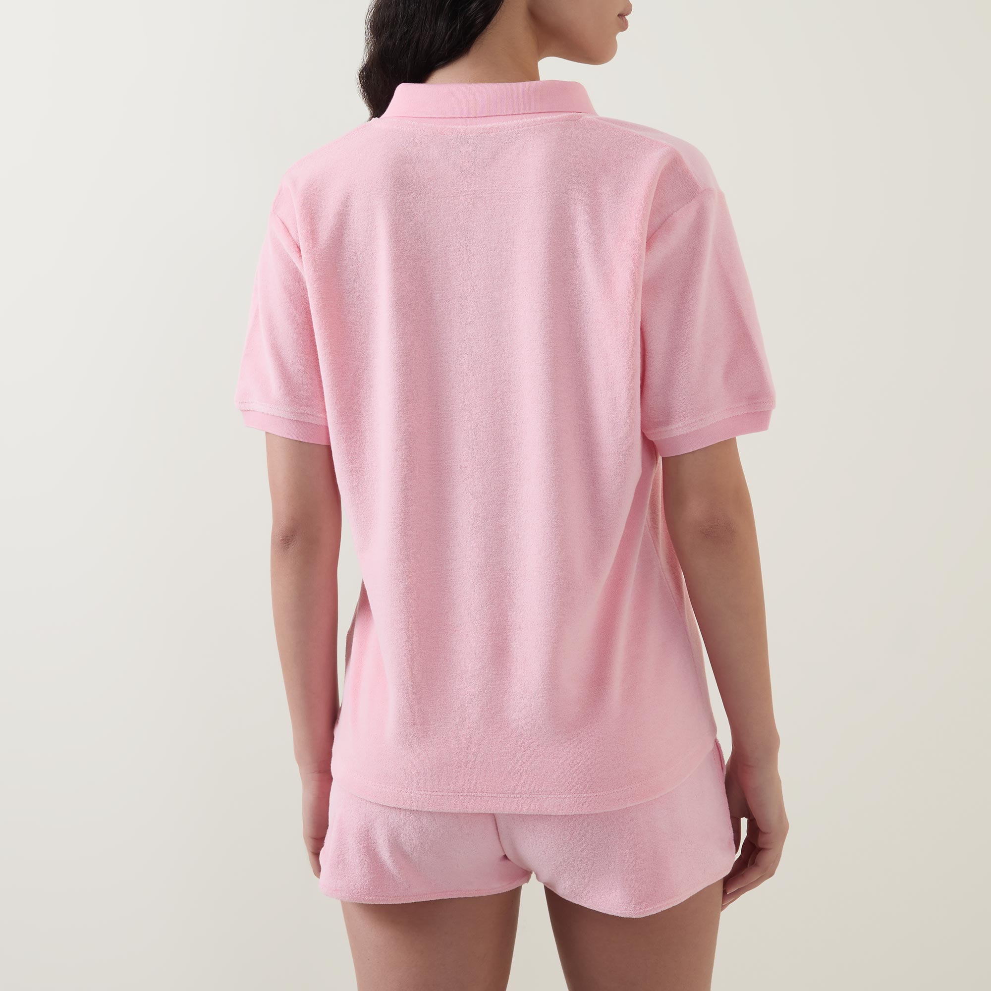 - Flat collar, open neckline, short sleeves, lightweight, embroidered logo details, terry towelling fabric