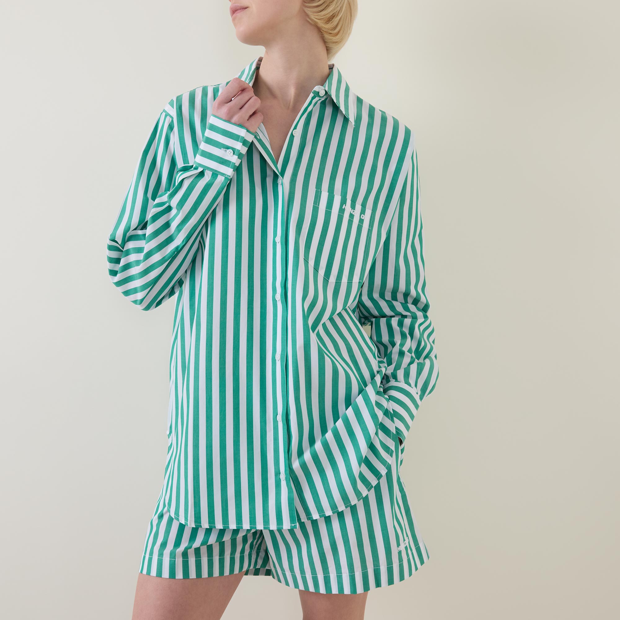 • Classic collar, button fastening, long sleeves, buttoned cuffs, stripe pattern, curved hemline, box pleat at rear, chest pocket, embroidered logo detail