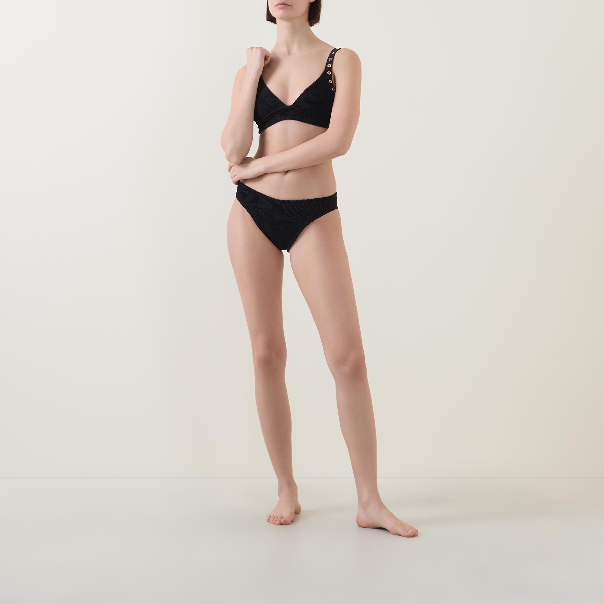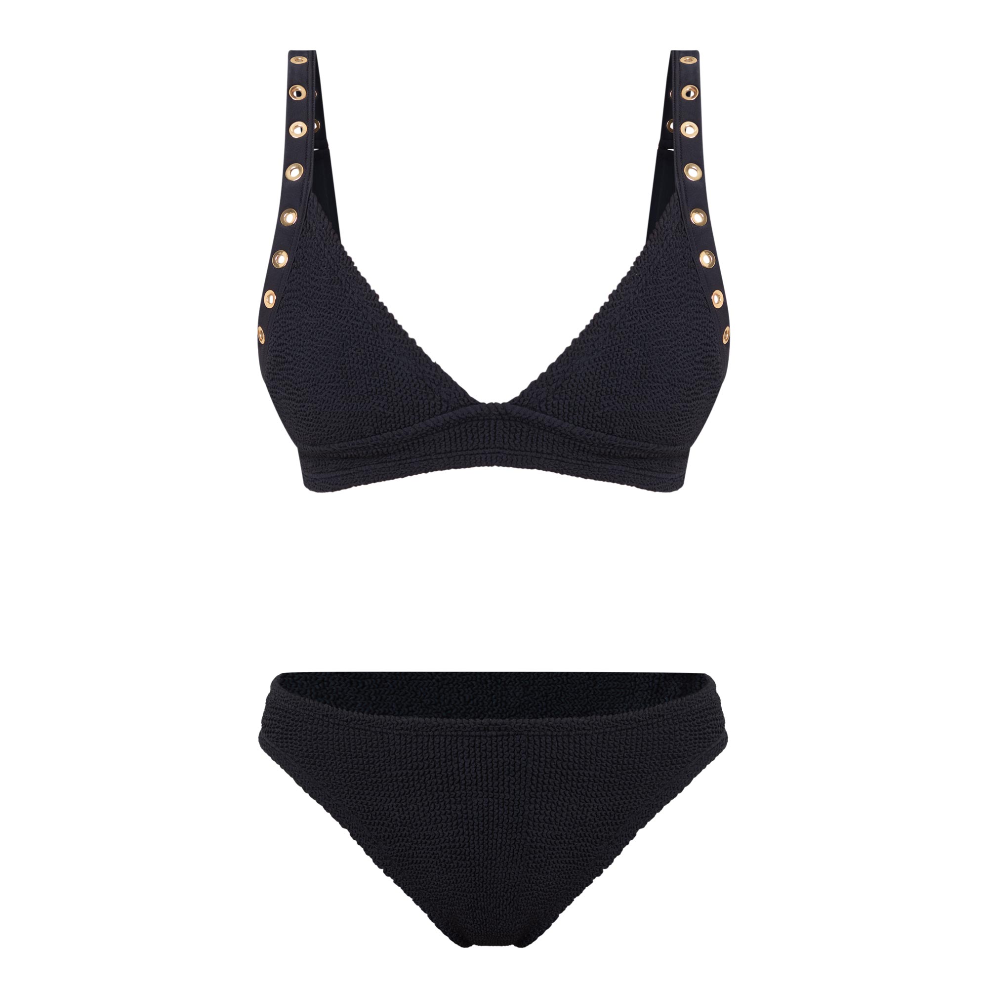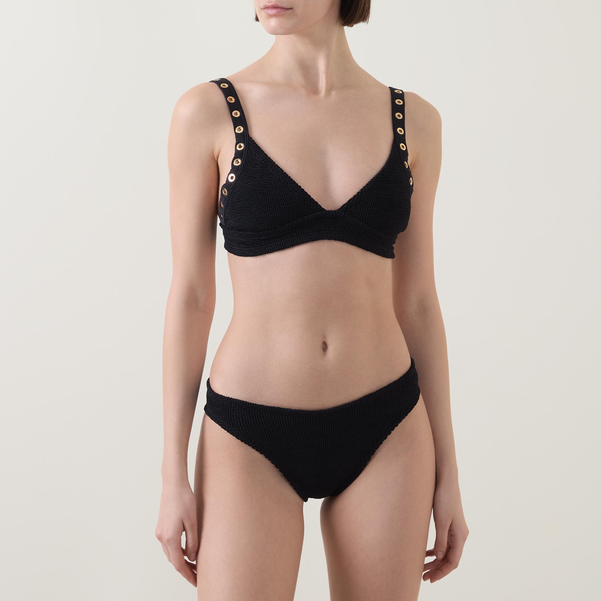 - Top: Adjustable straps with gold-tone eyelet details, triangle cups, signature crinkle fabric. Bottoms: Mid-rise, moderate rear coverage, signature crinkle fabric