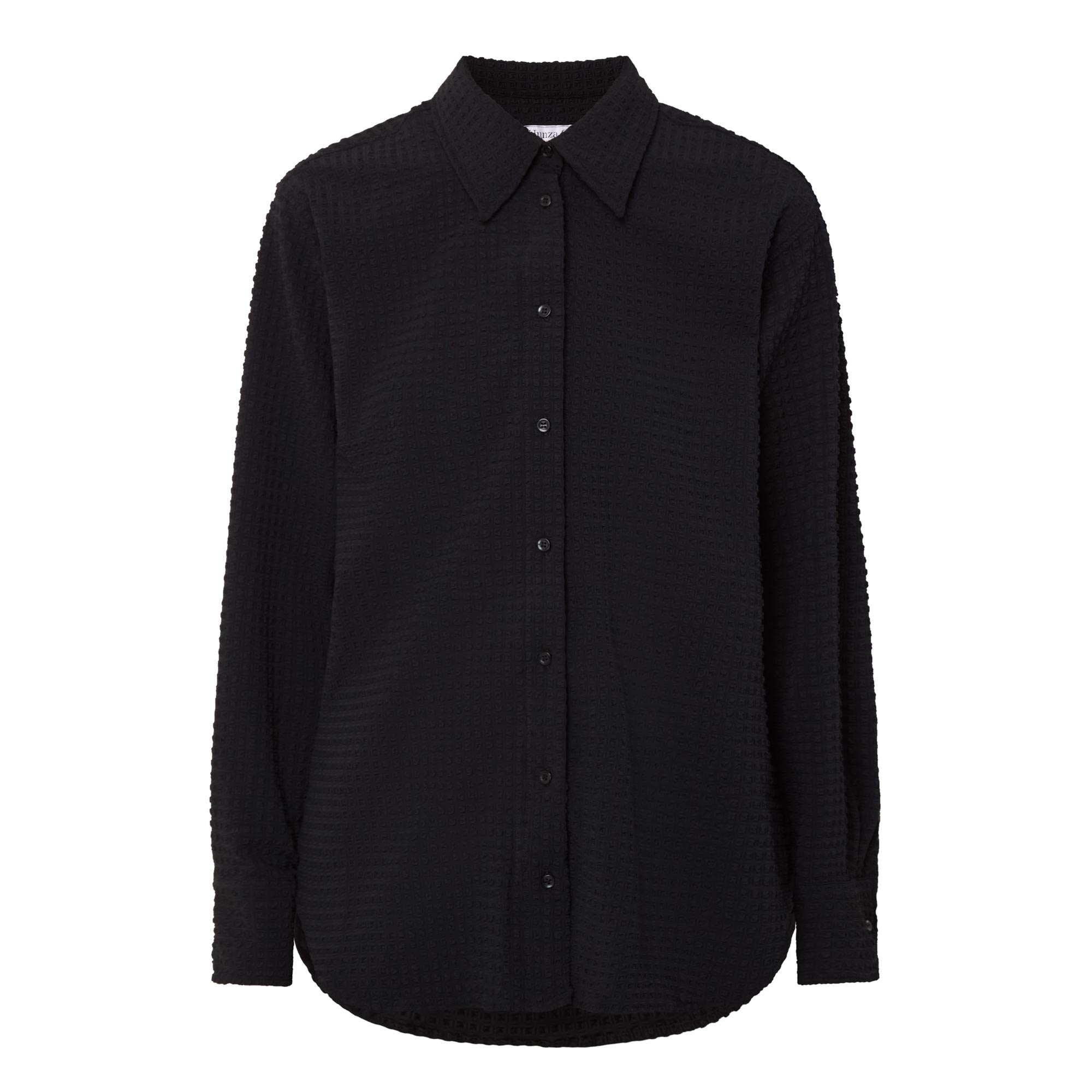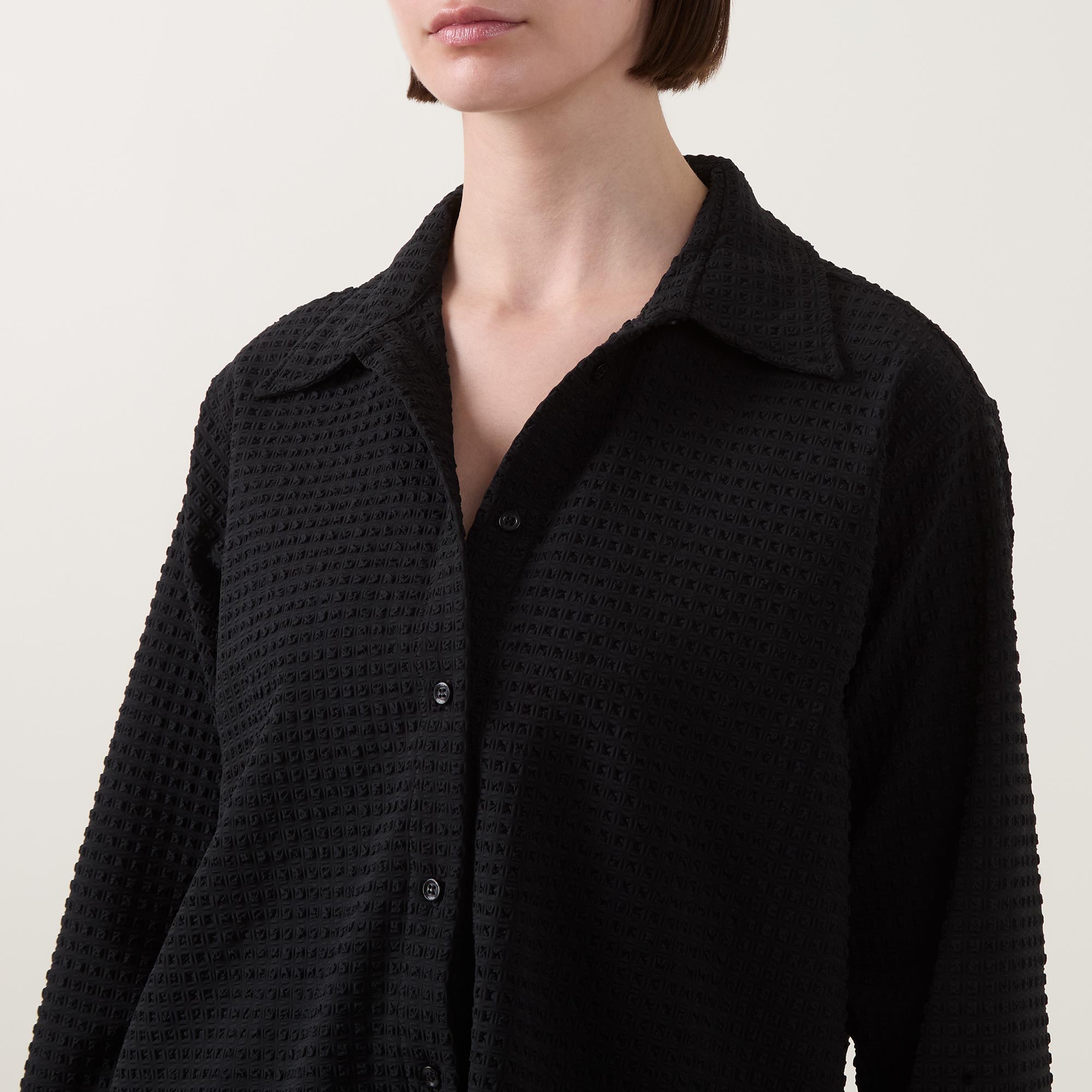 - Point collar, long sleeves, dropped shoulders, front button placket, single-button cuffs, back box pleat, textured finish