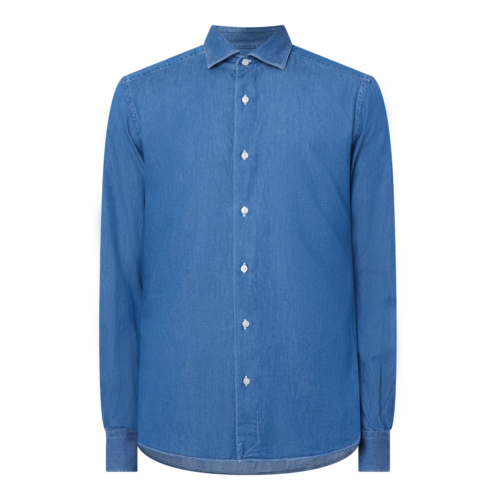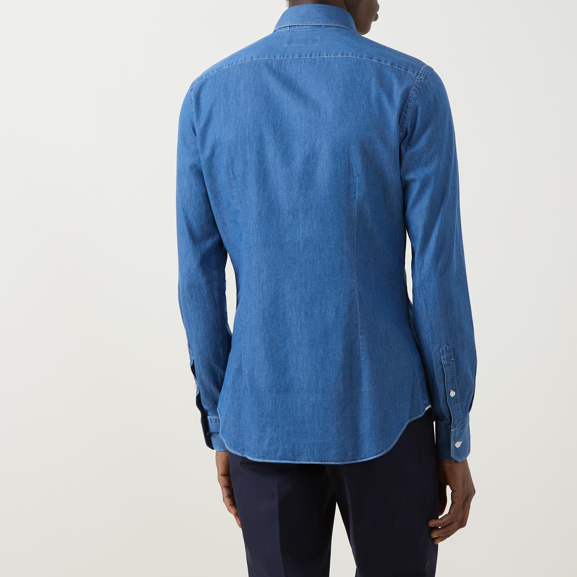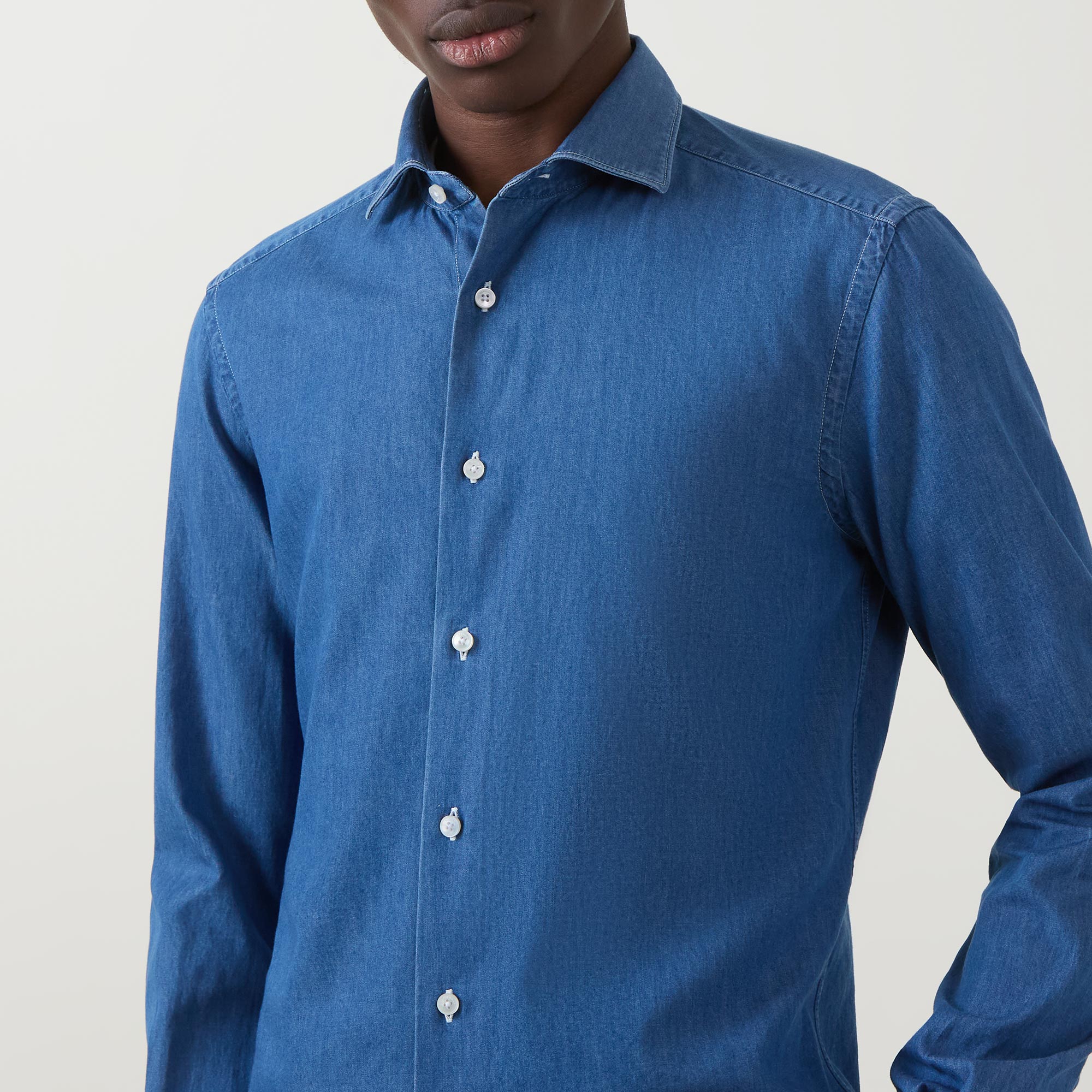 - Point collar, long sleeves, buttoned cuffs, front button placket, curved hem, tonal stitching, mid wash finish
