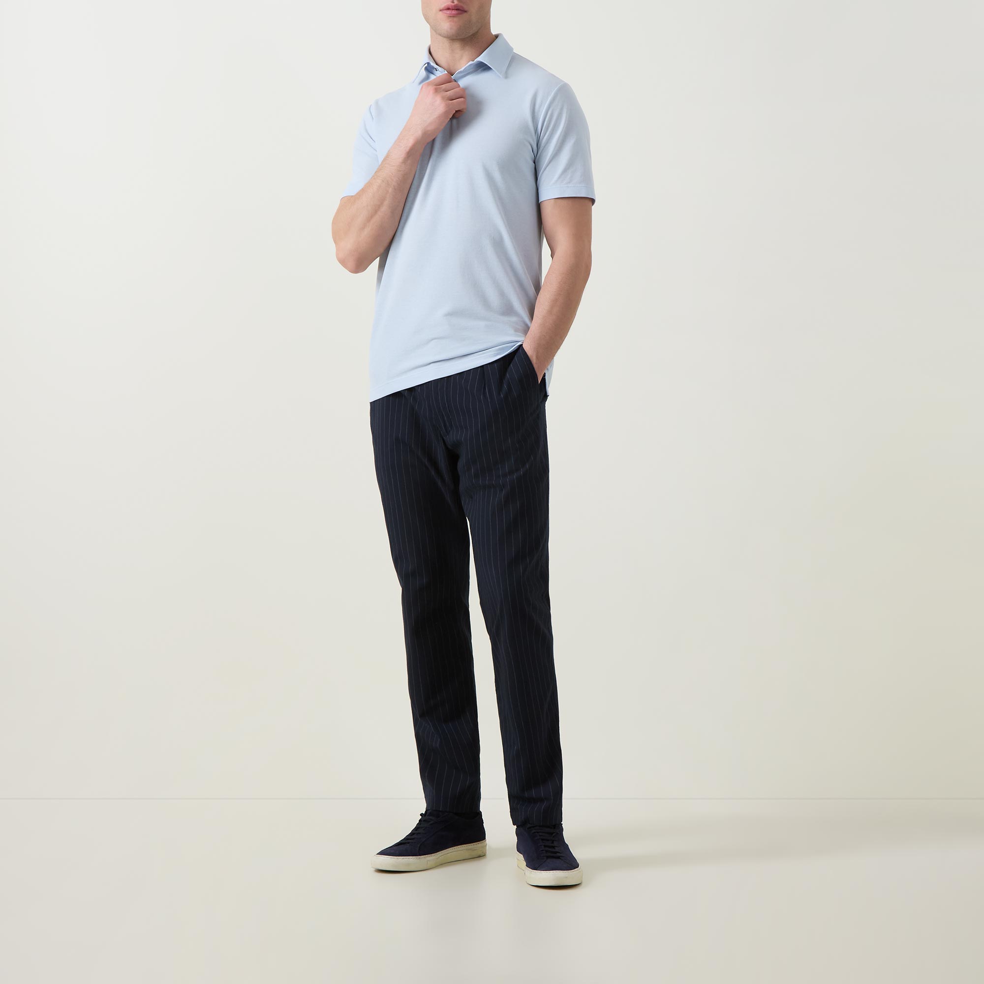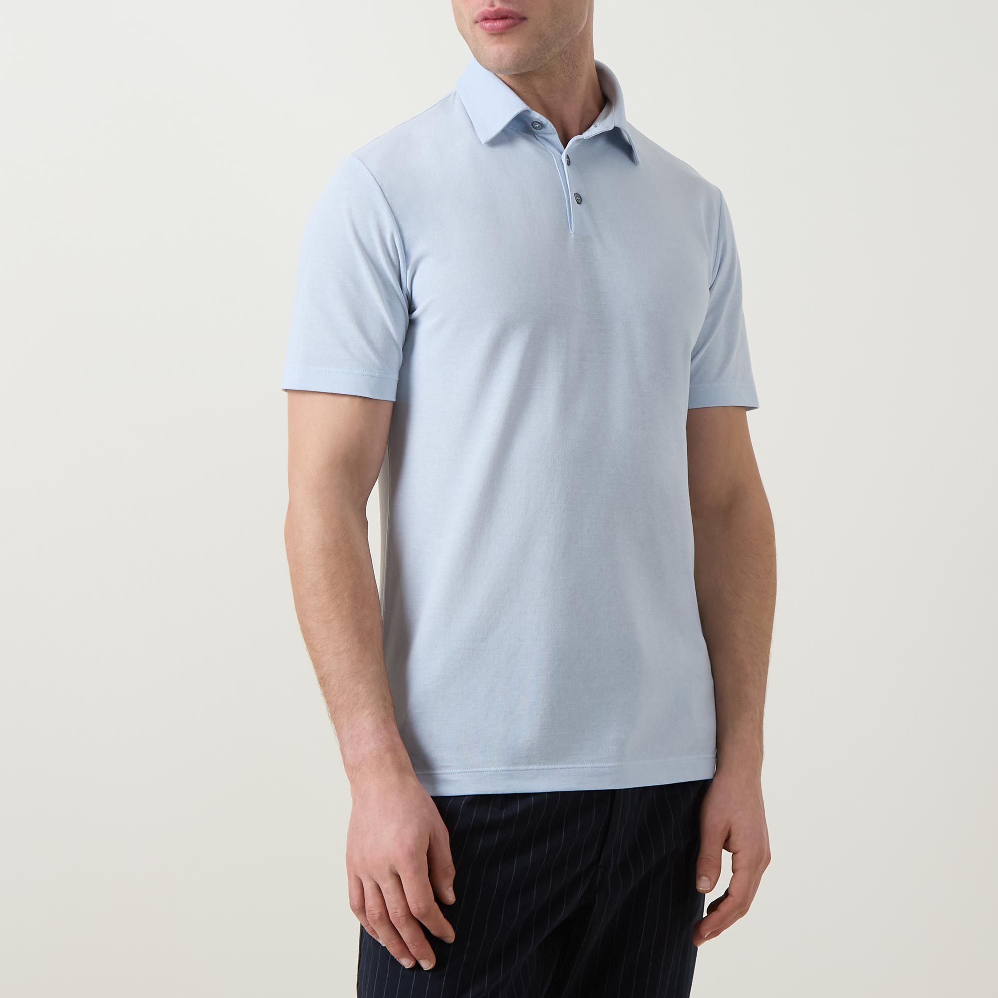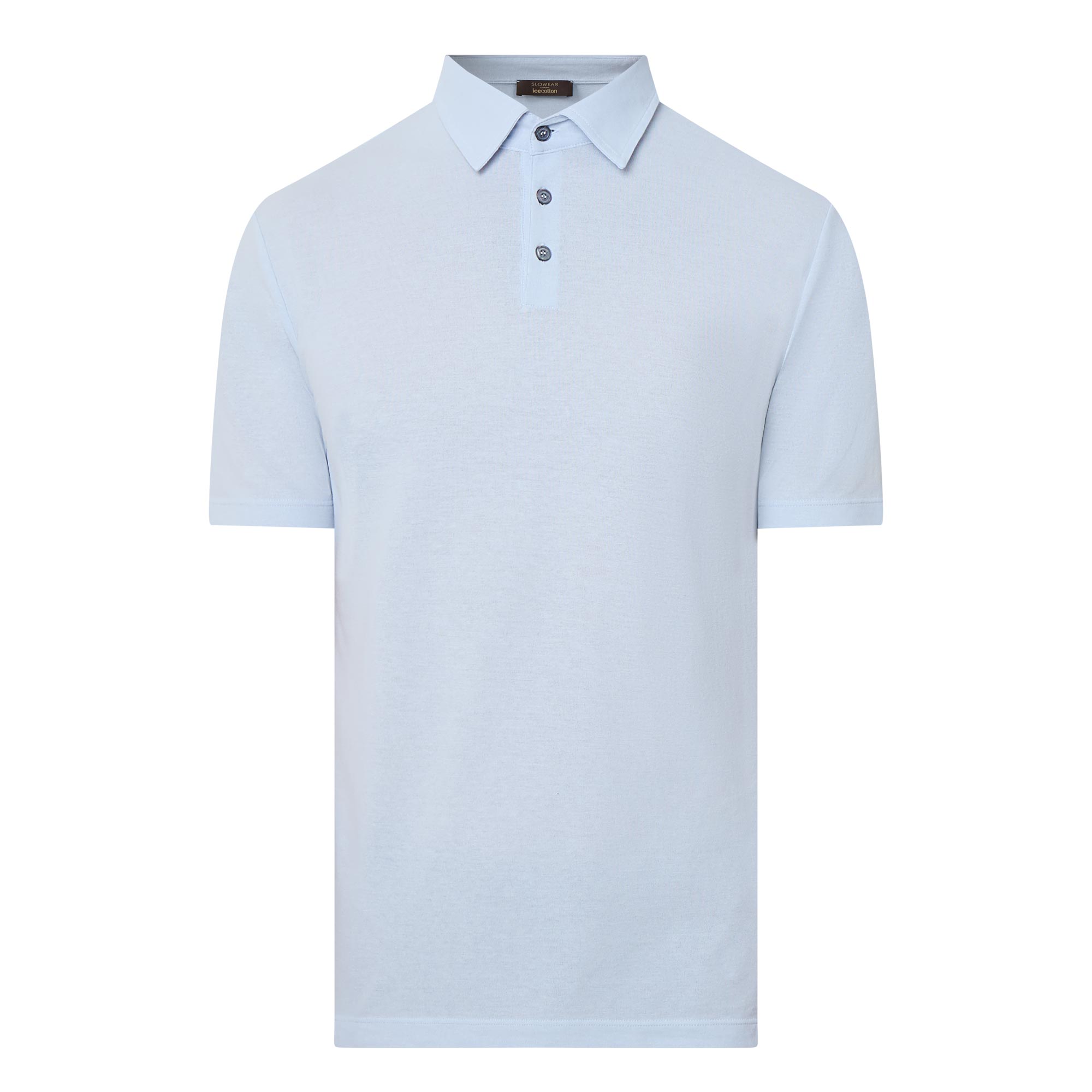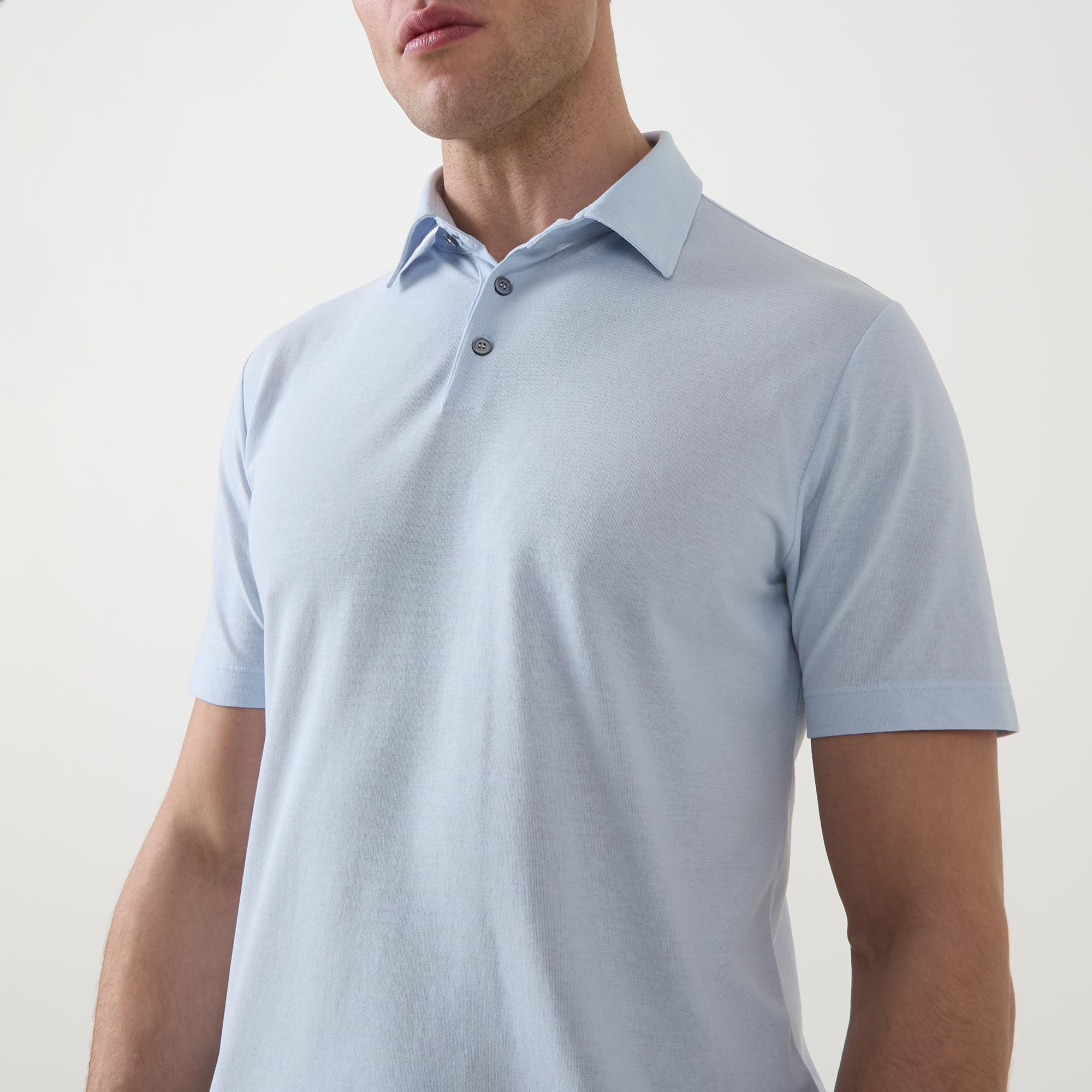 - Polo collar, short sleeves, three-button placket, tonal stitching, straight hemline, smooth fabric