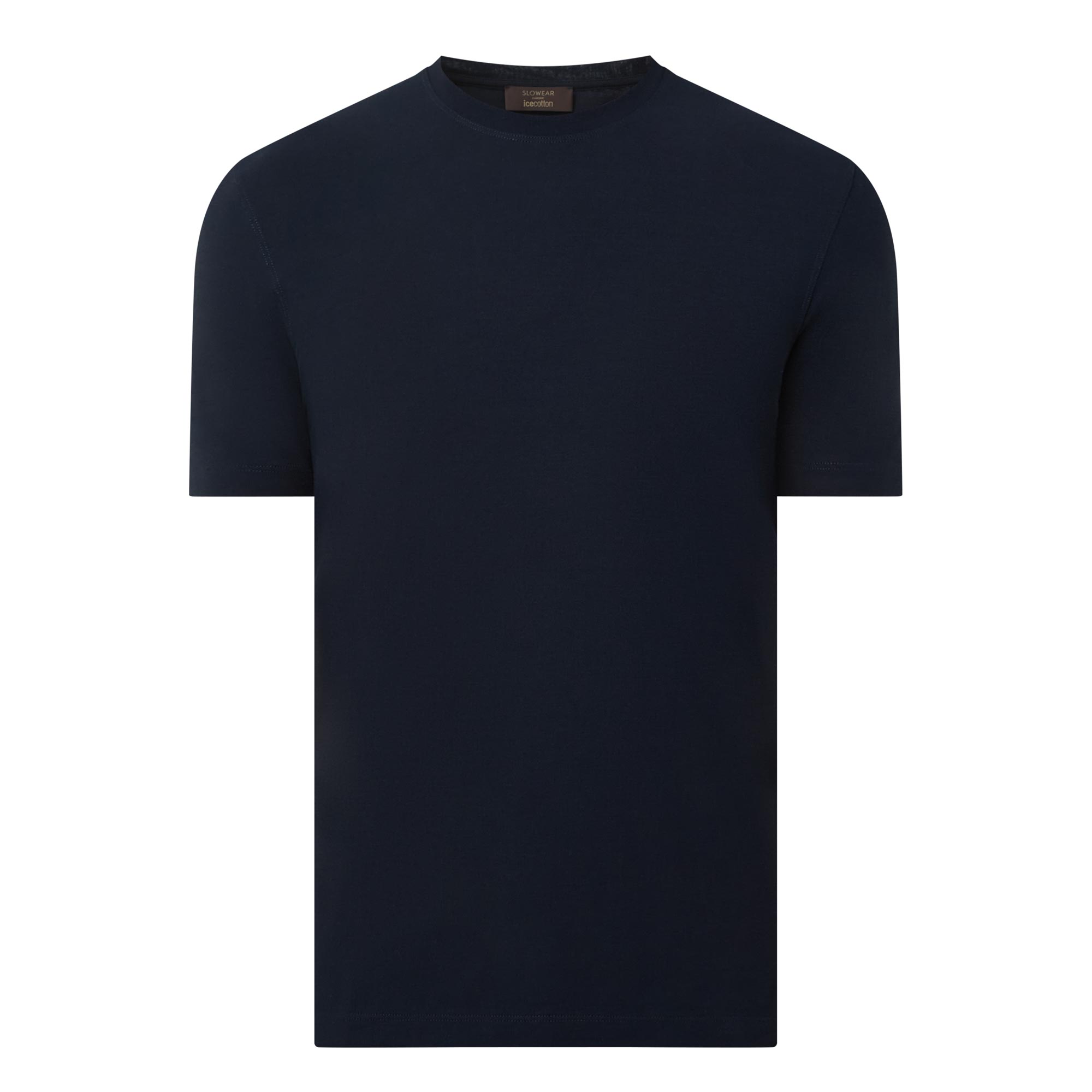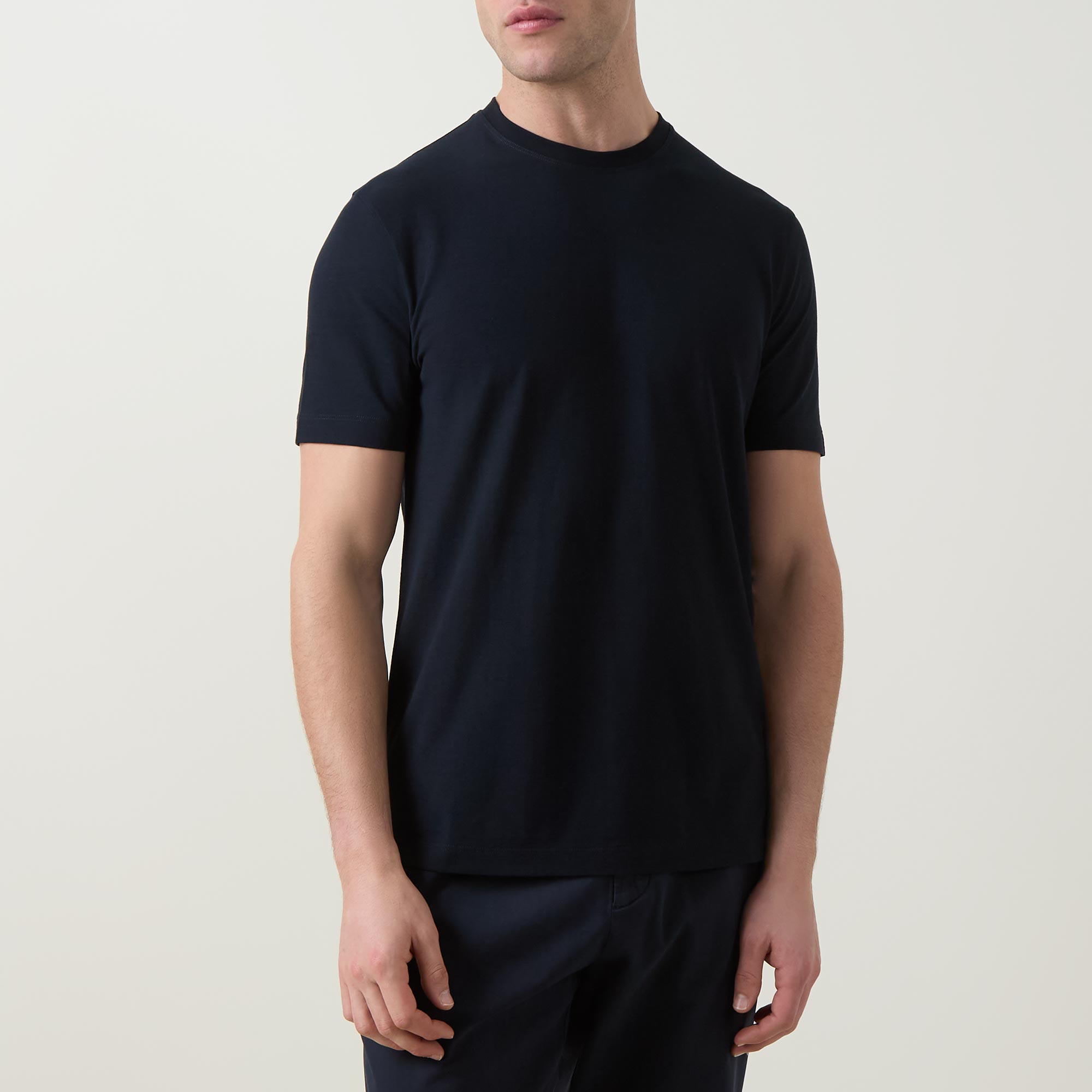 - Crew neckline, short sleeves, tonal stitching, straight hemline, smooth fabric