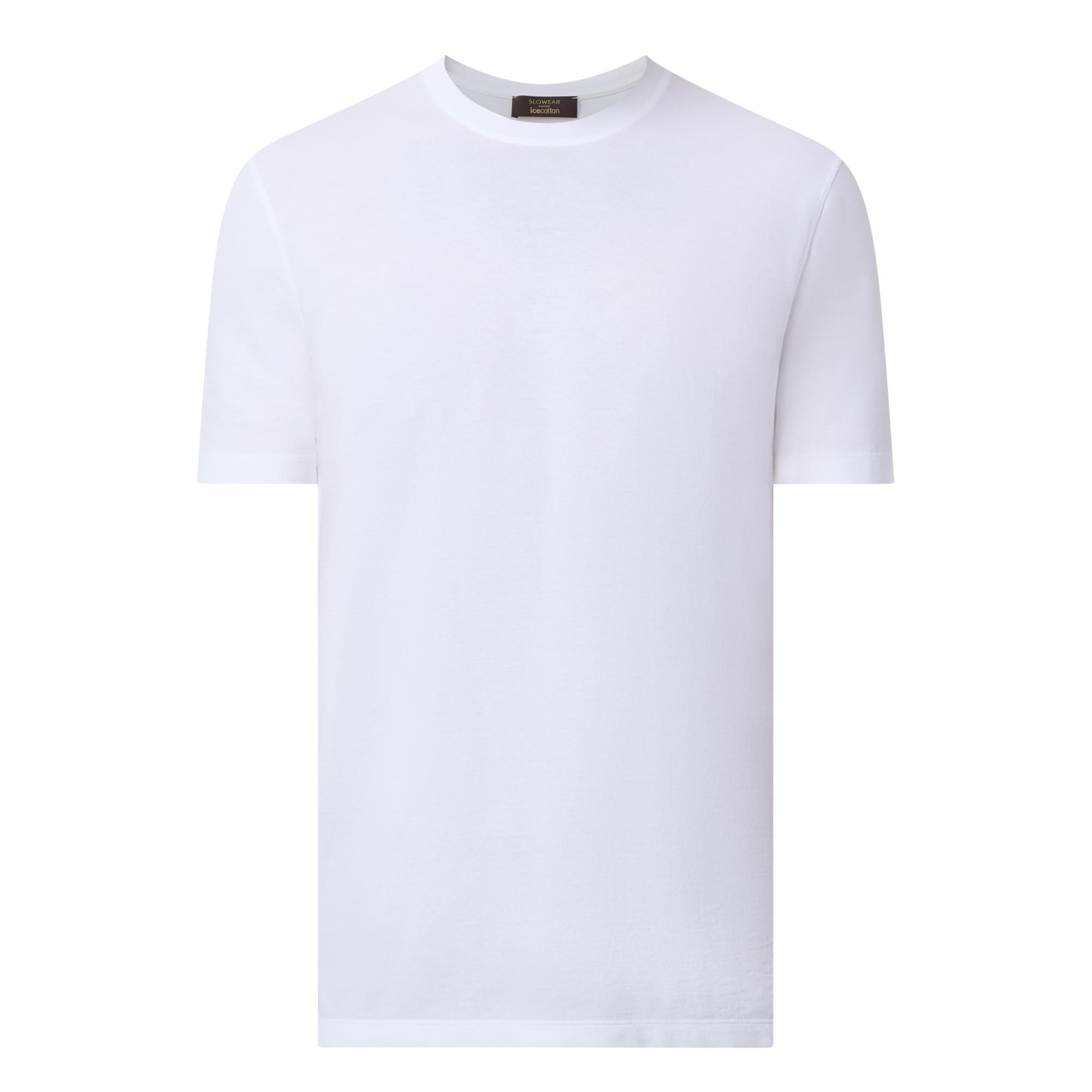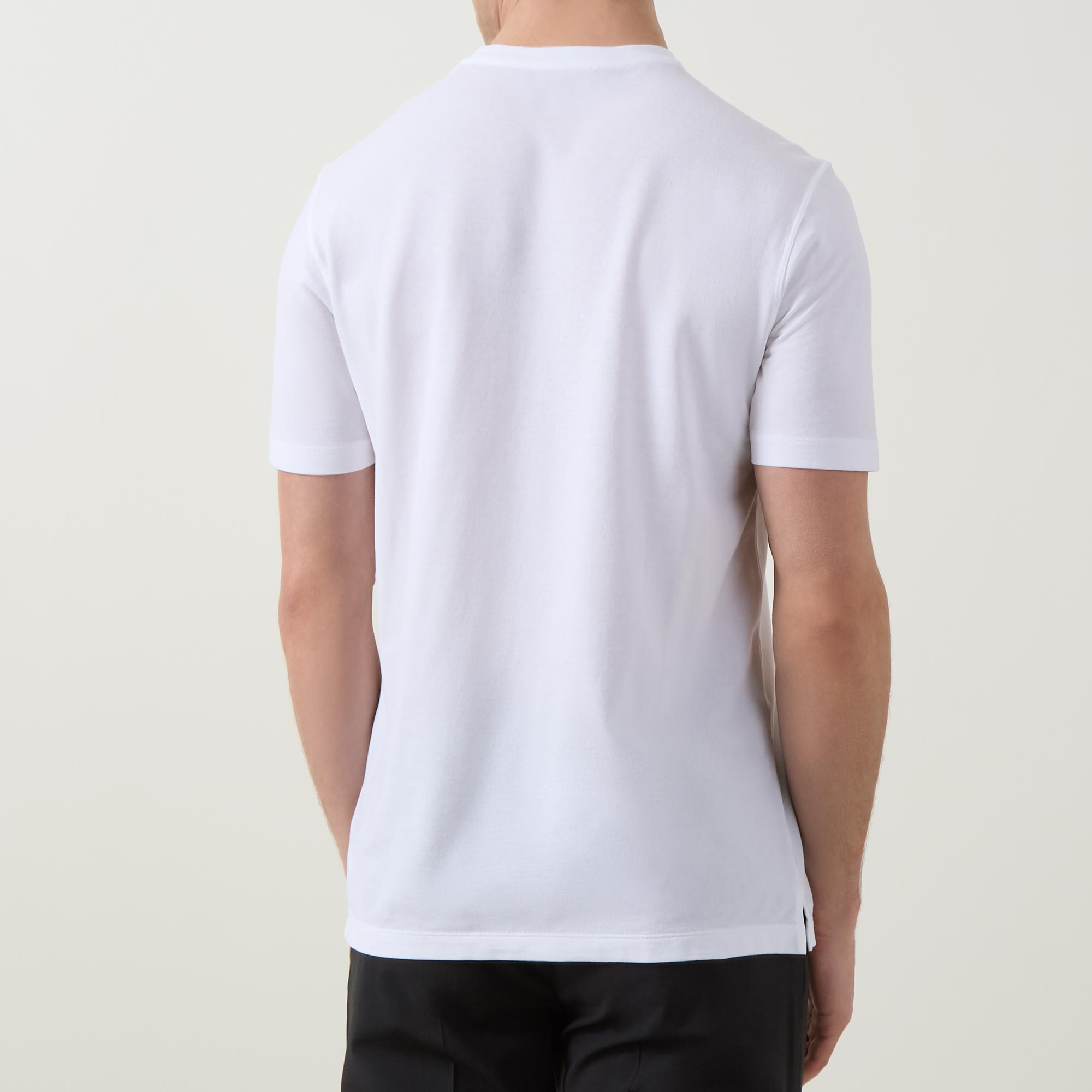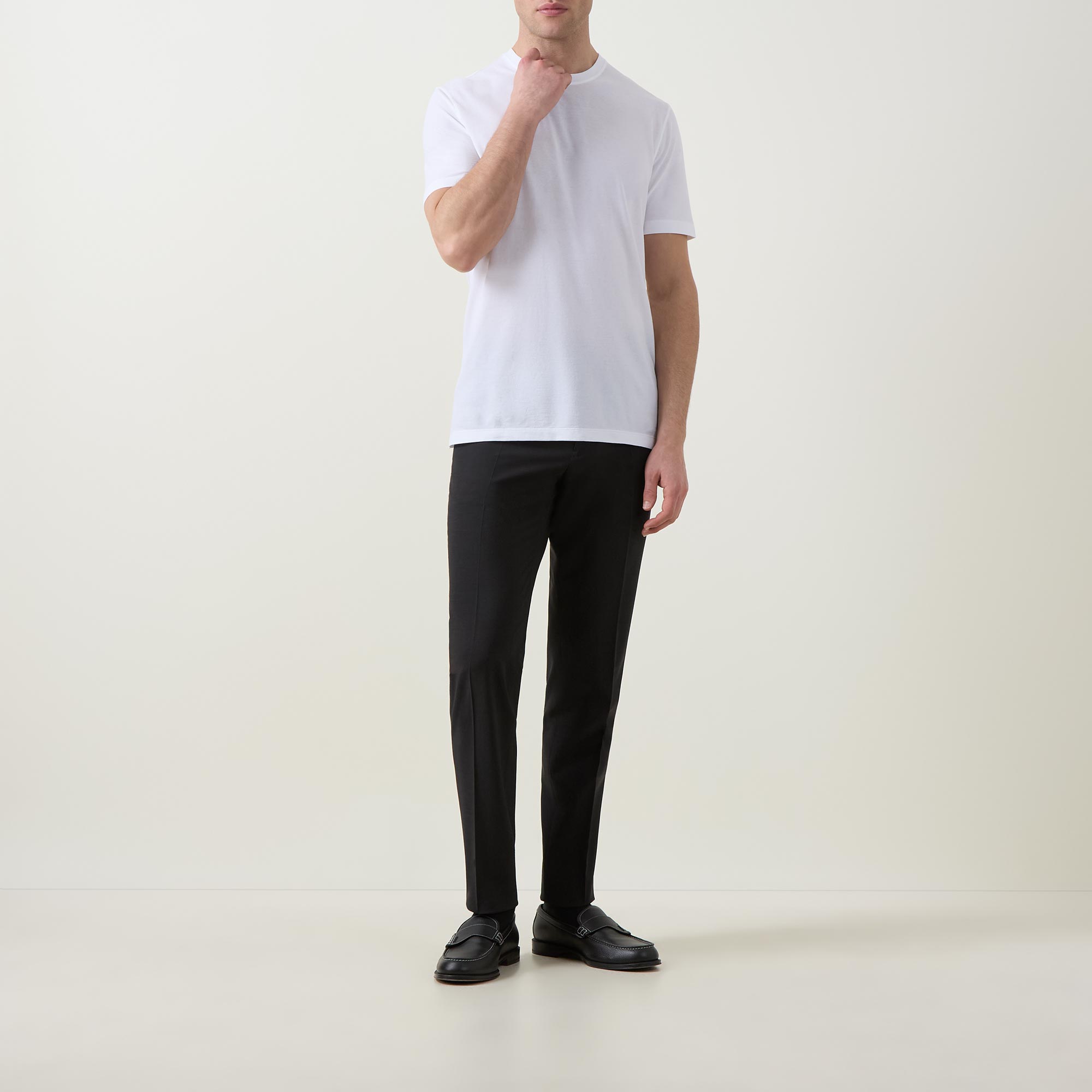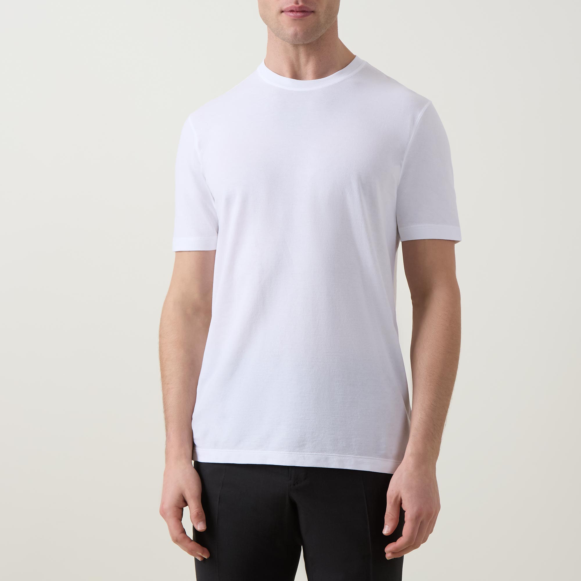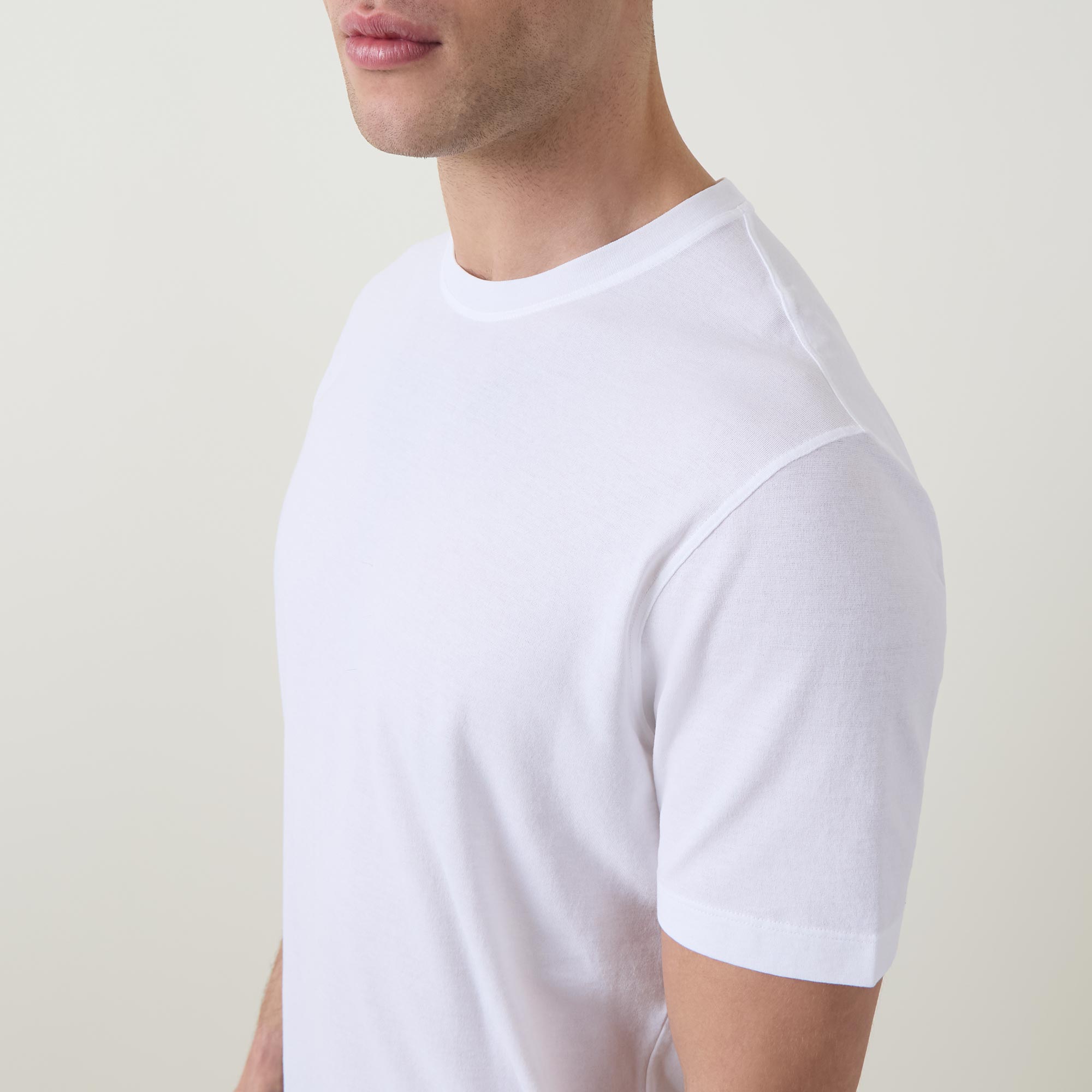 - Crew neckline, short sleeves, tonal stitching, straight hemline, smooth fabric