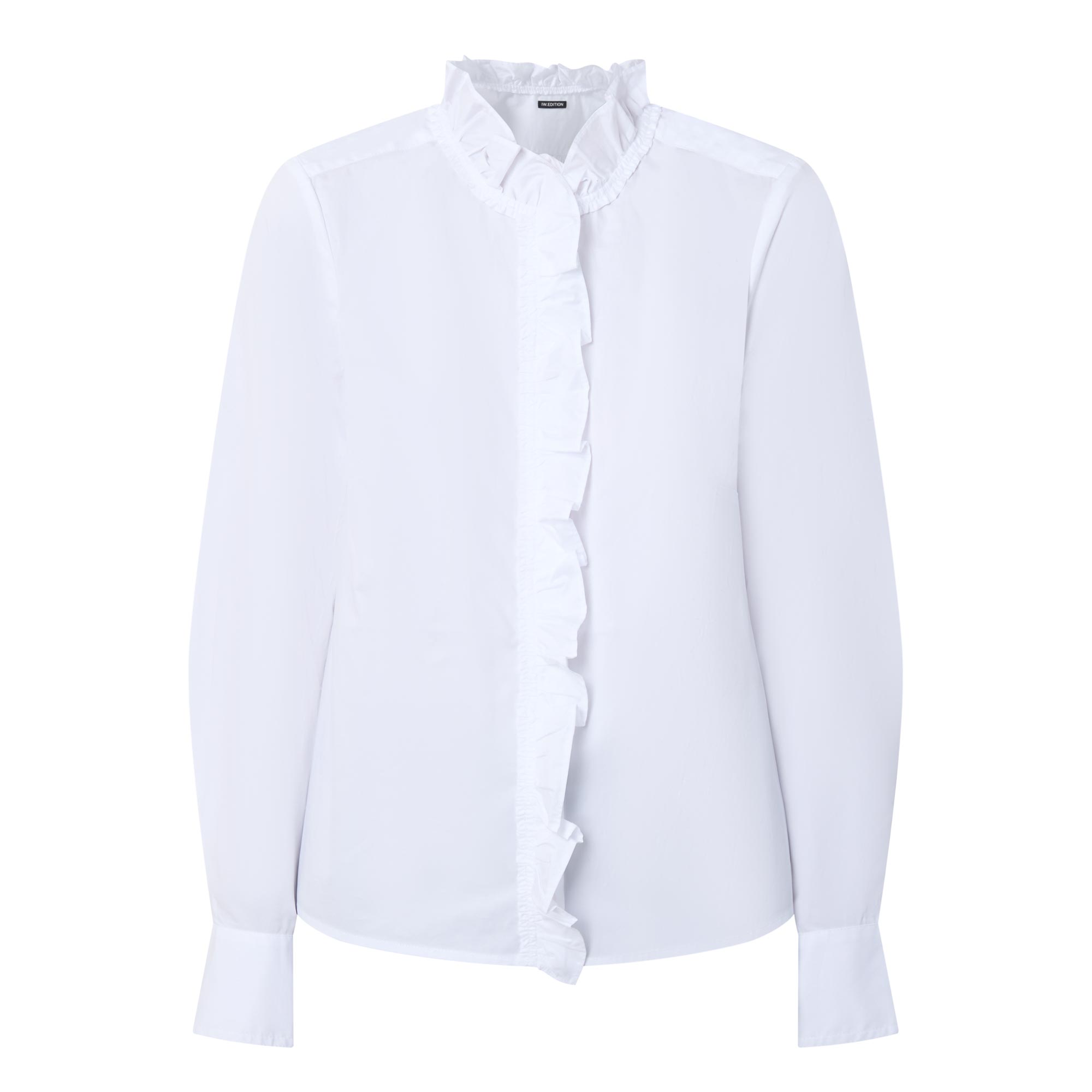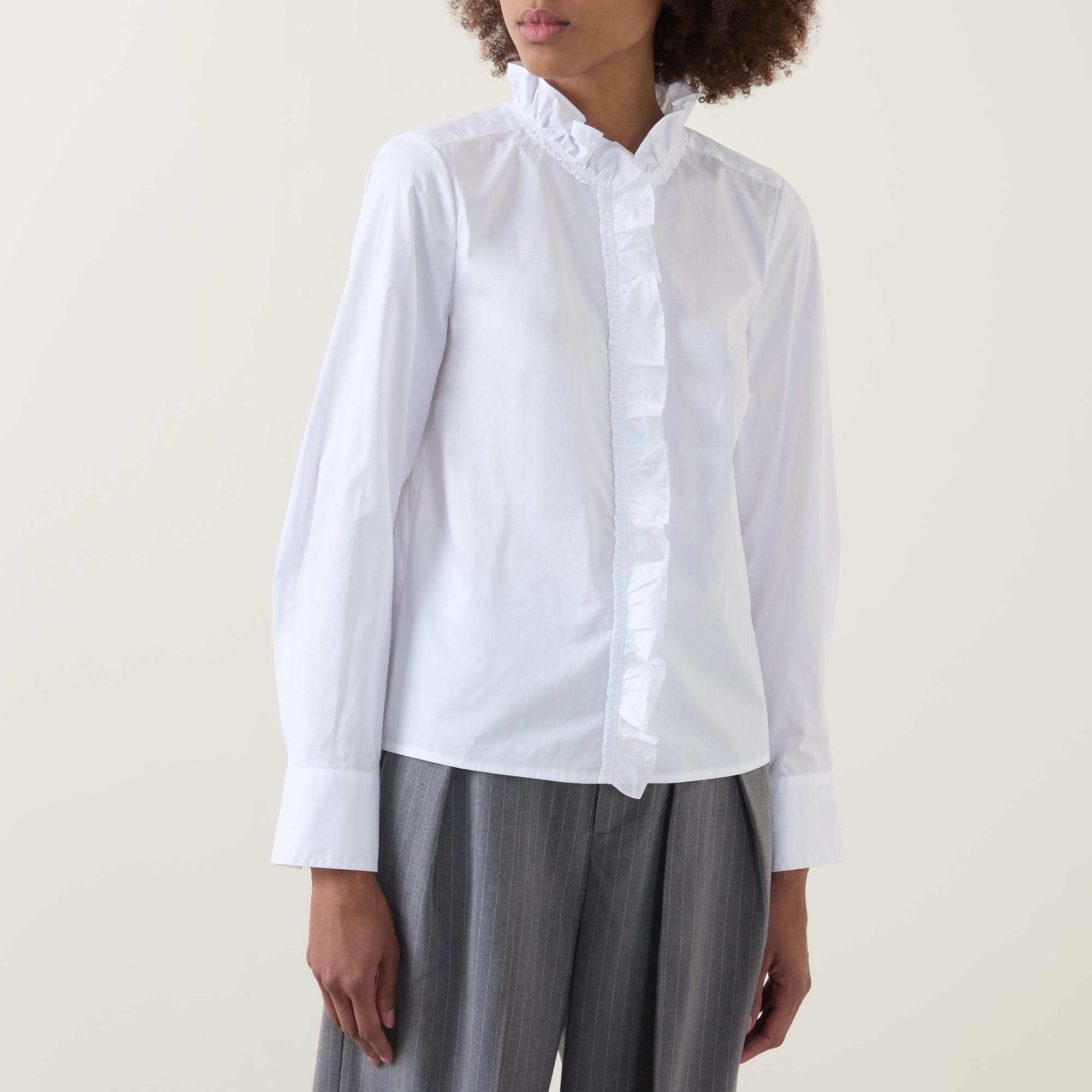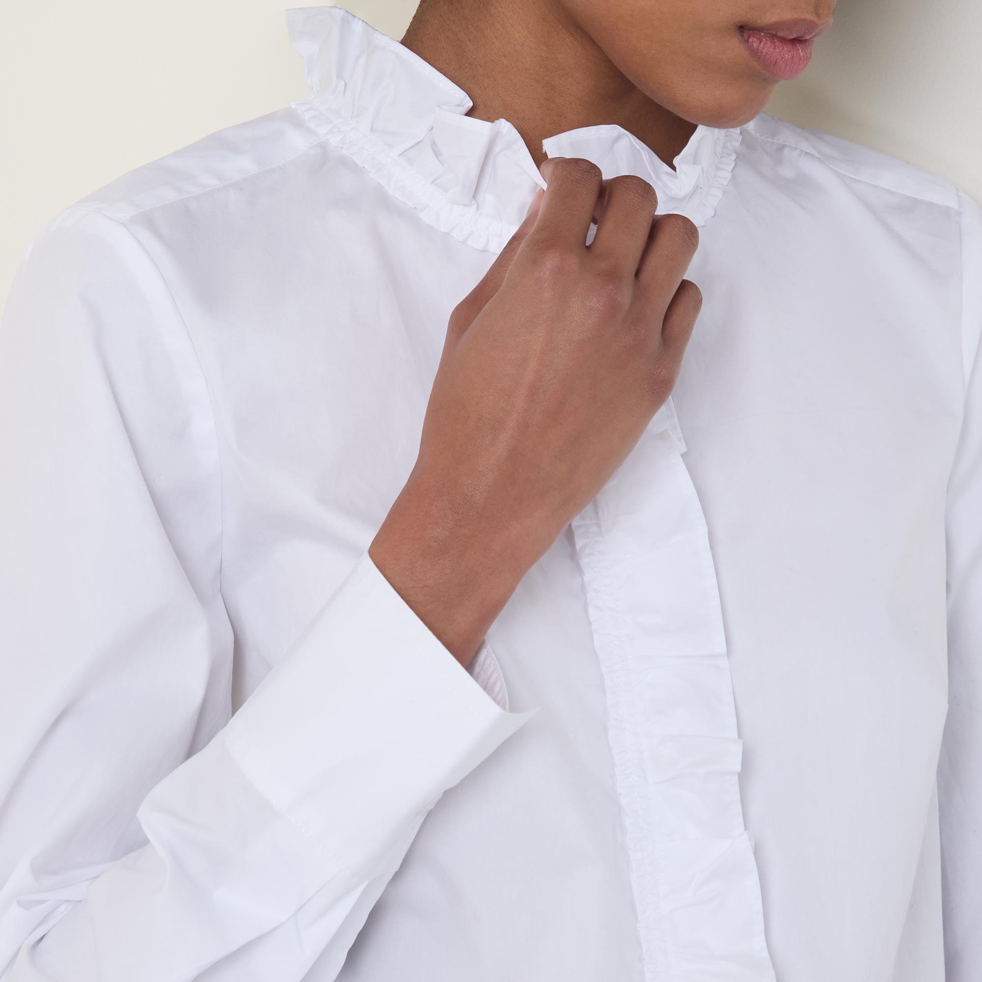- High frill neckline, long sleeves, buttoned cuffs, concealed front placket with additional frill throughout, curved hemline, tonal stitching, rear logo label, crisp finish