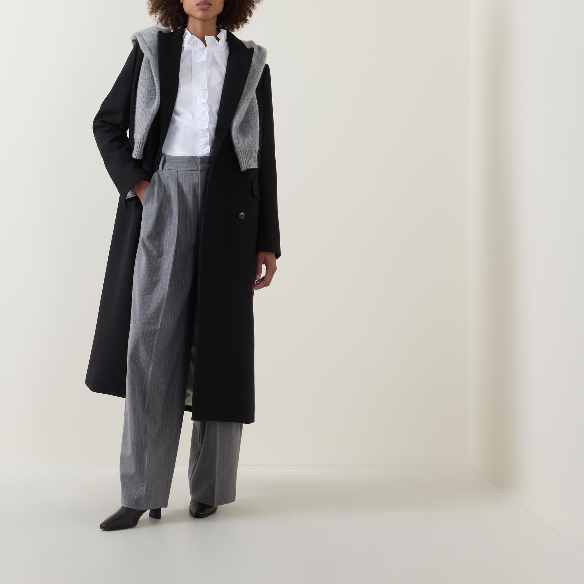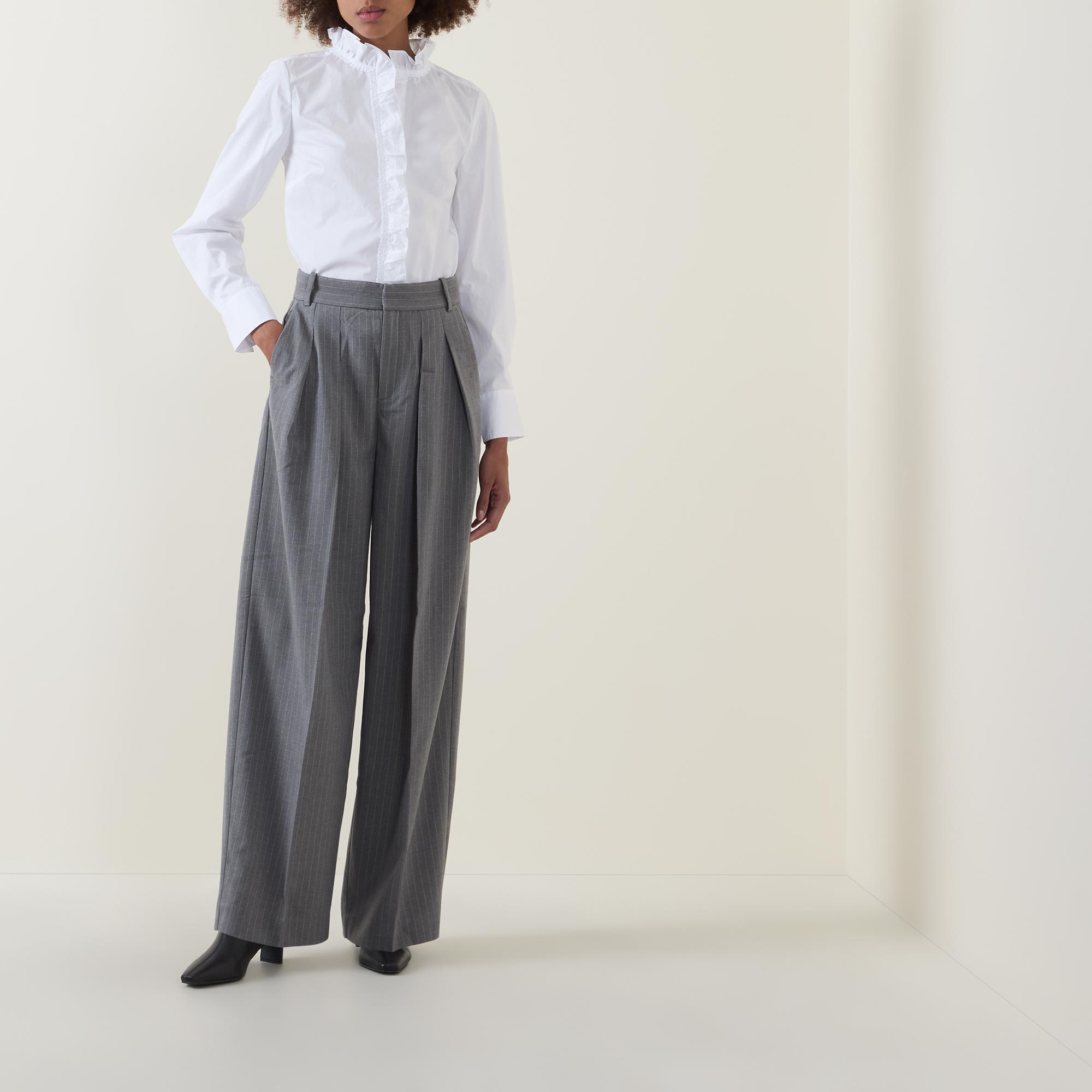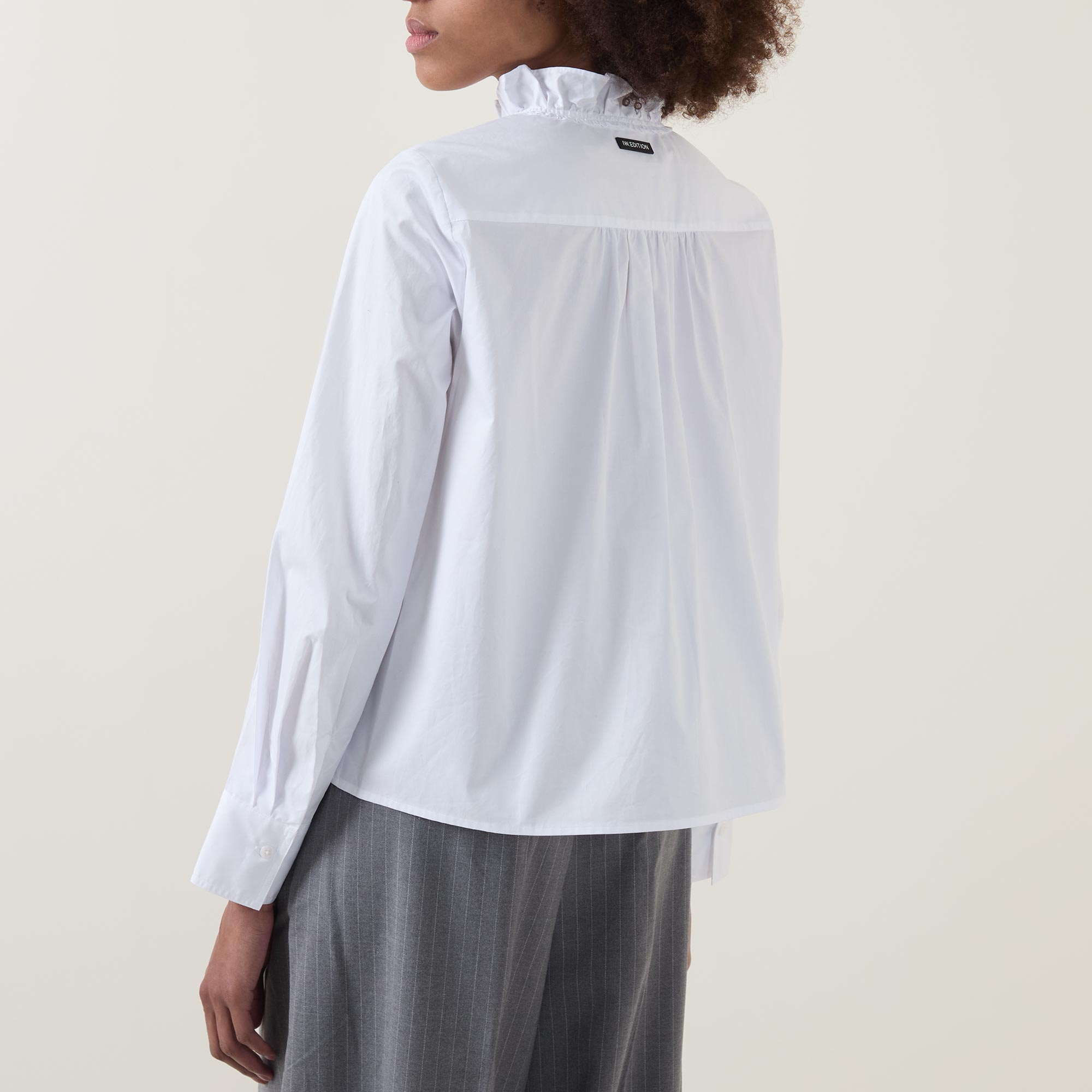 - High frill neckline, long sleeves, buttoned cuffs, concealed front placket with additional frill throughout, curved hemline, tonal stitching, rear logo label, crisp finish