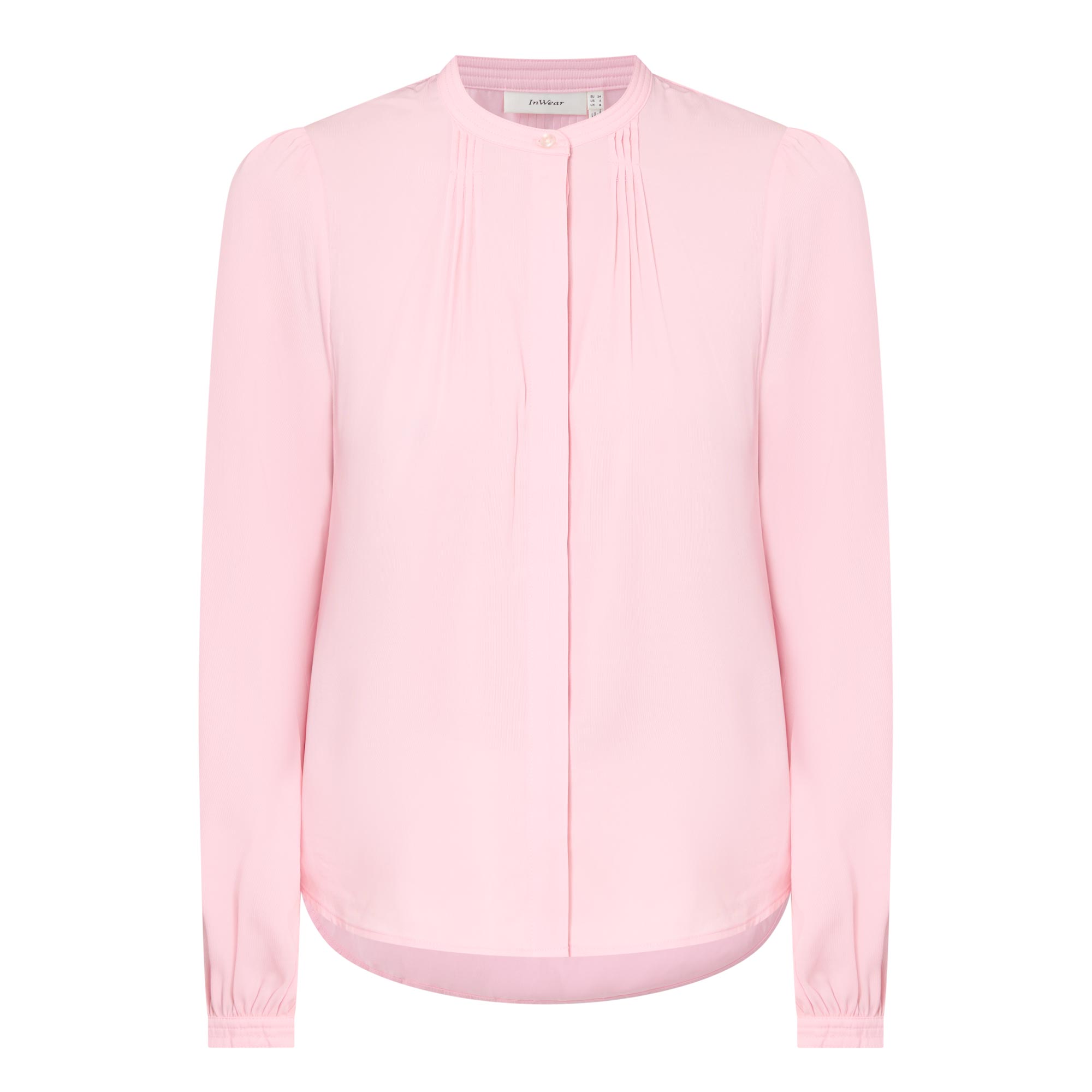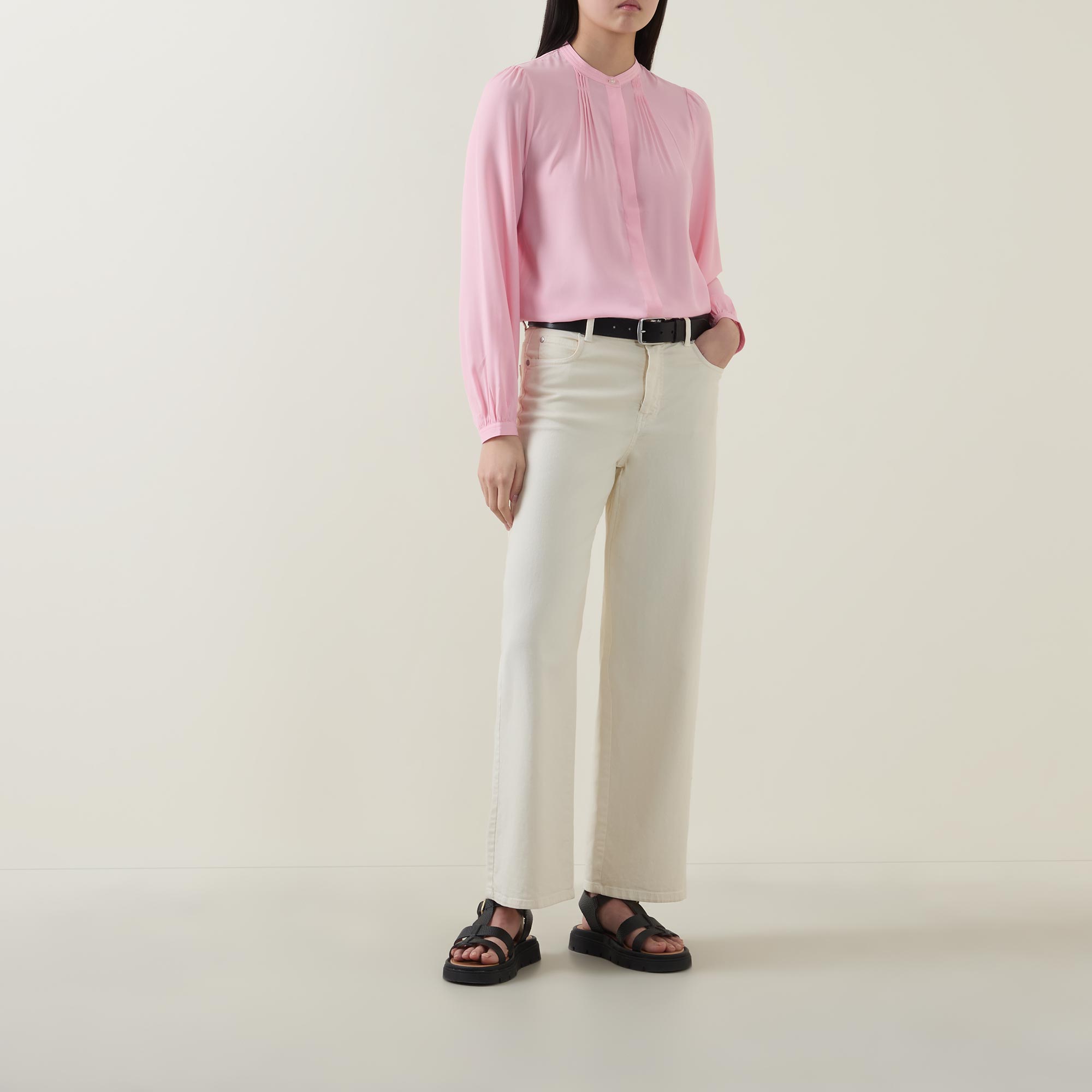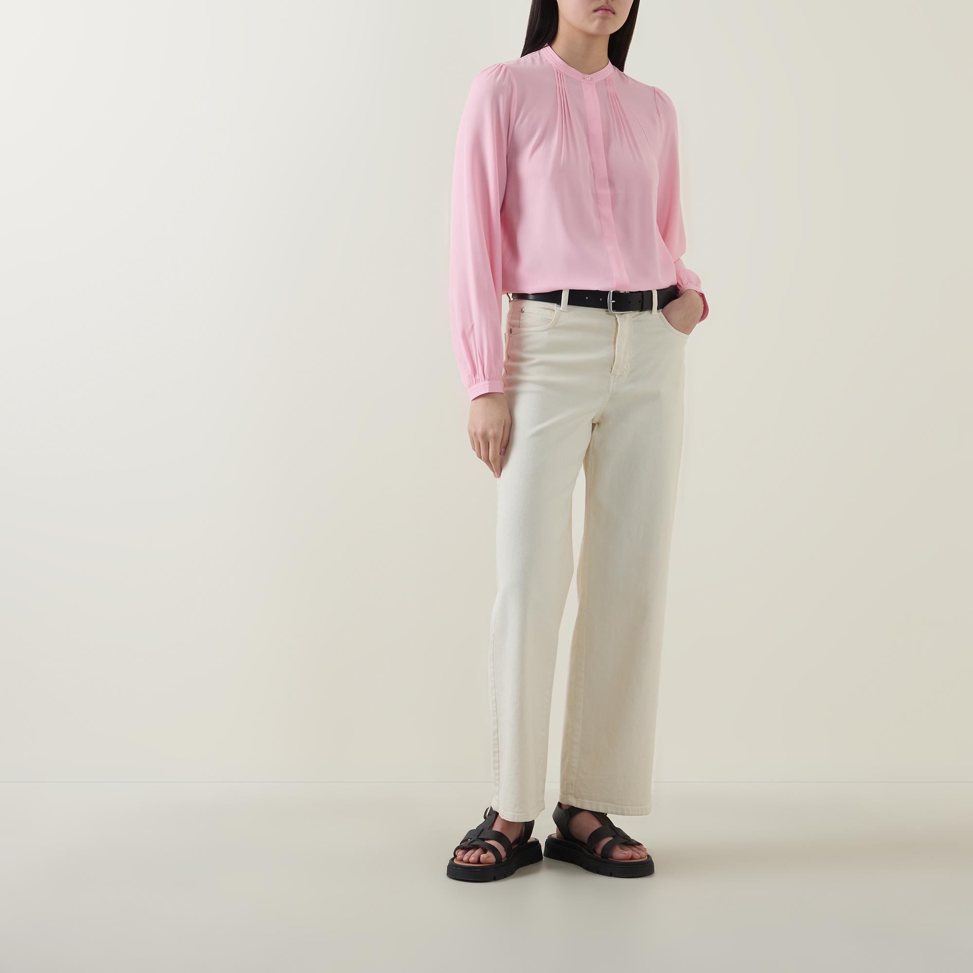 - Round neckline, concealed button fastening, long sleeves, buttoned cuffs, dipped hemline, subtle pleating details to the front and back