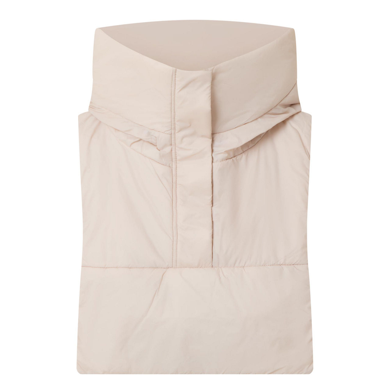 - Padded hood, snap button placket, sleeveless design, quilted finish, lined