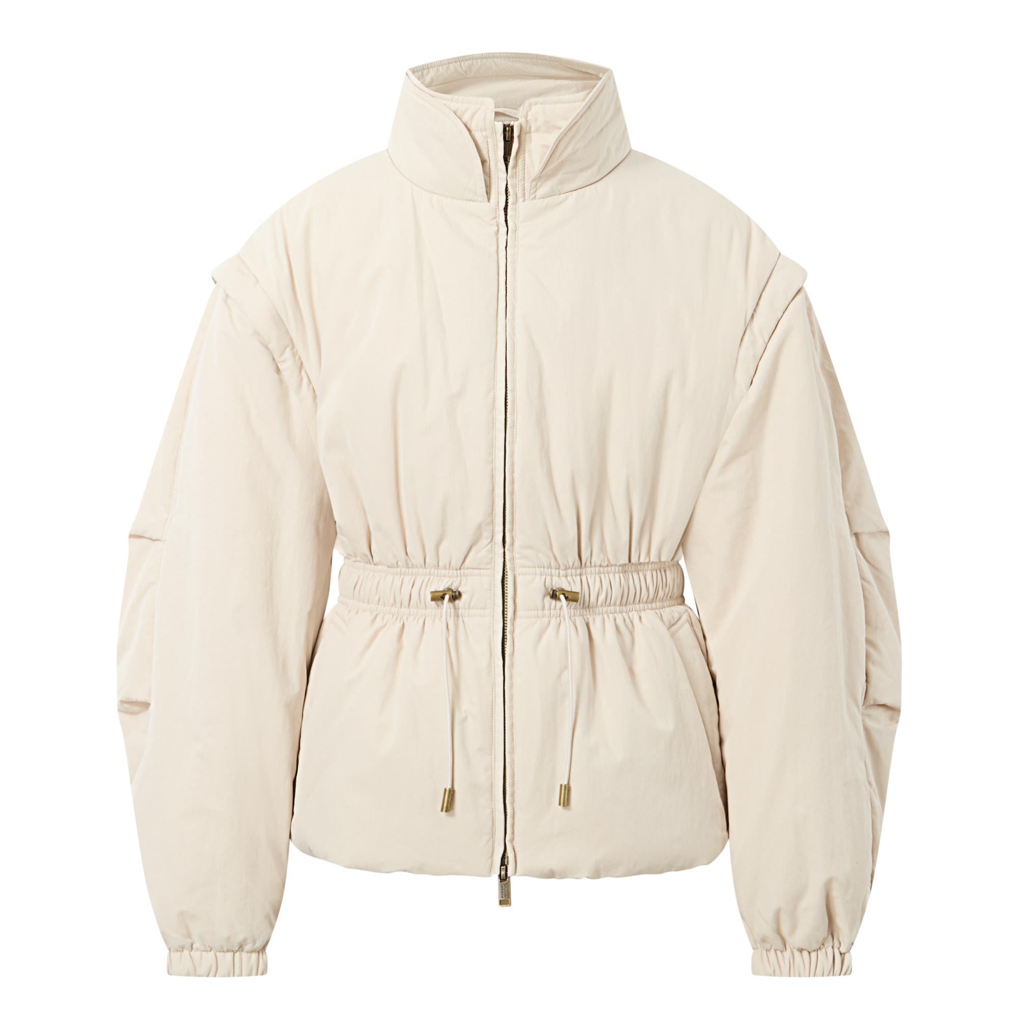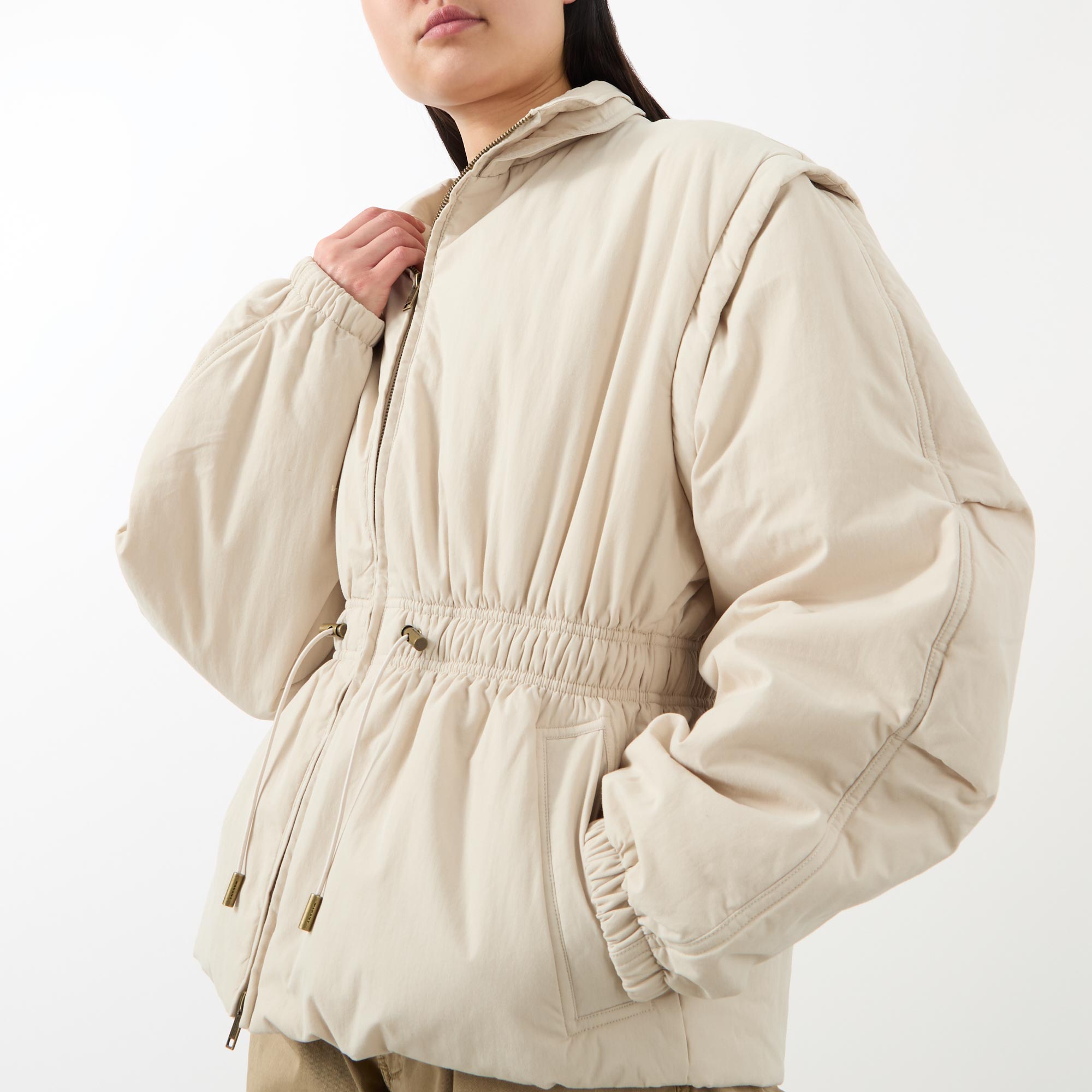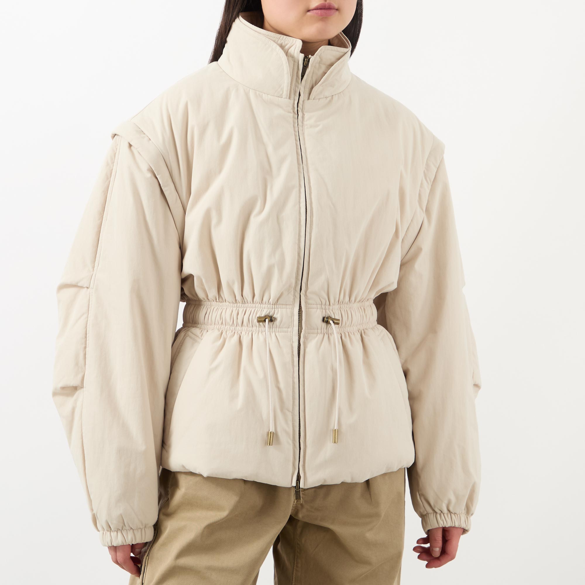 • Double stand collar, turn up shoulders, detachable long sleeves, tapered cuffs, two-way front zip fastening, elasticated waist with adjustable drawstring fastening, two side entry pockets, straight hem, tonal logo embroidery on the chest, quilted finish, padded
