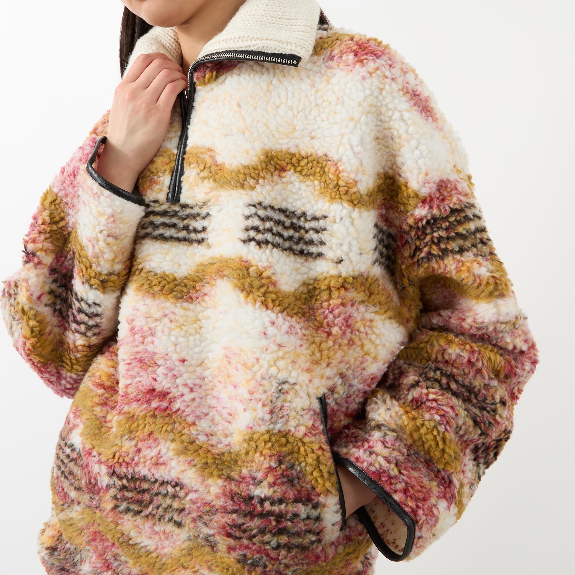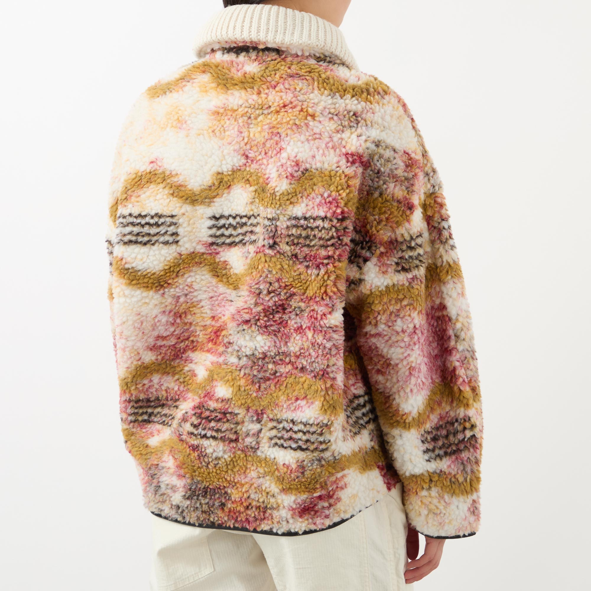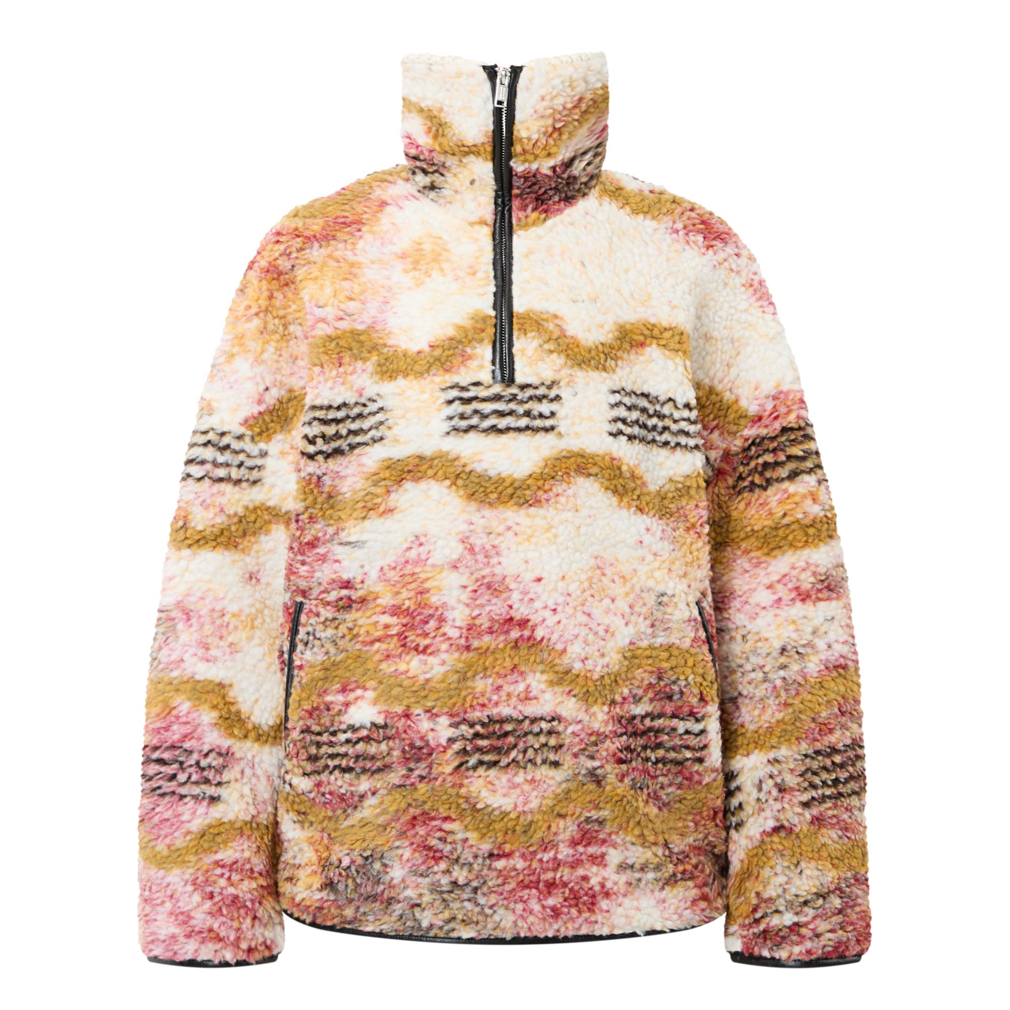 - Ribbed collar, half zip fastening, dropped shoulders, long sleeves, two side entry pockets with zip fastenings, straight hem, bound trims, printed design, fleece textured finish