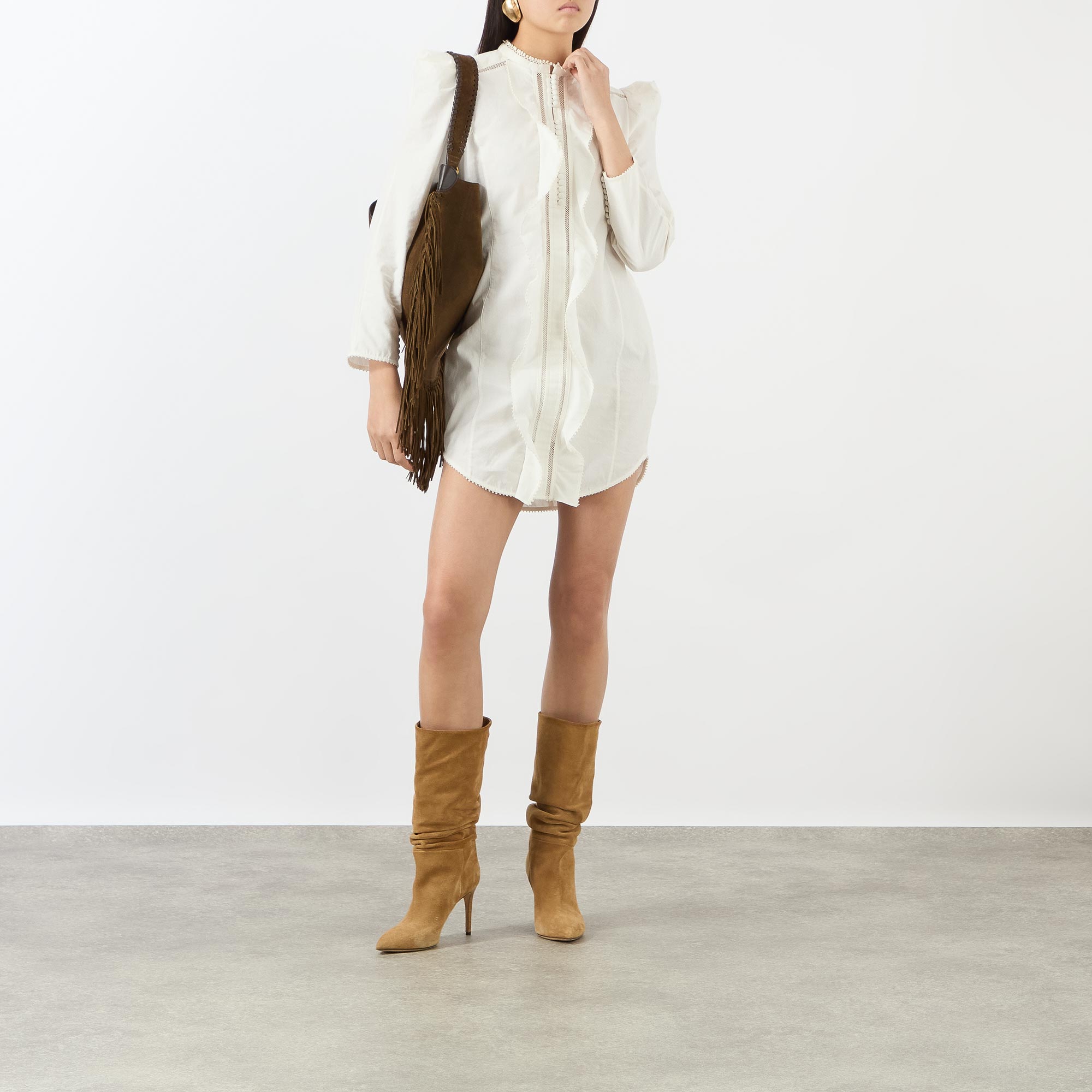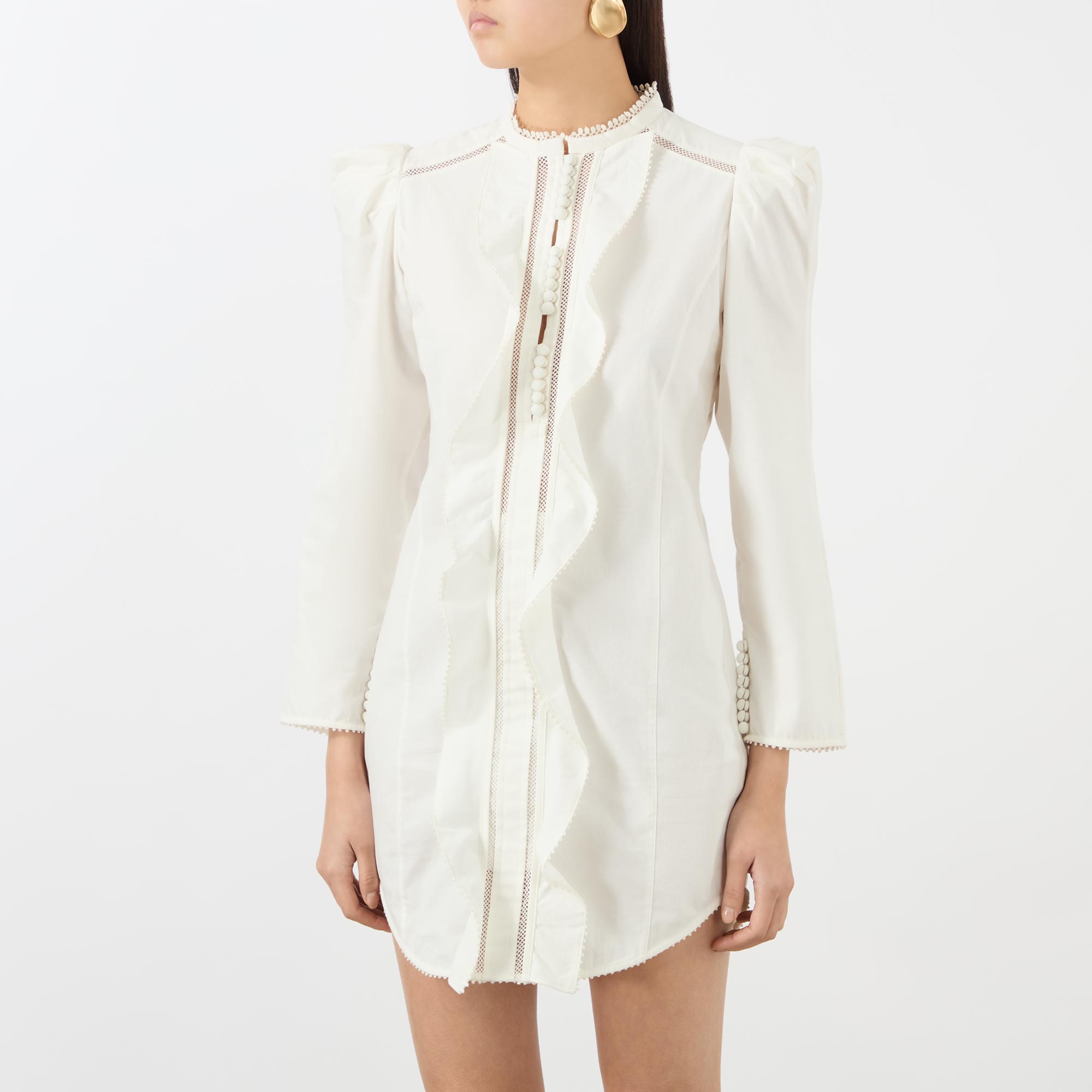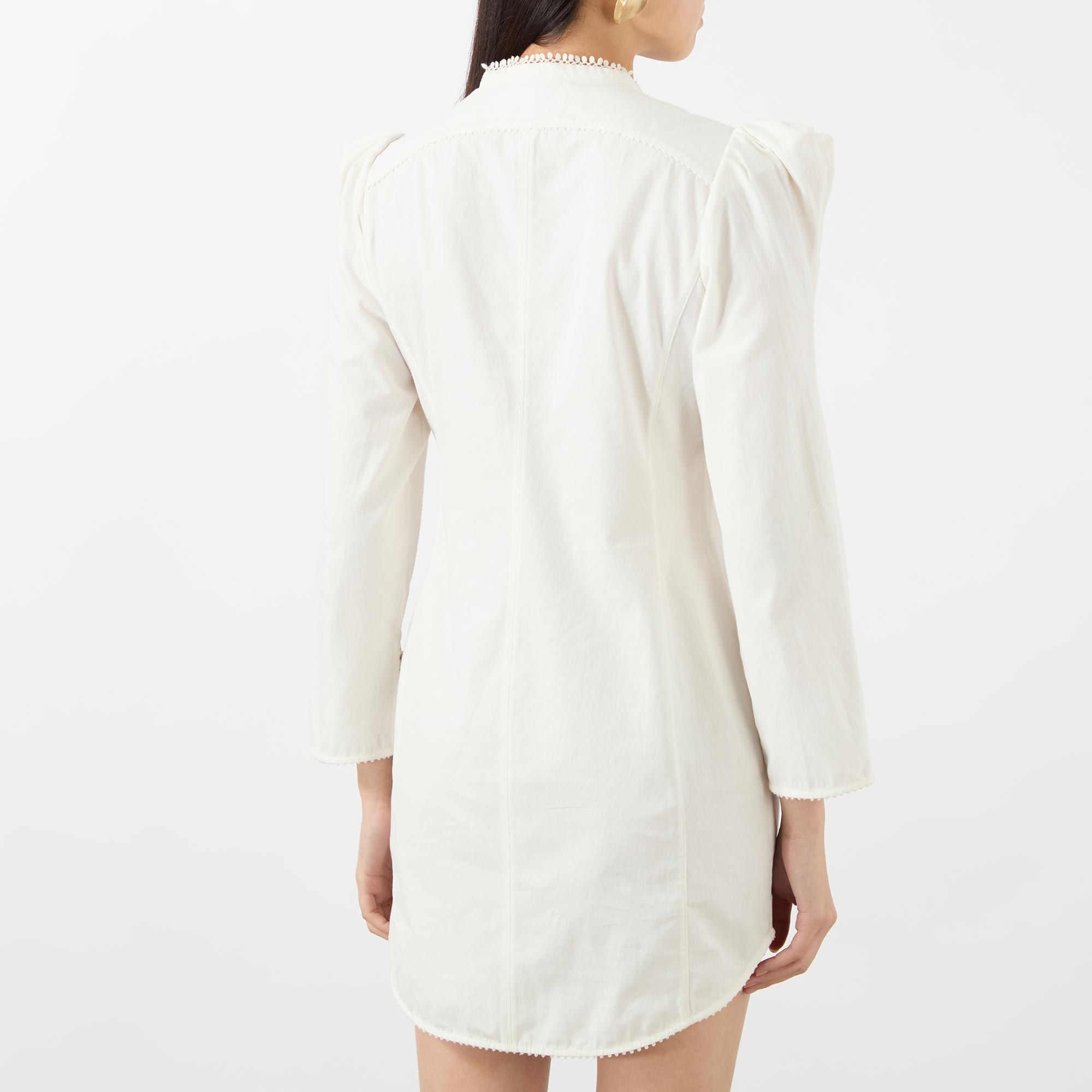 Delicate embroidery and openwork lace are dotted throughout Isabel Marant’s new SS26 line, and the Chantal dress fits the bill. Cut with a Mandarin collar and long sleeves, it boasts elegant puffed shoulders, while its shift silhouette is accented with ruffle trim along the button placket before falling to a classic mini length.