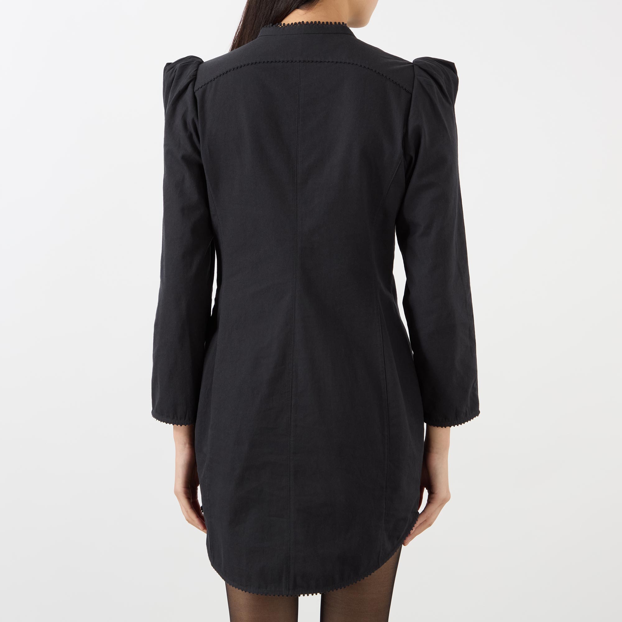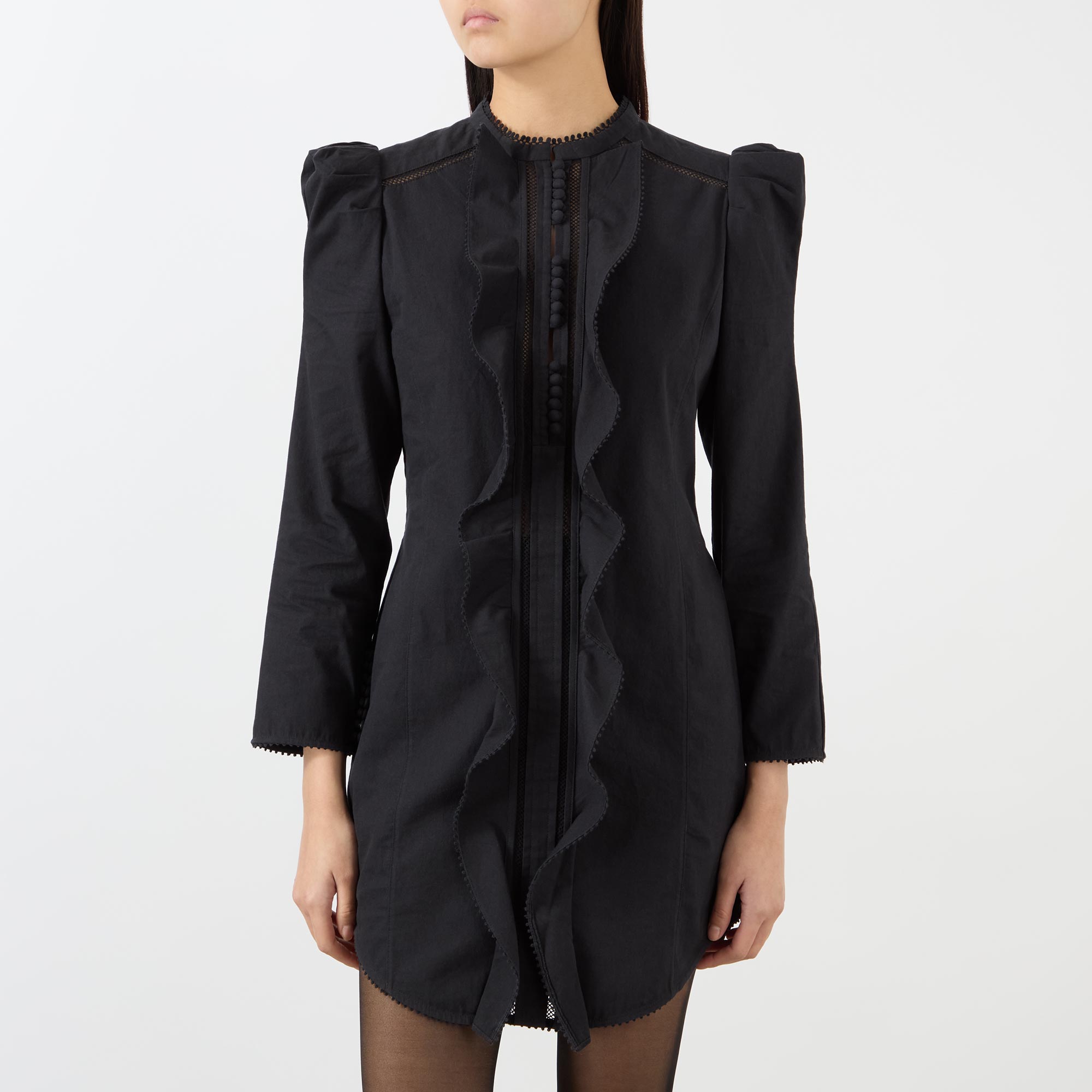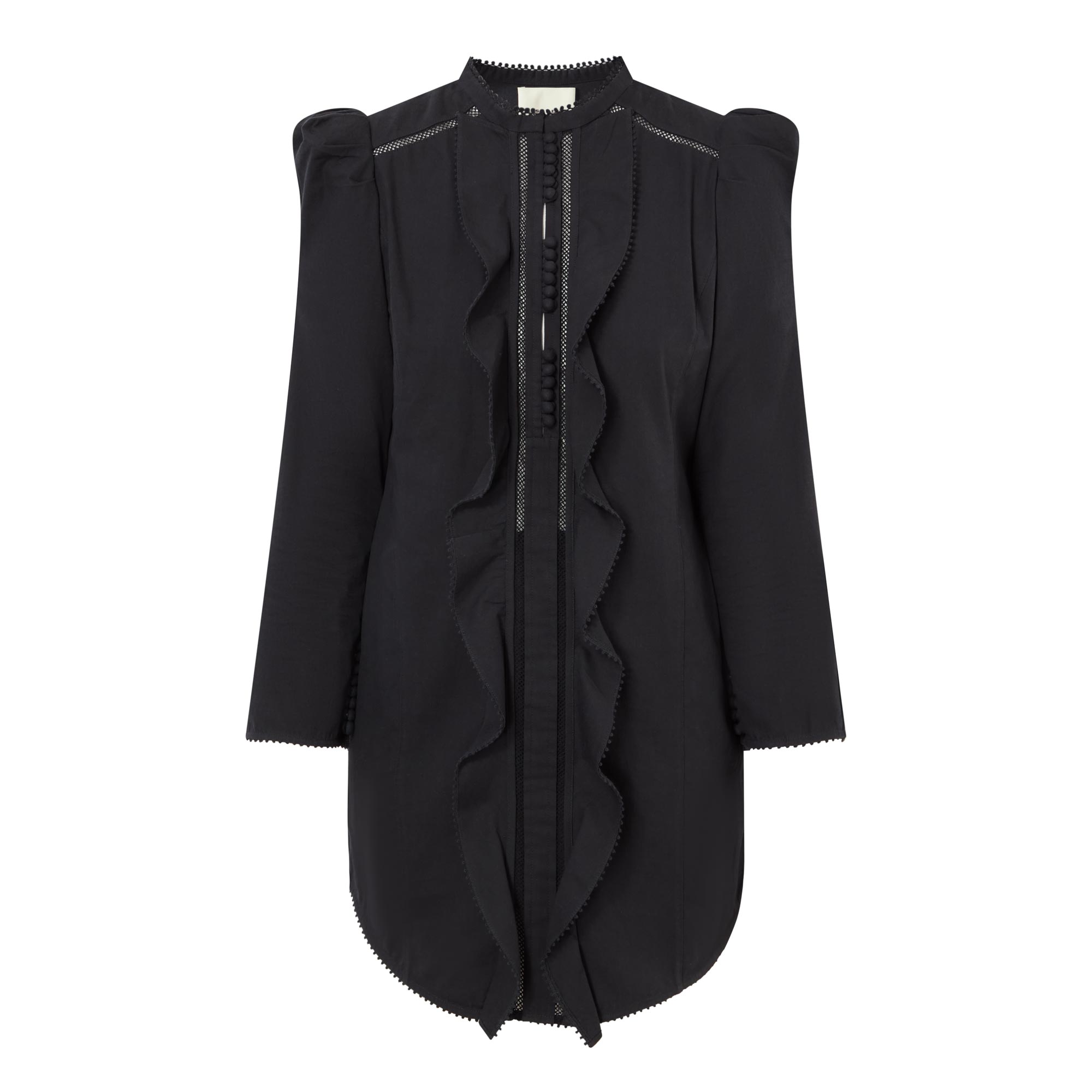 - Mandarin collar, long sleeves, puff shoulders, fabric covered buttons, ruffle trim, shift silhouette, curved hemline, mini length