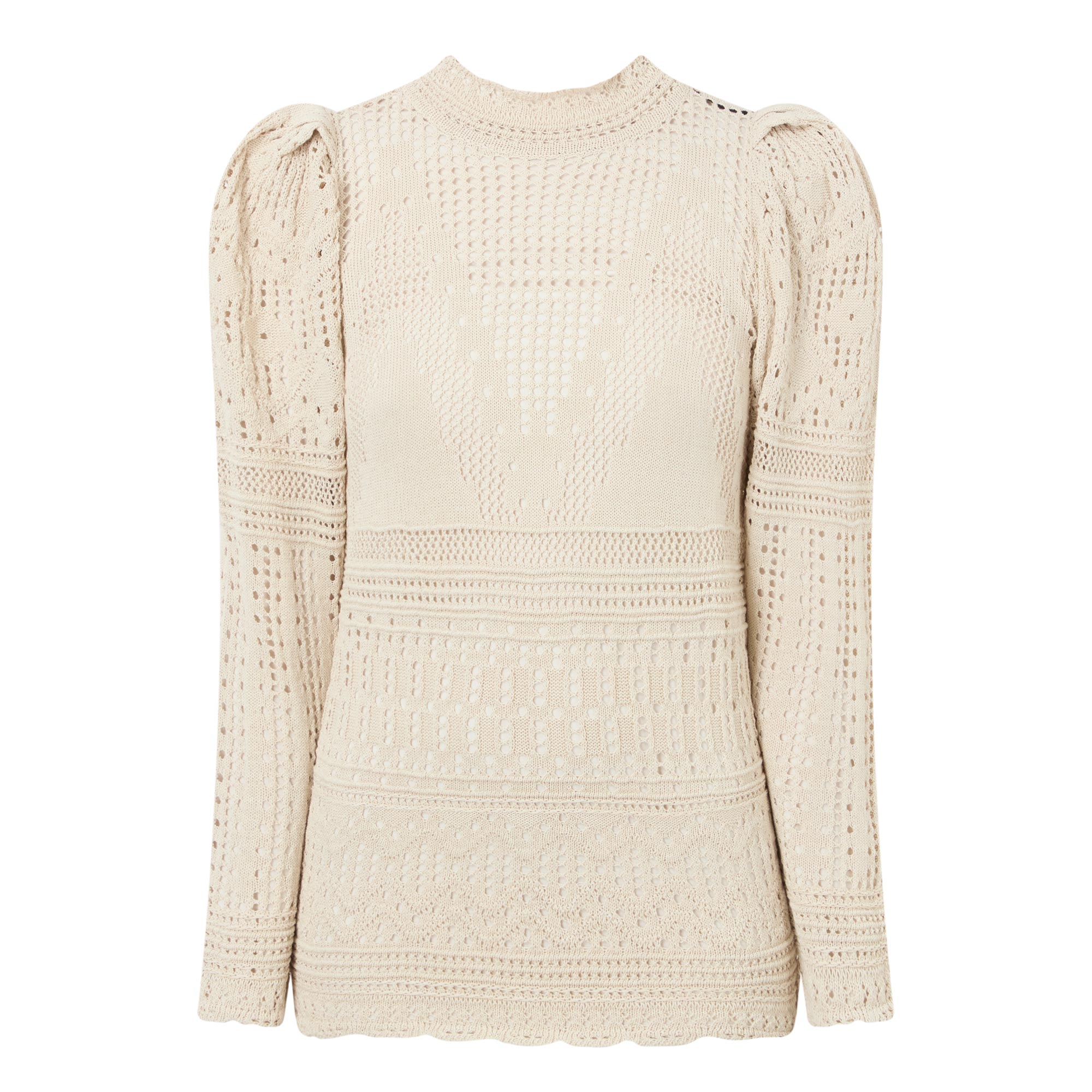 - Stand-up collar, long sleeves, puff shoulders, back keyhole and button fastening, open work woven finish