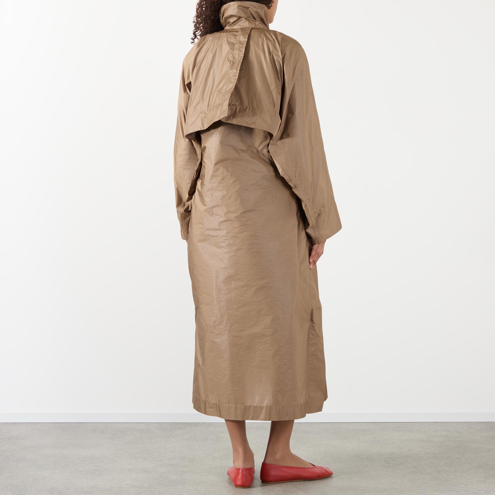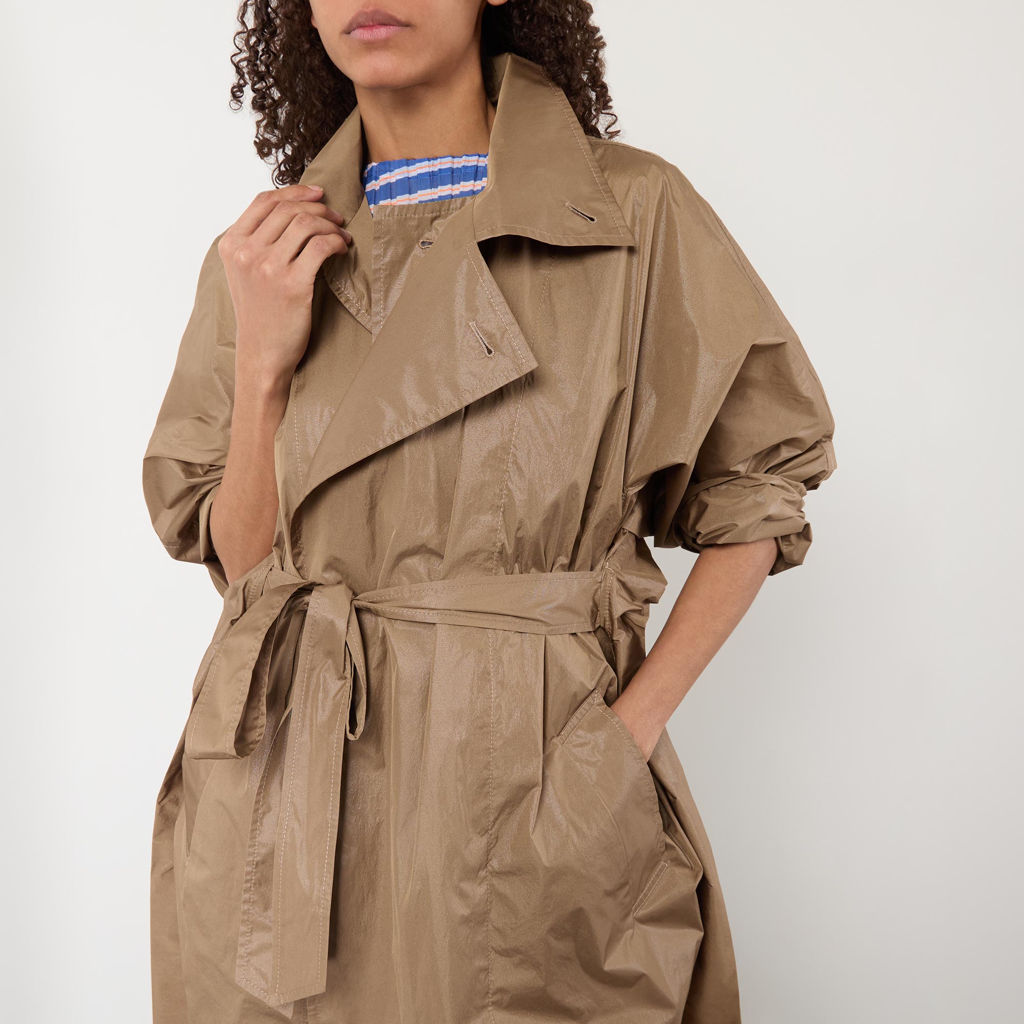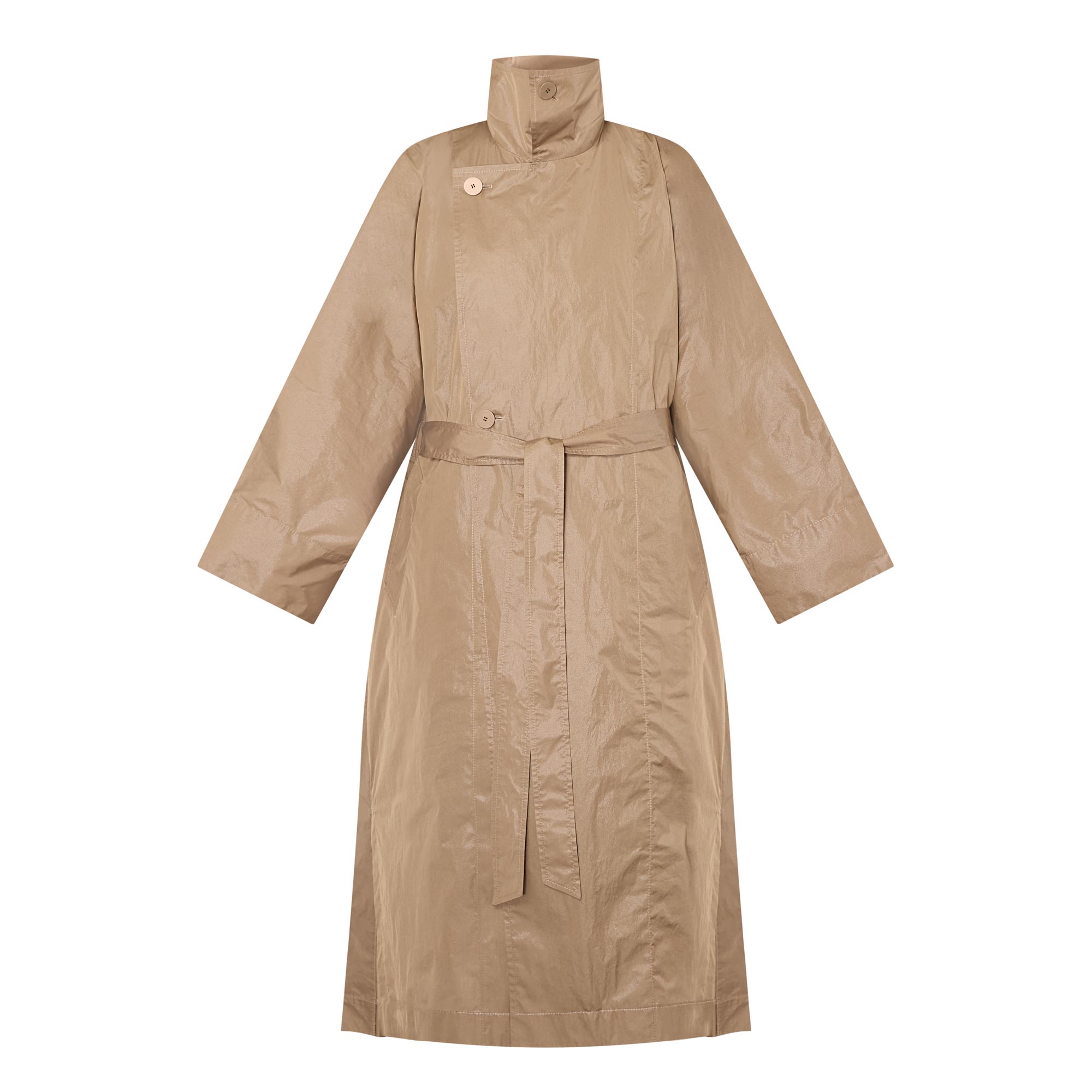 - Voluminous cut, high stand collar, exaggerated storm shield, matching belt, off-centre button fastenings, practical pockets, side slits