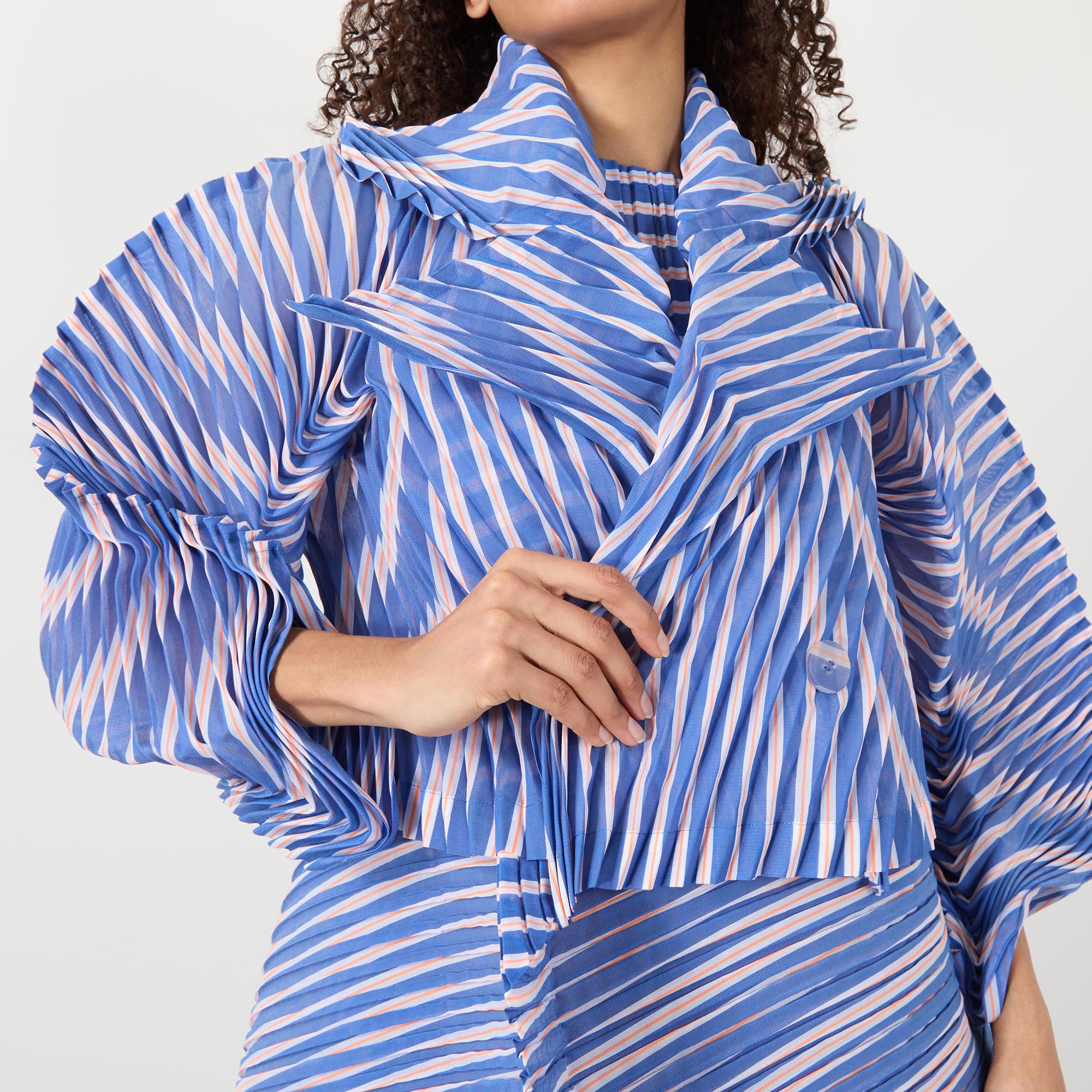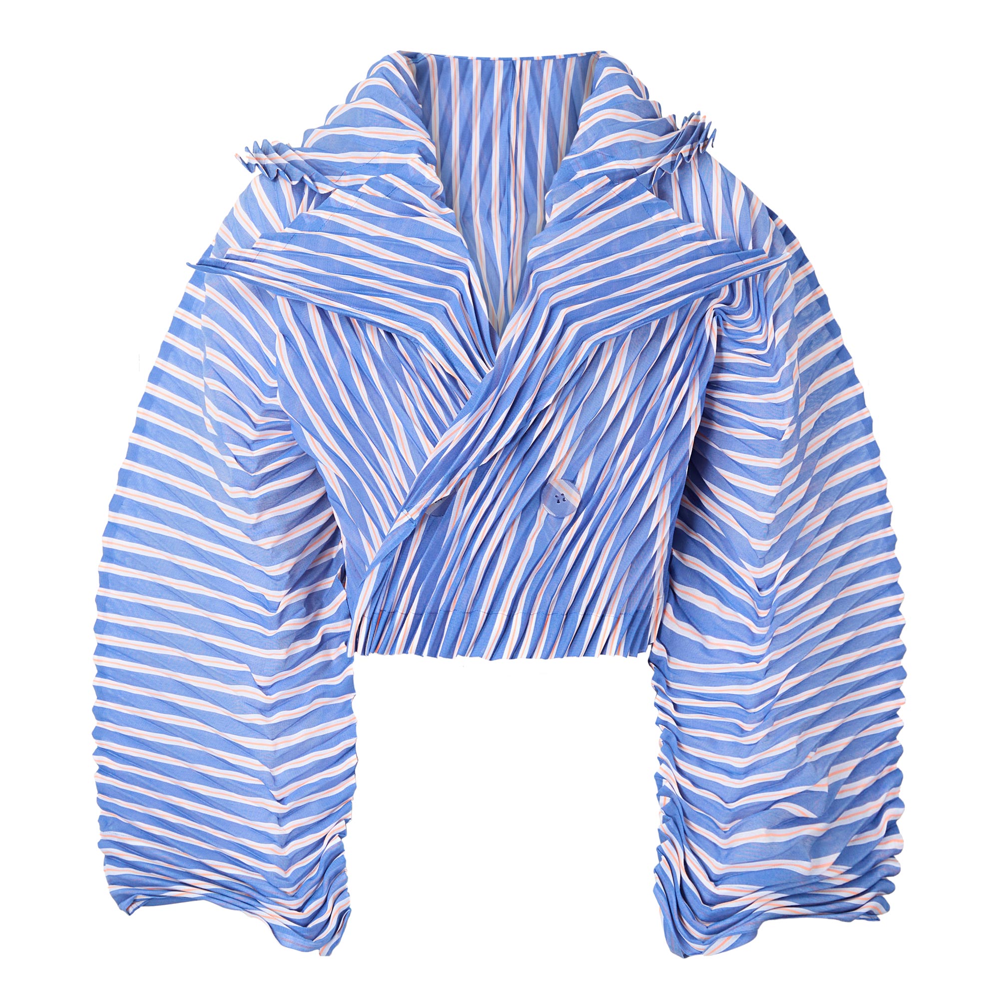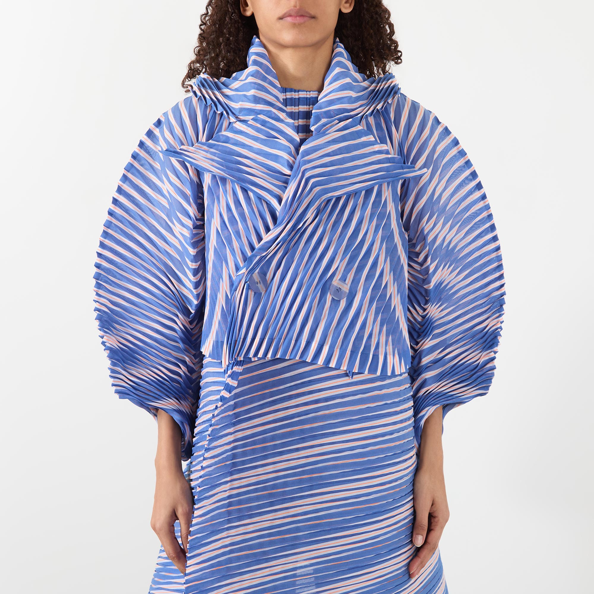 - Long sleeves, double-breasted front, wide notched lapel collar, button fastening, pleated stripe pattern, moiré visual effect, bold sculptural folds, crisp structured silhouette, airy lightweight feel