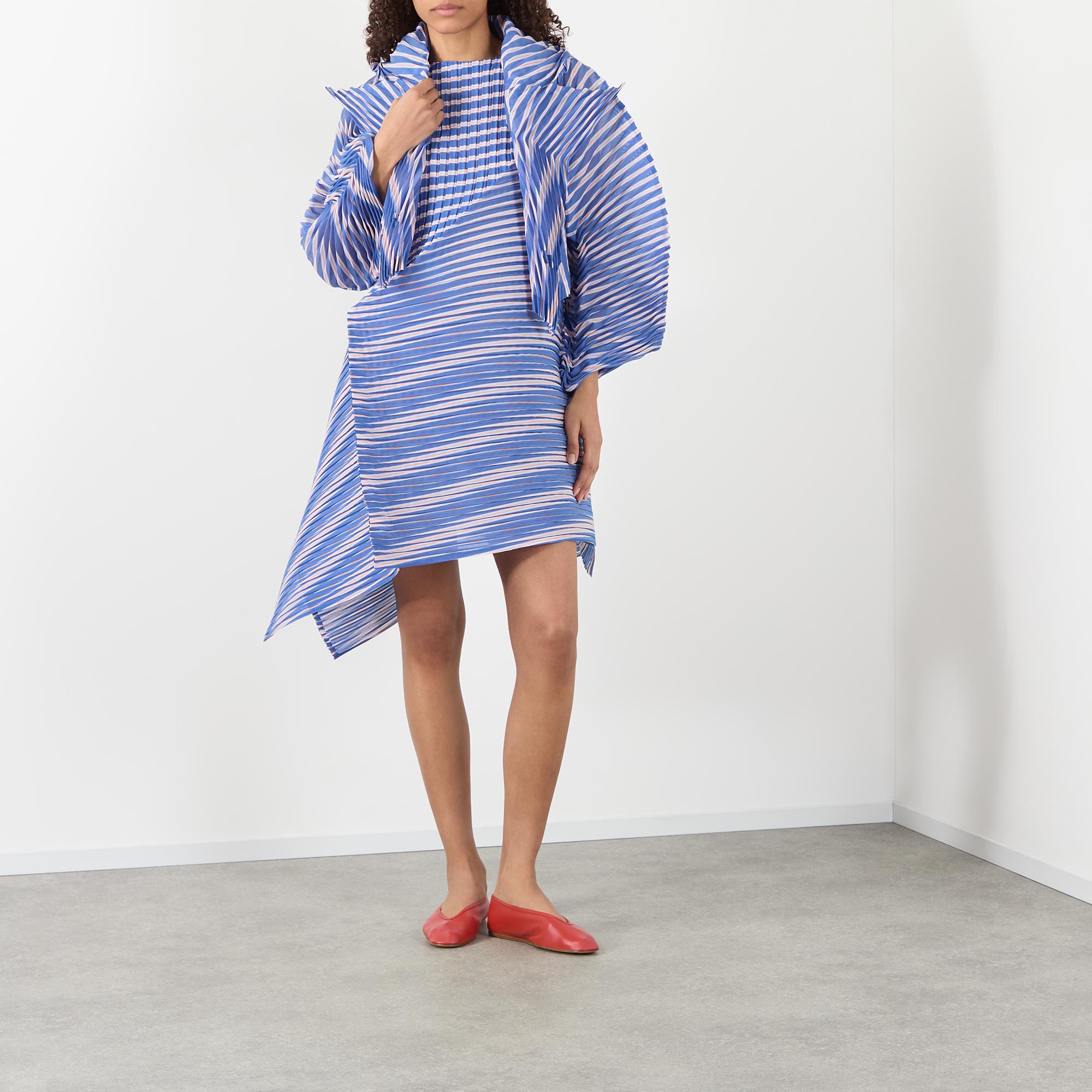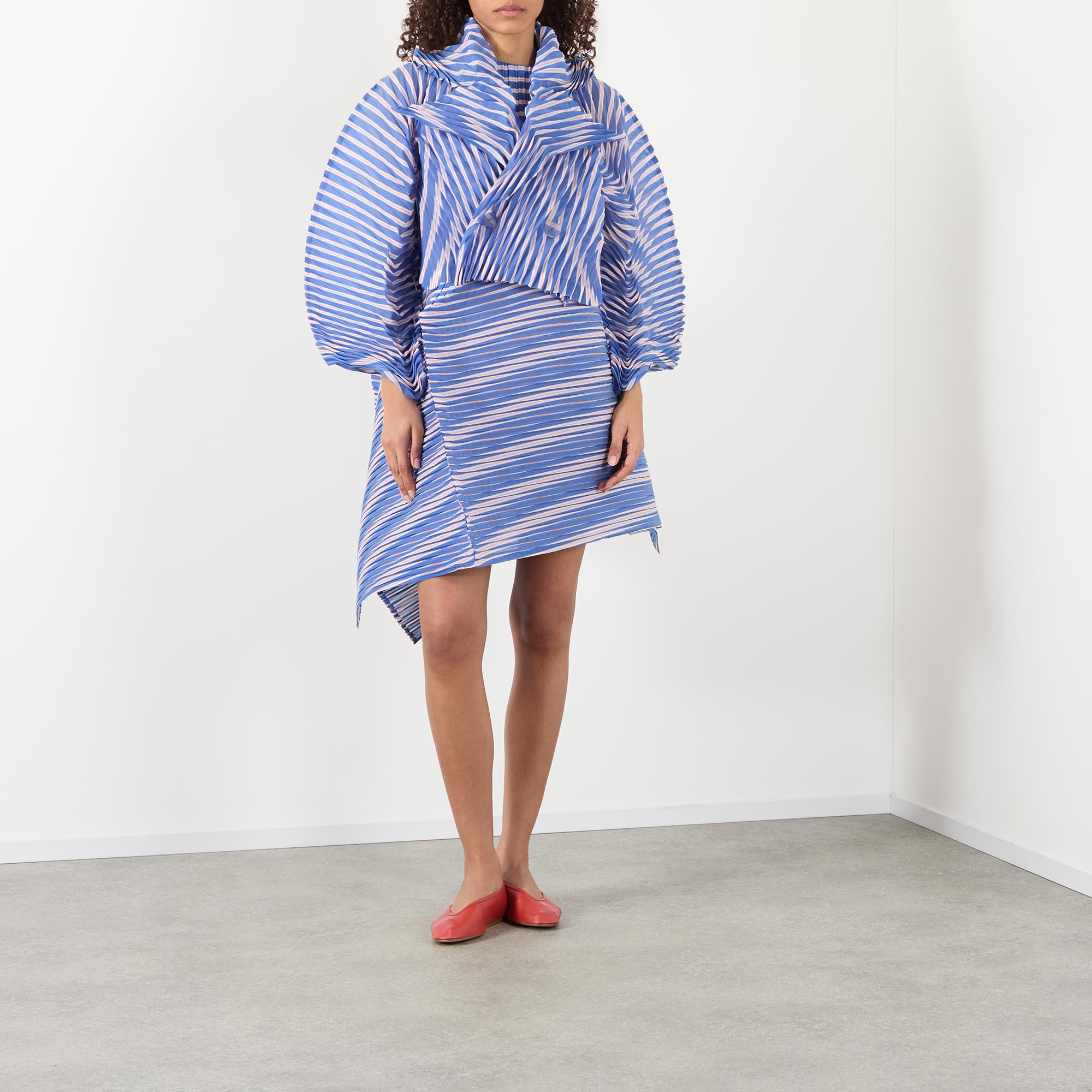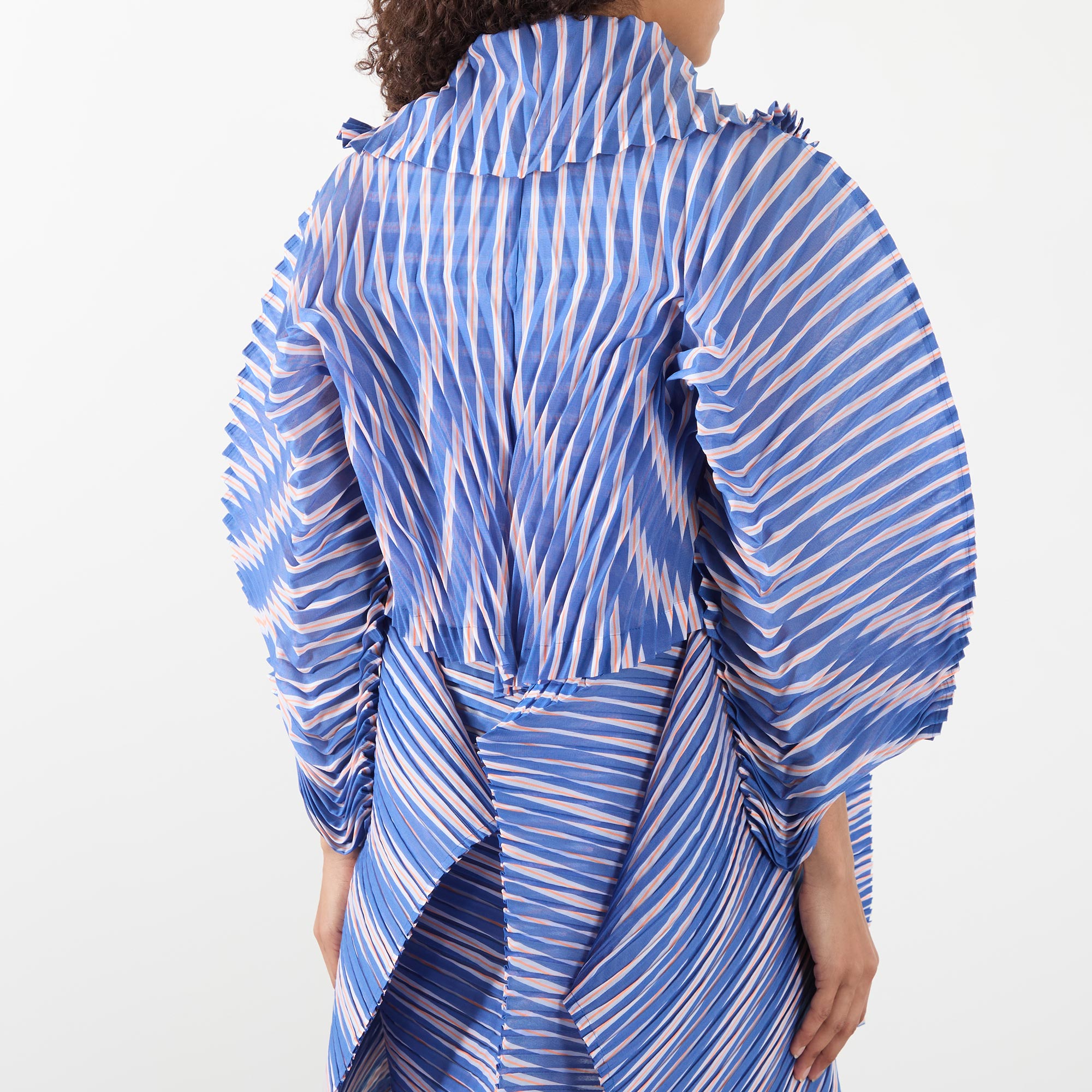 - Long sleeves, double-breasted front, wide notched lapel collar, button fastening, pleated stripe pattern, moiré visual effect, bold sculptural folds, crisp structured silhouette, airy lightweight feel