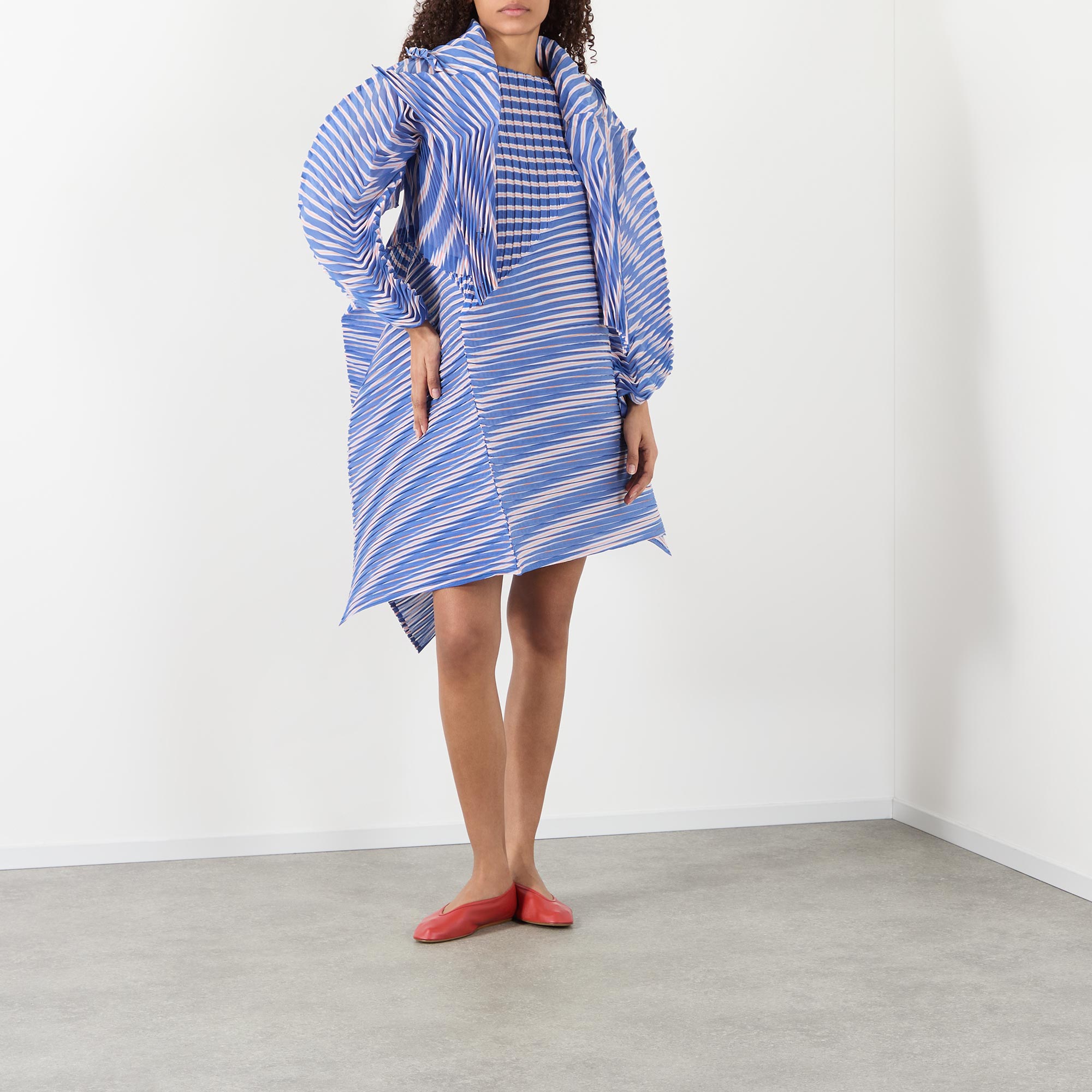 - Sleeveless, round neckline, pleated stripe pattern, moiré visual effect, bold sculptural folds, crisp structured silhouette, airy lightweight feel, mini length