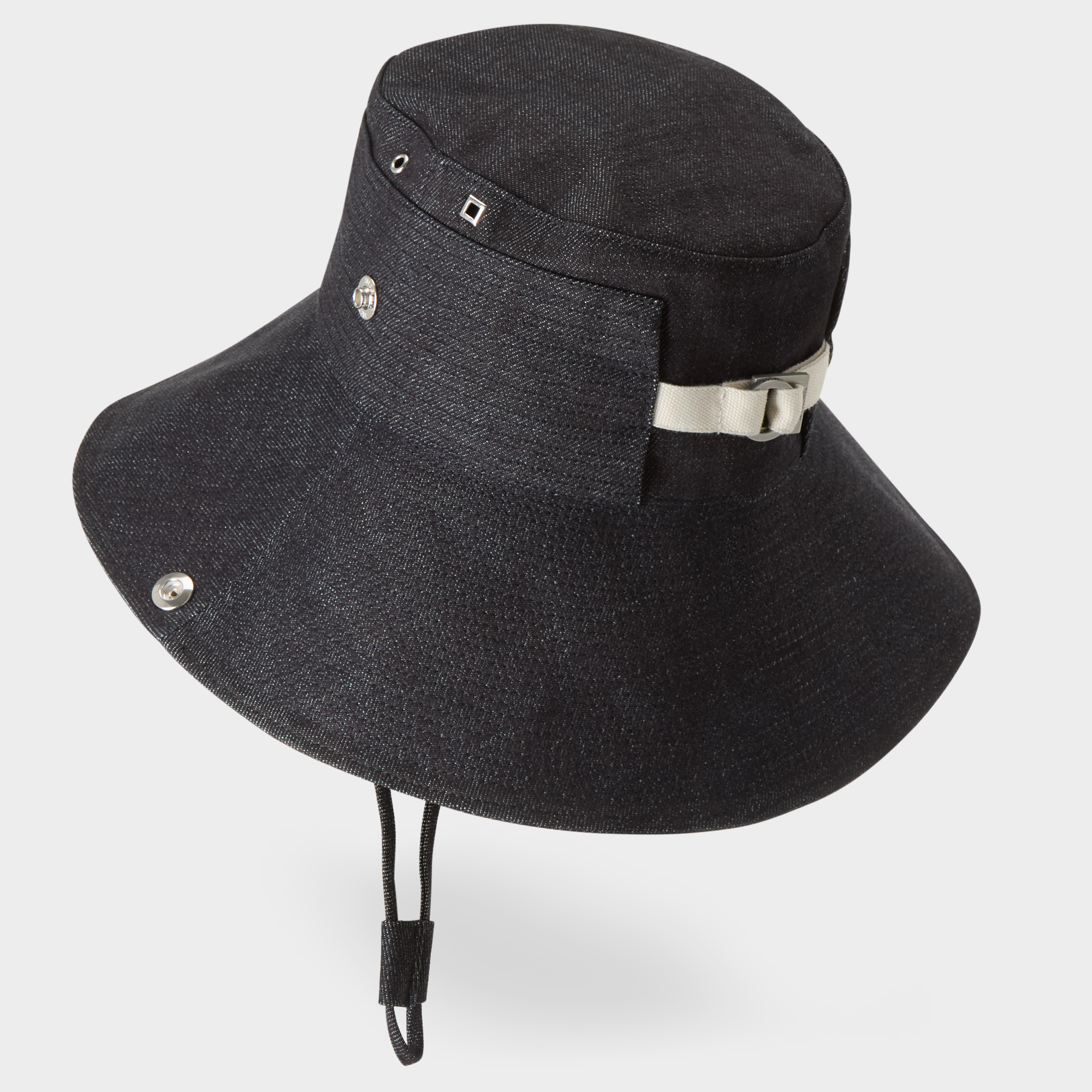• Bucket style, stitched details, long adjustable strap, side snaps, ventilation grommets, logo details, circle and square loop drawstring at back, lined