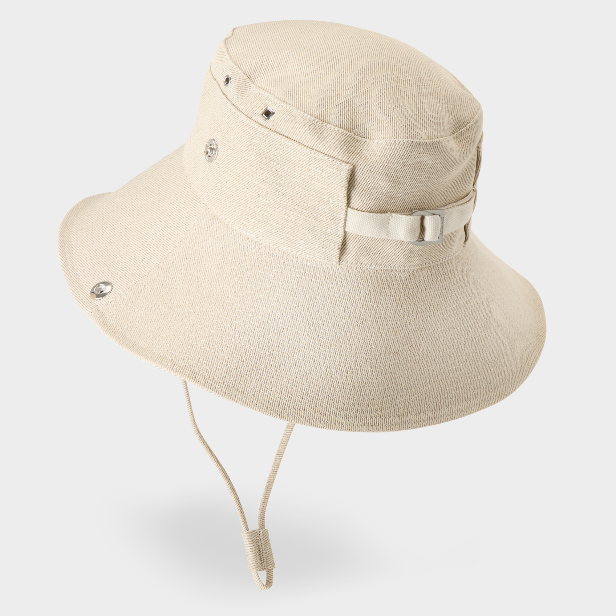 - Bucket style, stitched details, long adjustable strap, side snaps, ventilation grommets, logo details, circle and square loop drawstring at back, lined