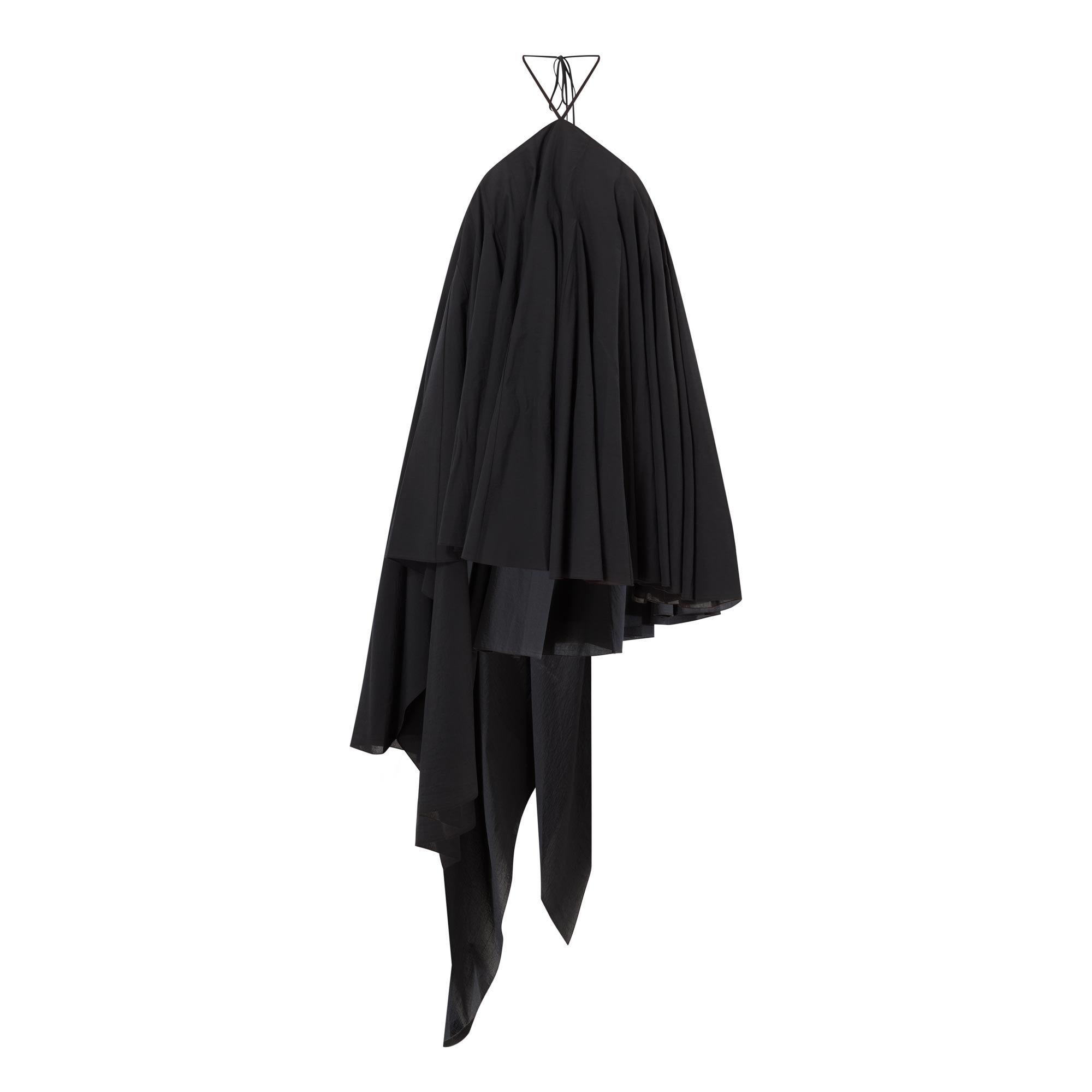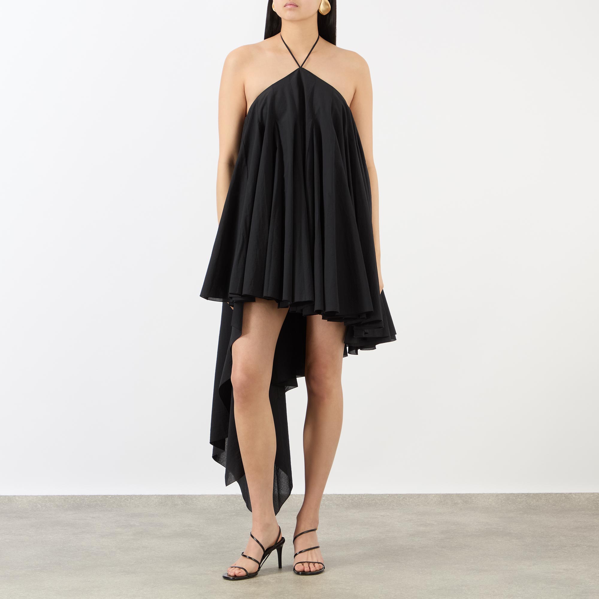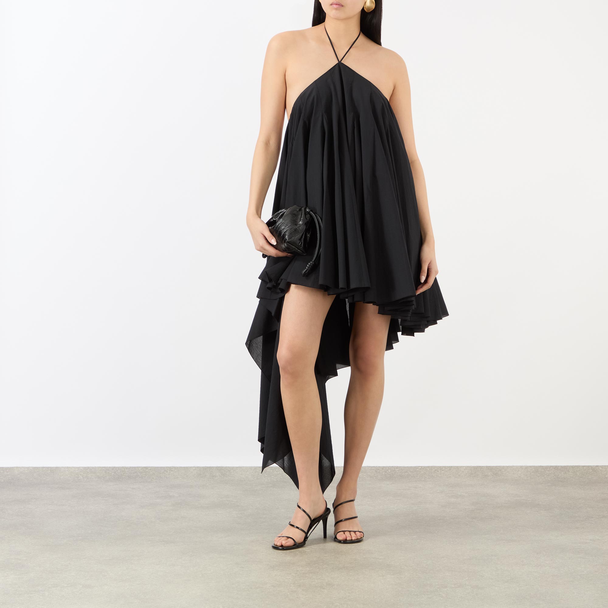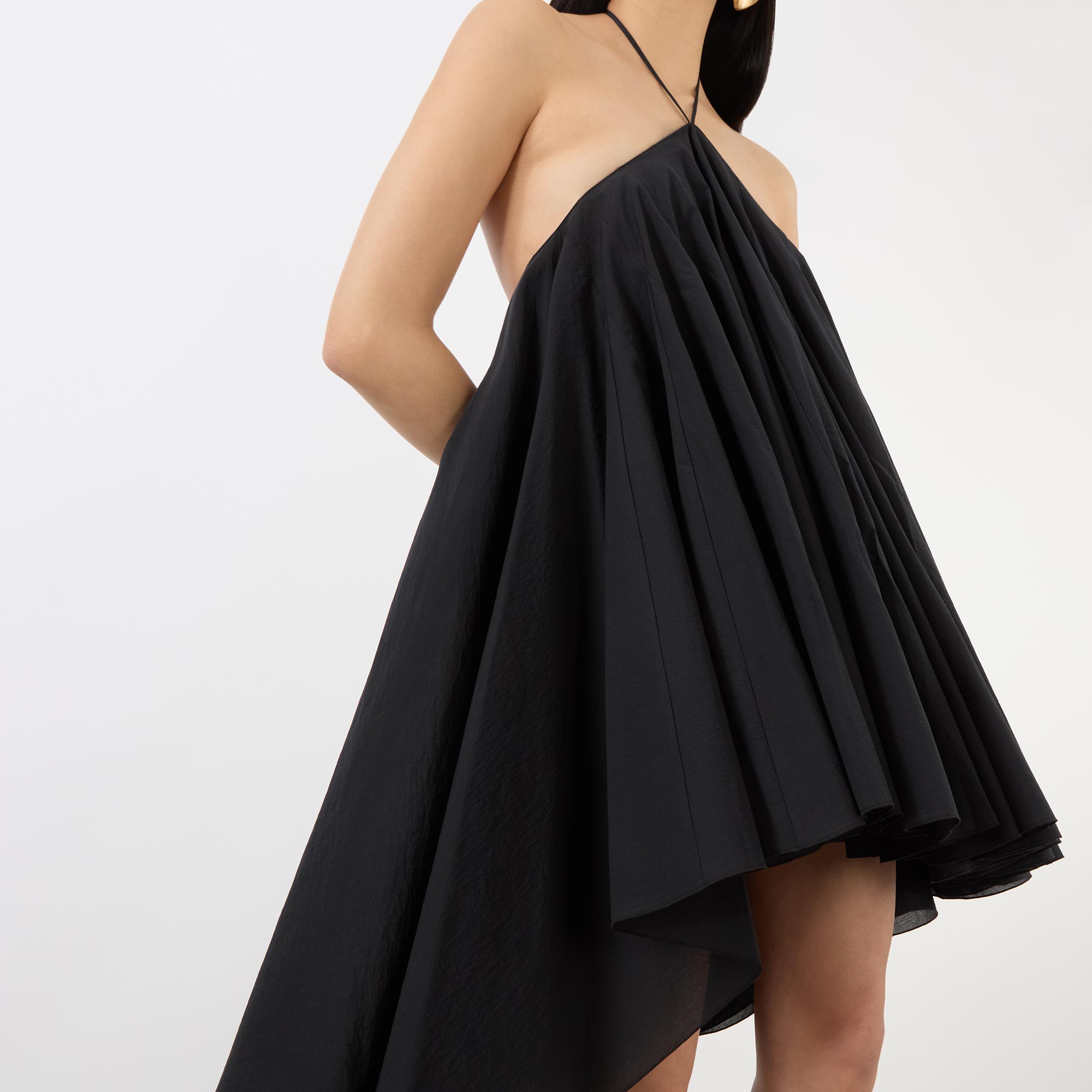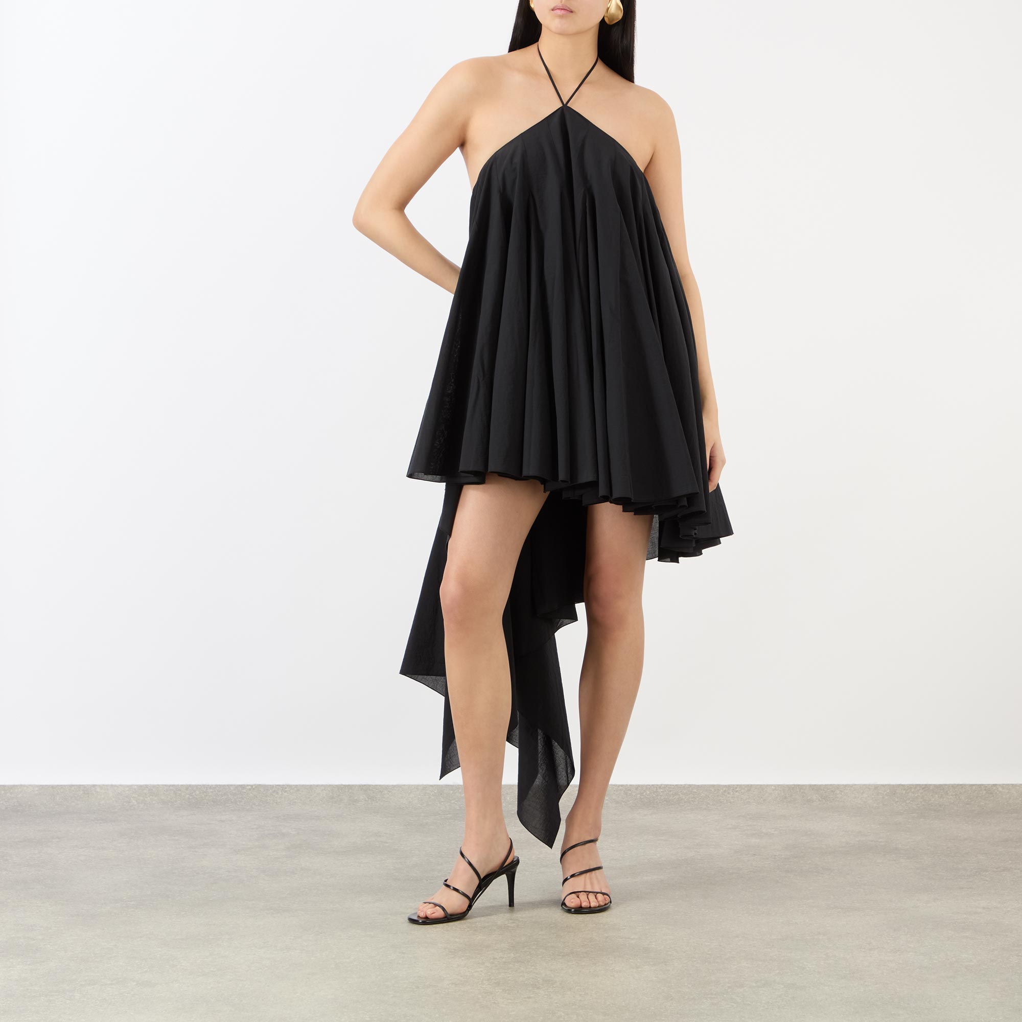 - Halter straps with self-tie fastening, peaked neckline, mini length, asymmetric hemline, voluminous shape, sleeveless, low back, fully lined