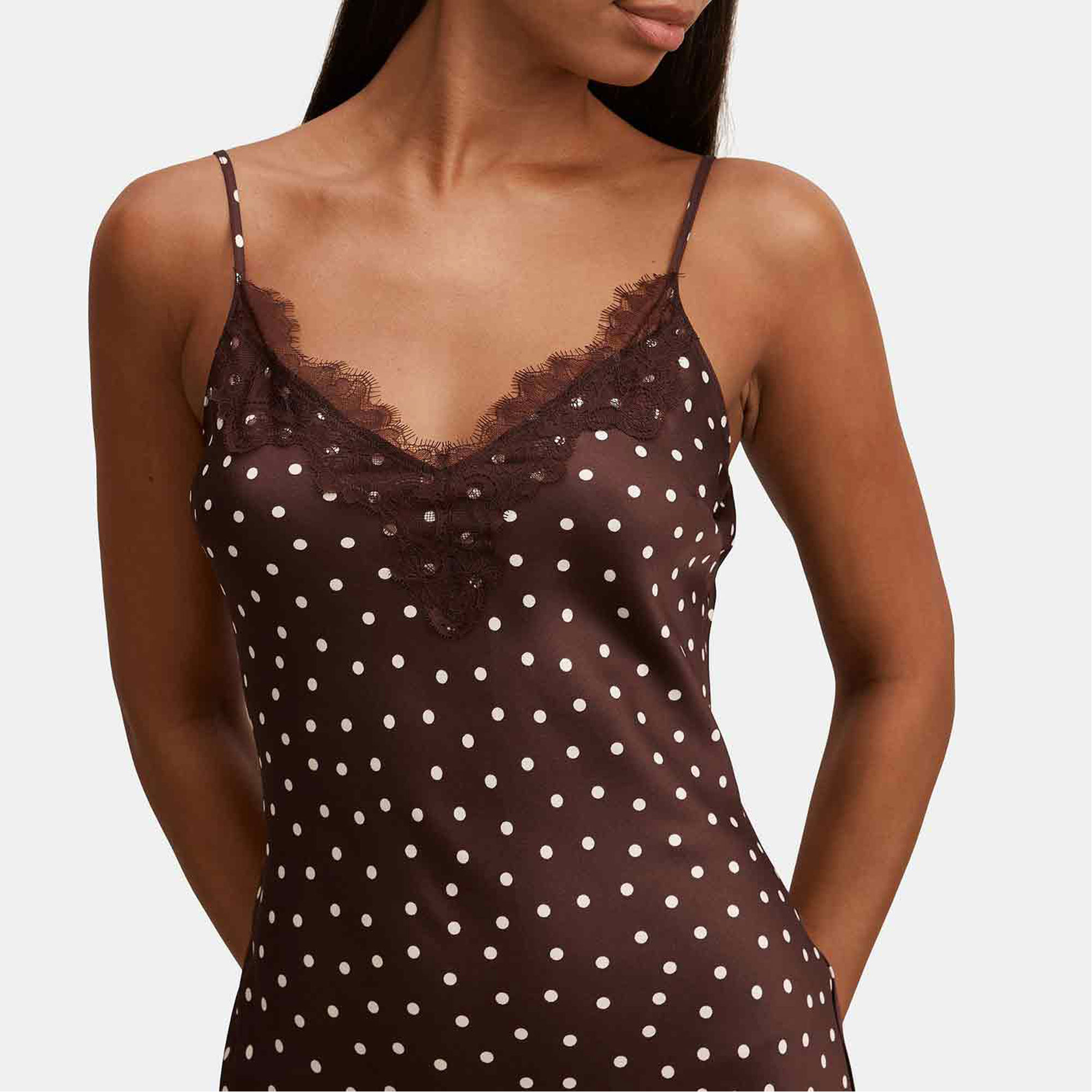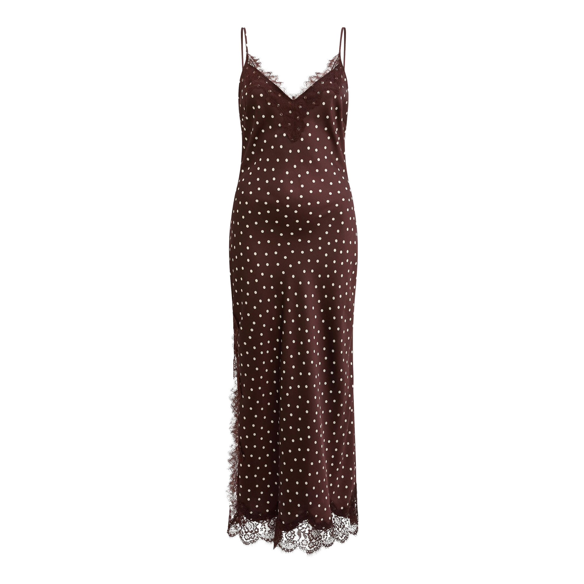 - V-neck, leg split, lace trim, dotted