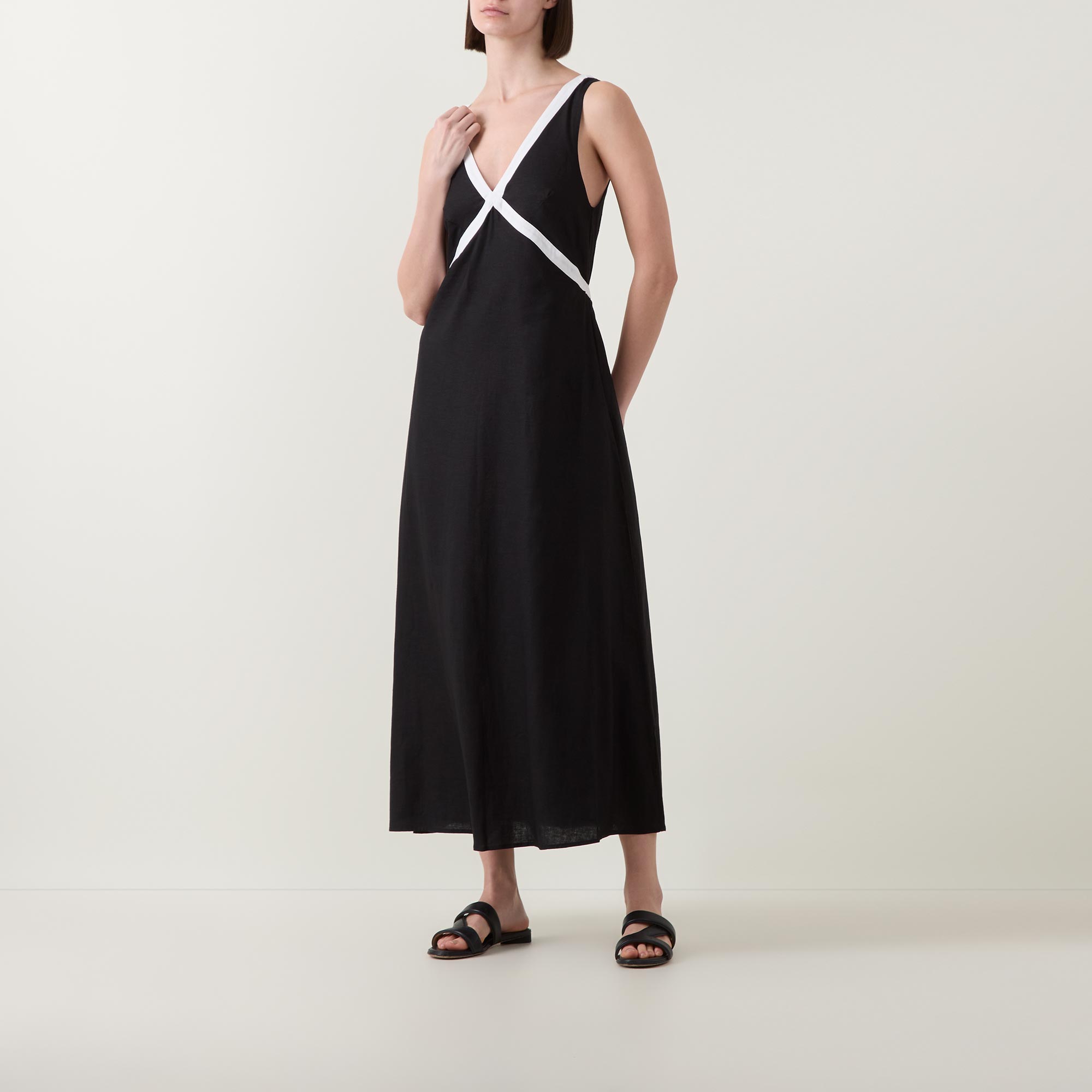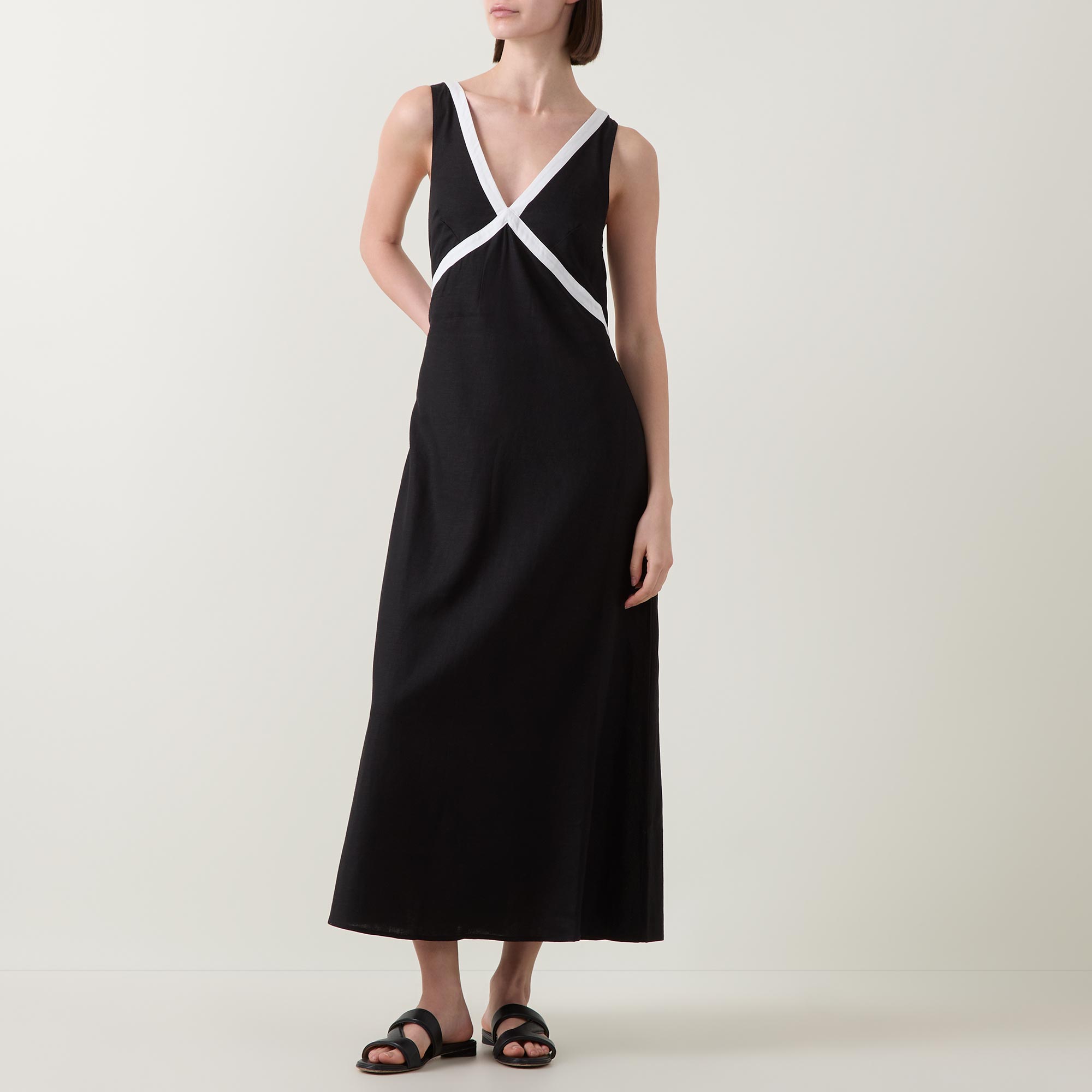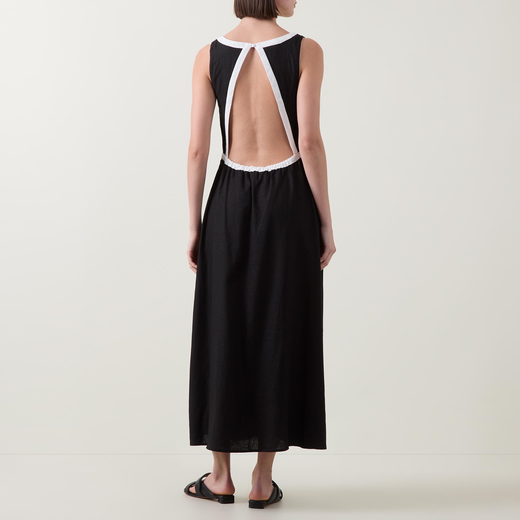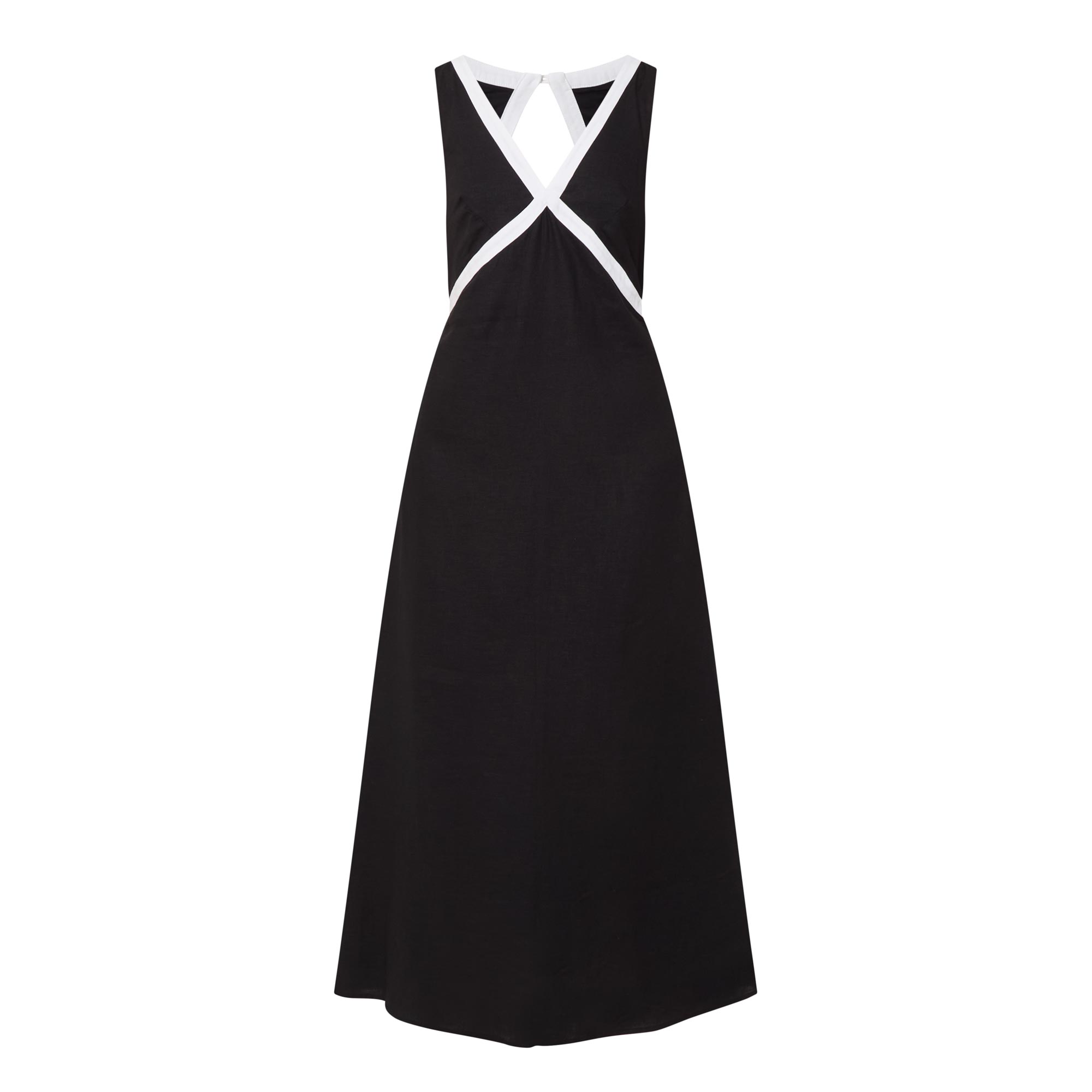 - V-neckline, rear button closure, sleeveless design, cut-out design, elasticated back, flared skirt, contrast trim detailing, midi length