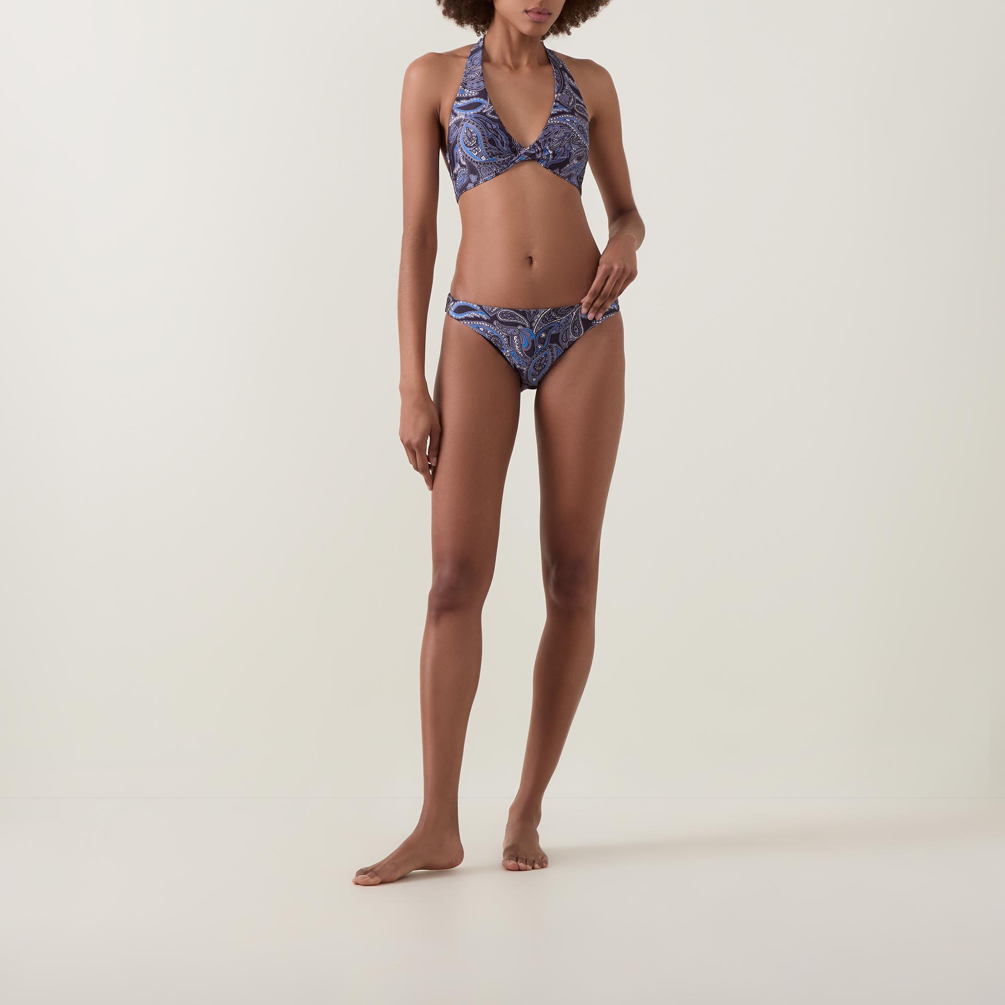 - Removable cups, side boning, all-over paisley print, twist front detail, halterneck, two tie fastenings