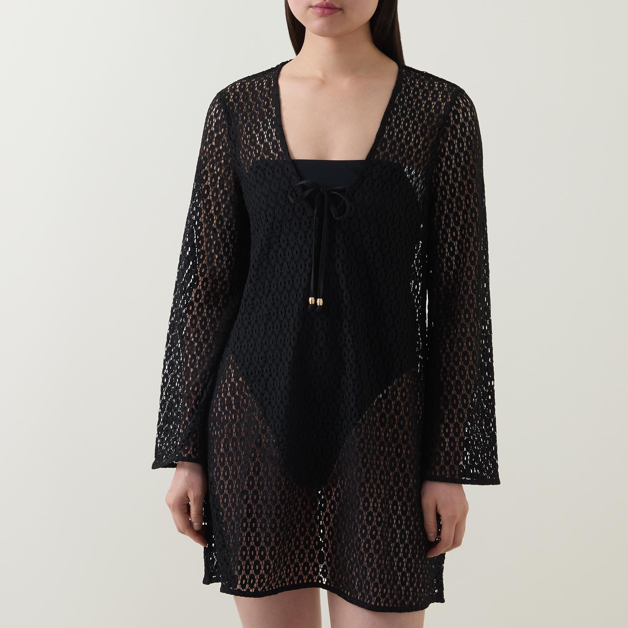 - Low V-neckline, long wide-cut sleeves, mini length, tie fastening, crochet structure