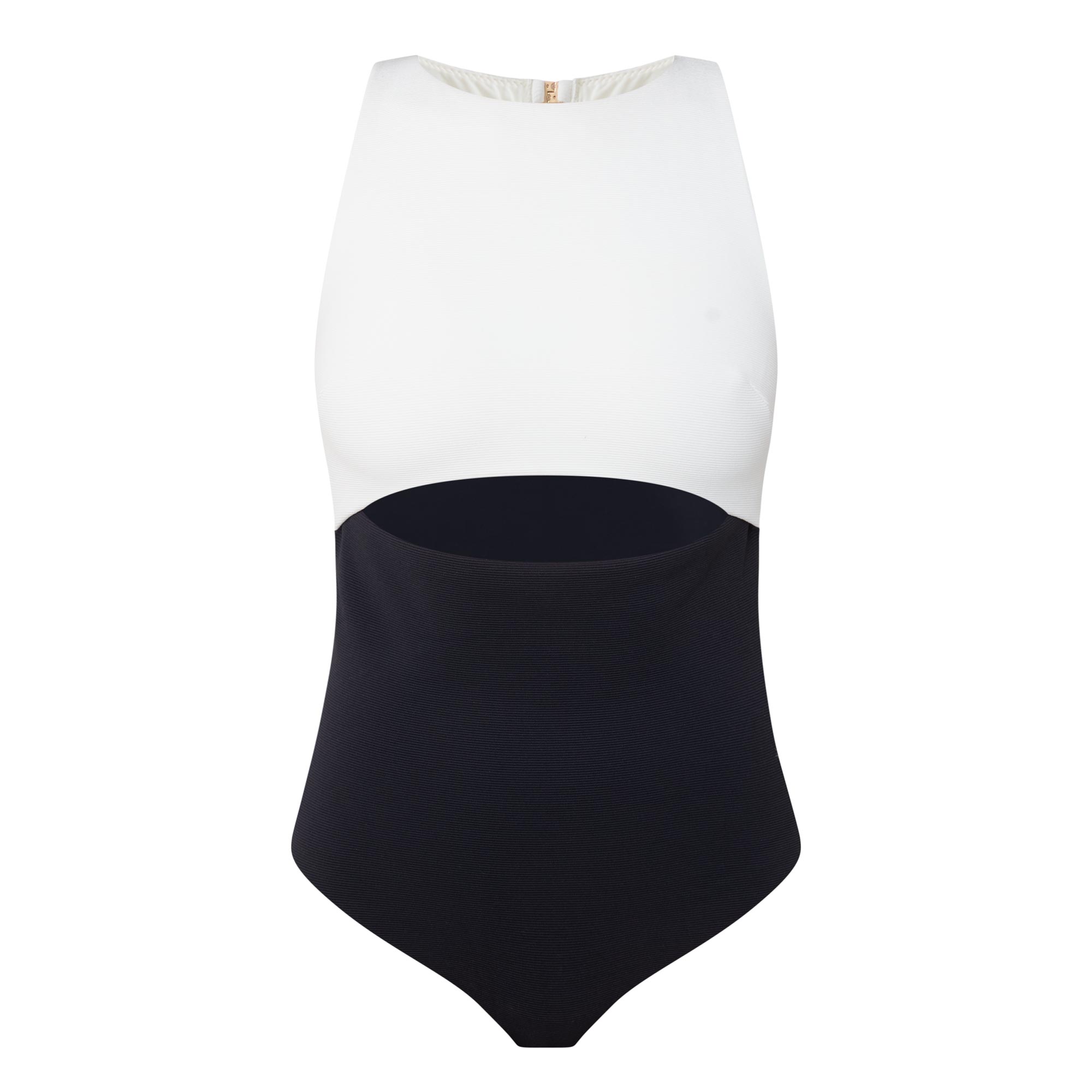 - One-piece design, two tone colour scheme, round neckline, front cut-out panel, back fastening clasp with cut-out panel, medium-cut leg, moderate rear coverage, smooth seamless finish