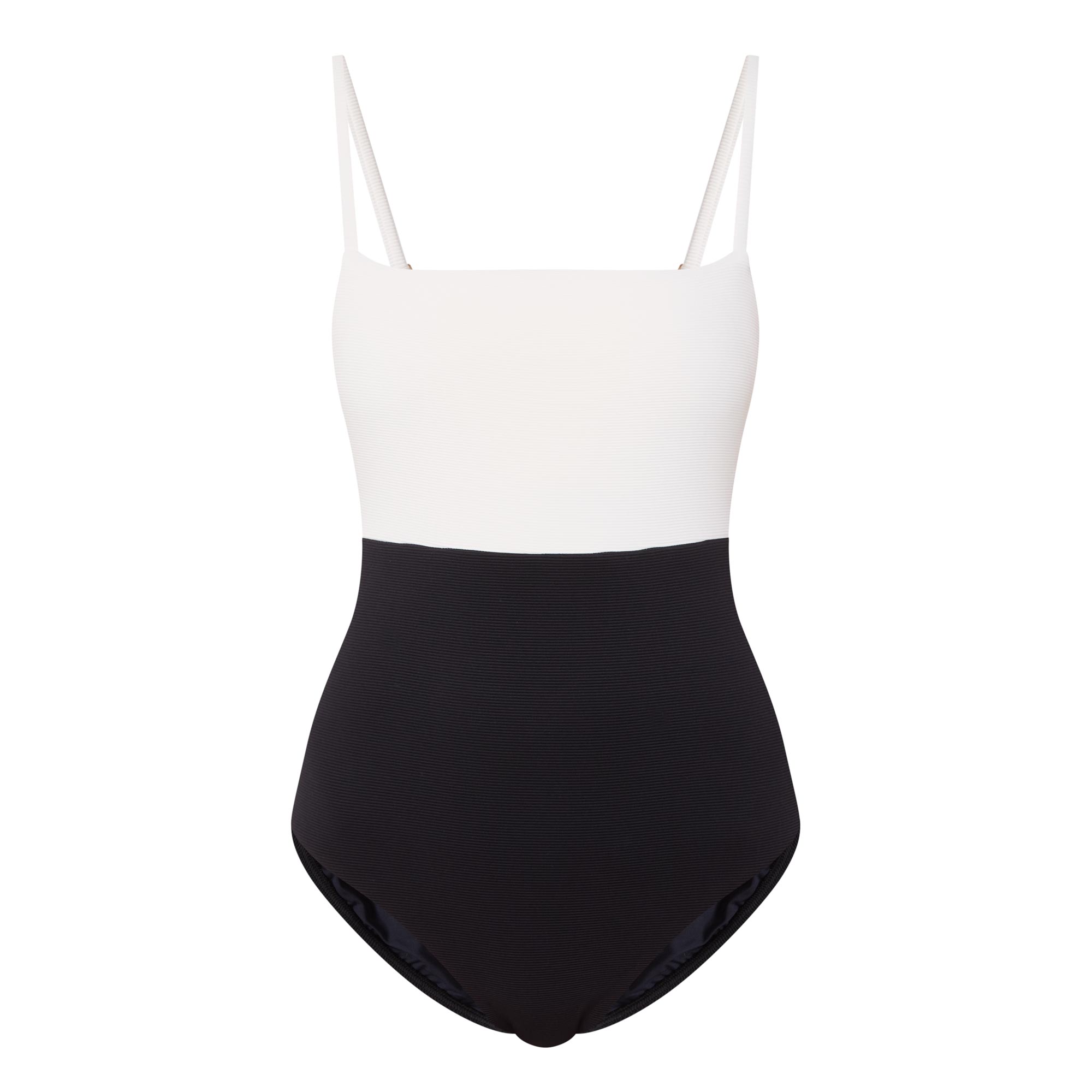 - Straight neckline, narrow adjustable straps, moderate coverage, two-tone design, smooth finish