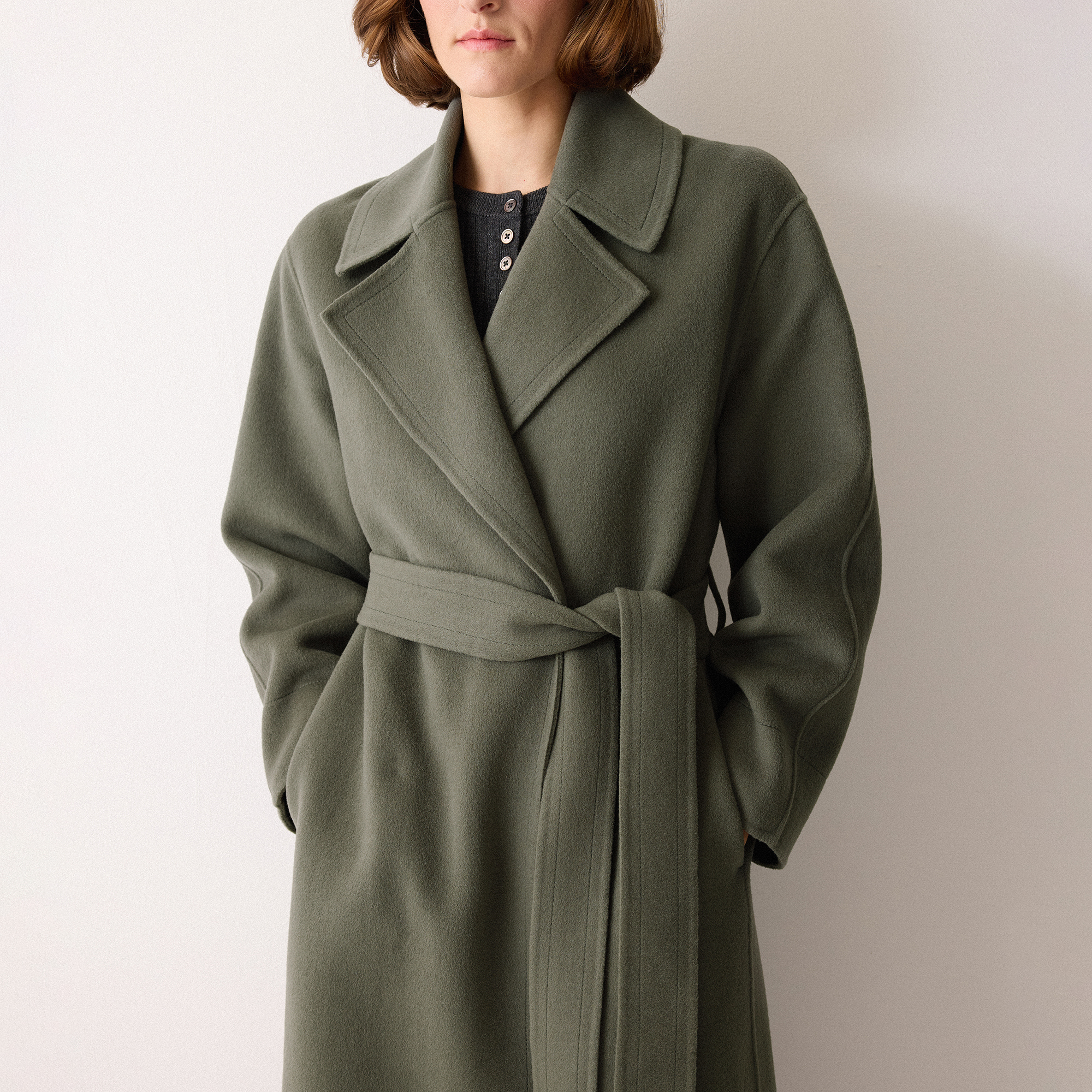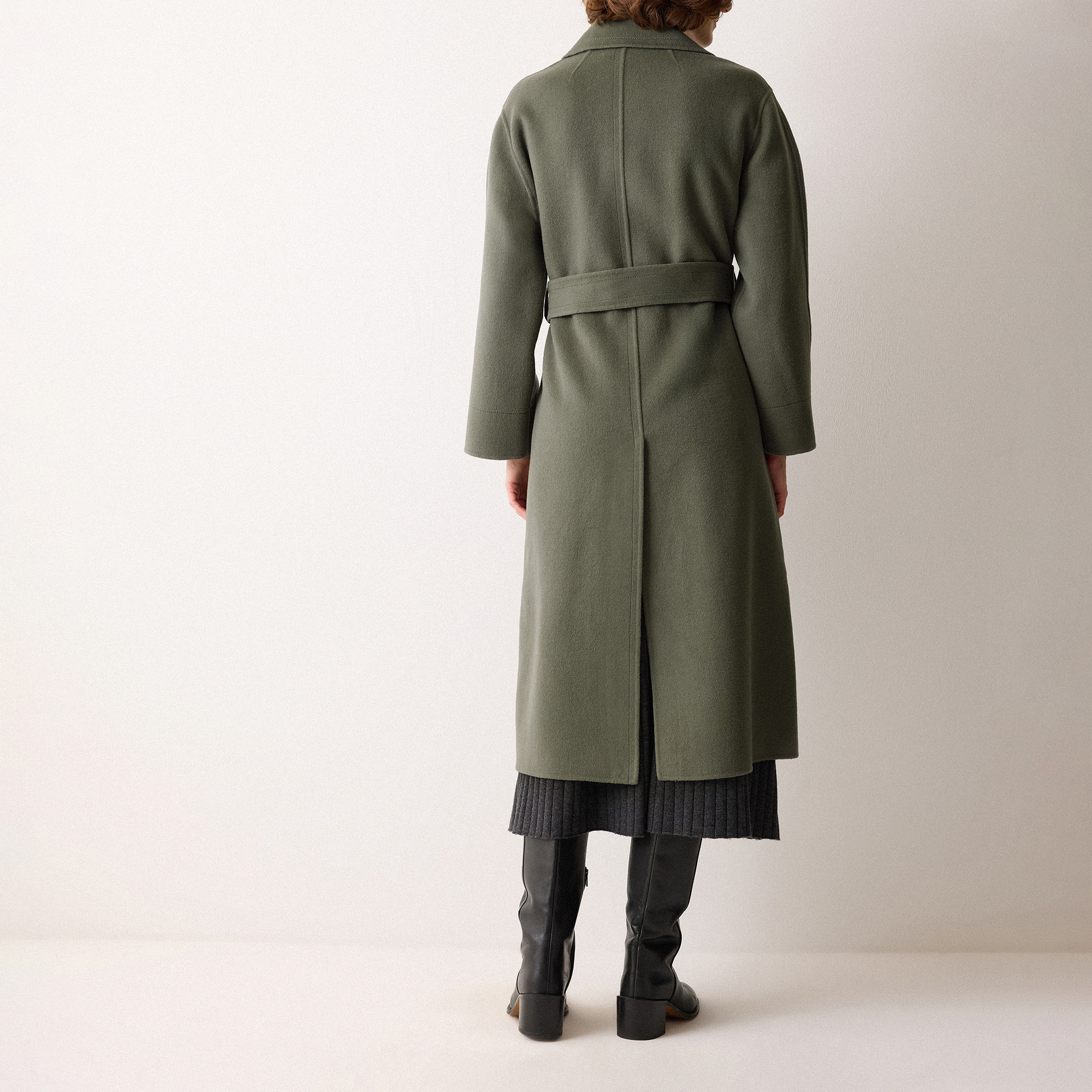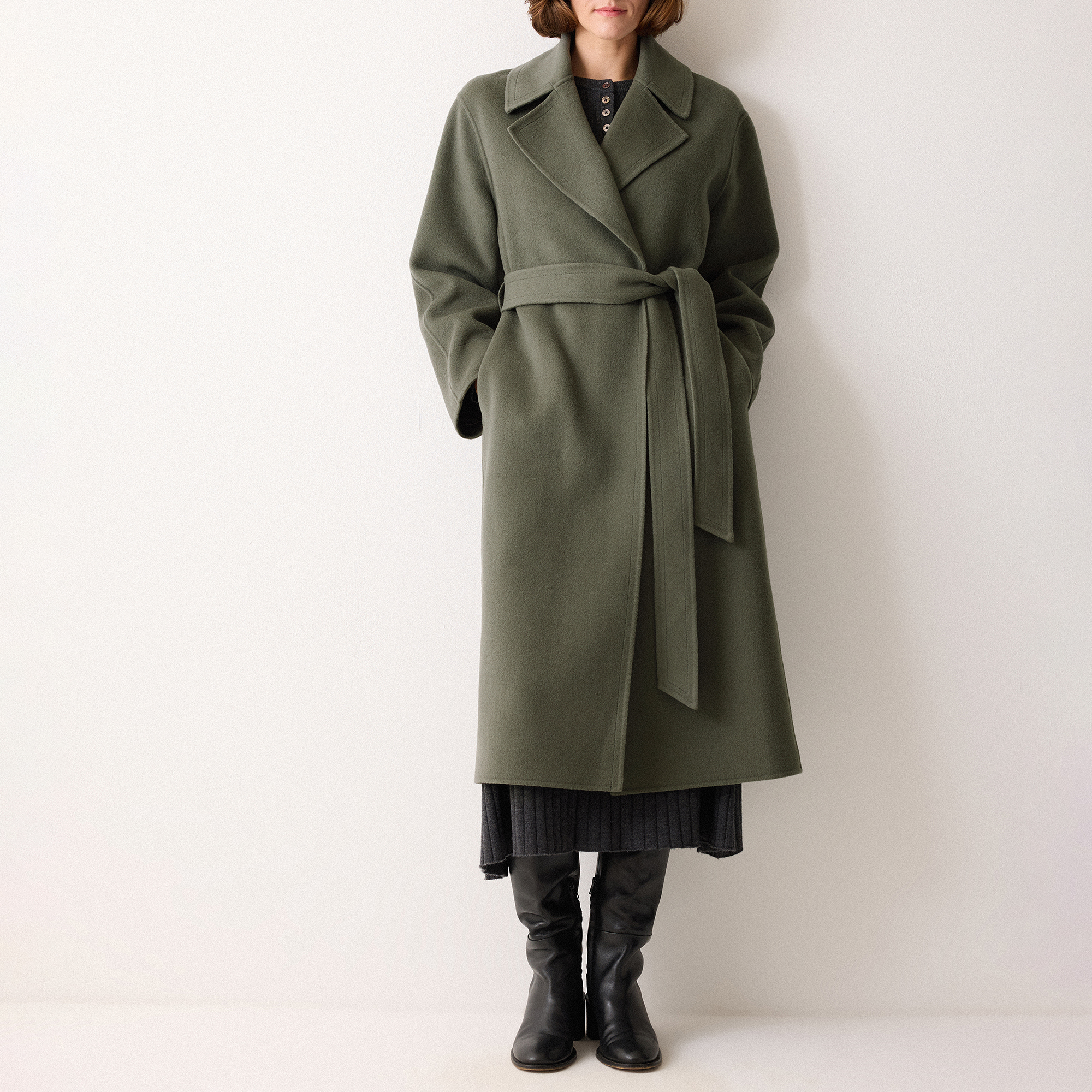 - Wrap style, midi-length, detachable waist belt, double-faced fabric with secret stitching