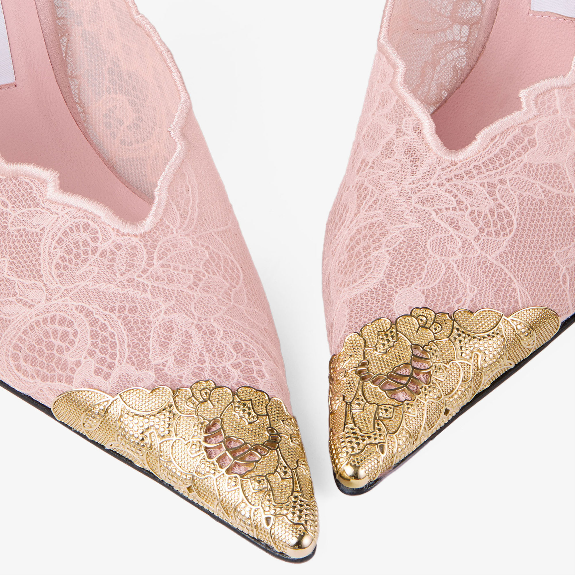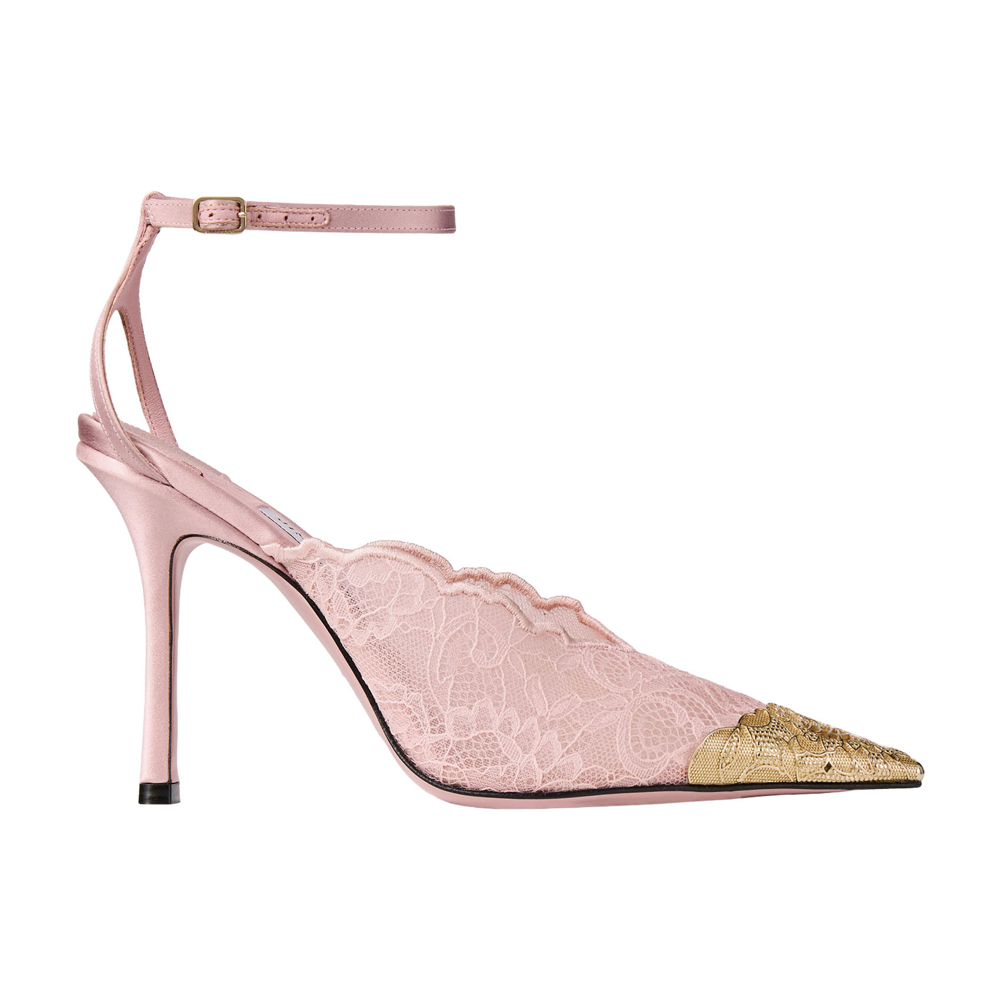 • Lace detailing, gold-tone metal toe cap, stiletto heel, adjustable ankle strap, pointed toe