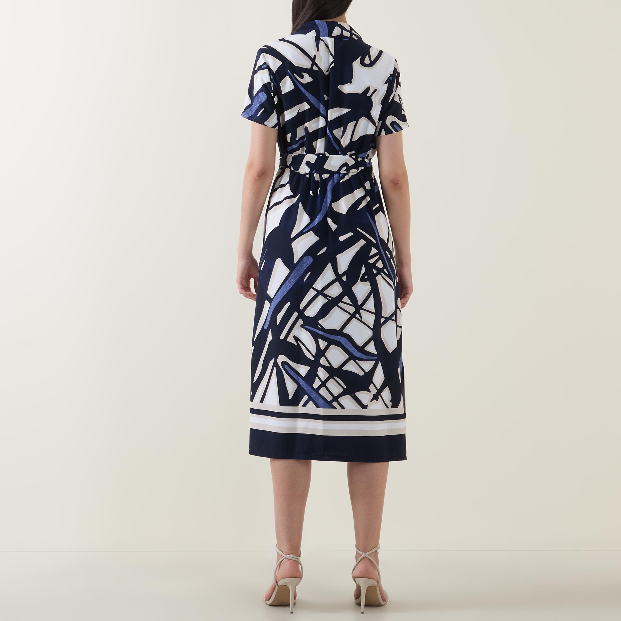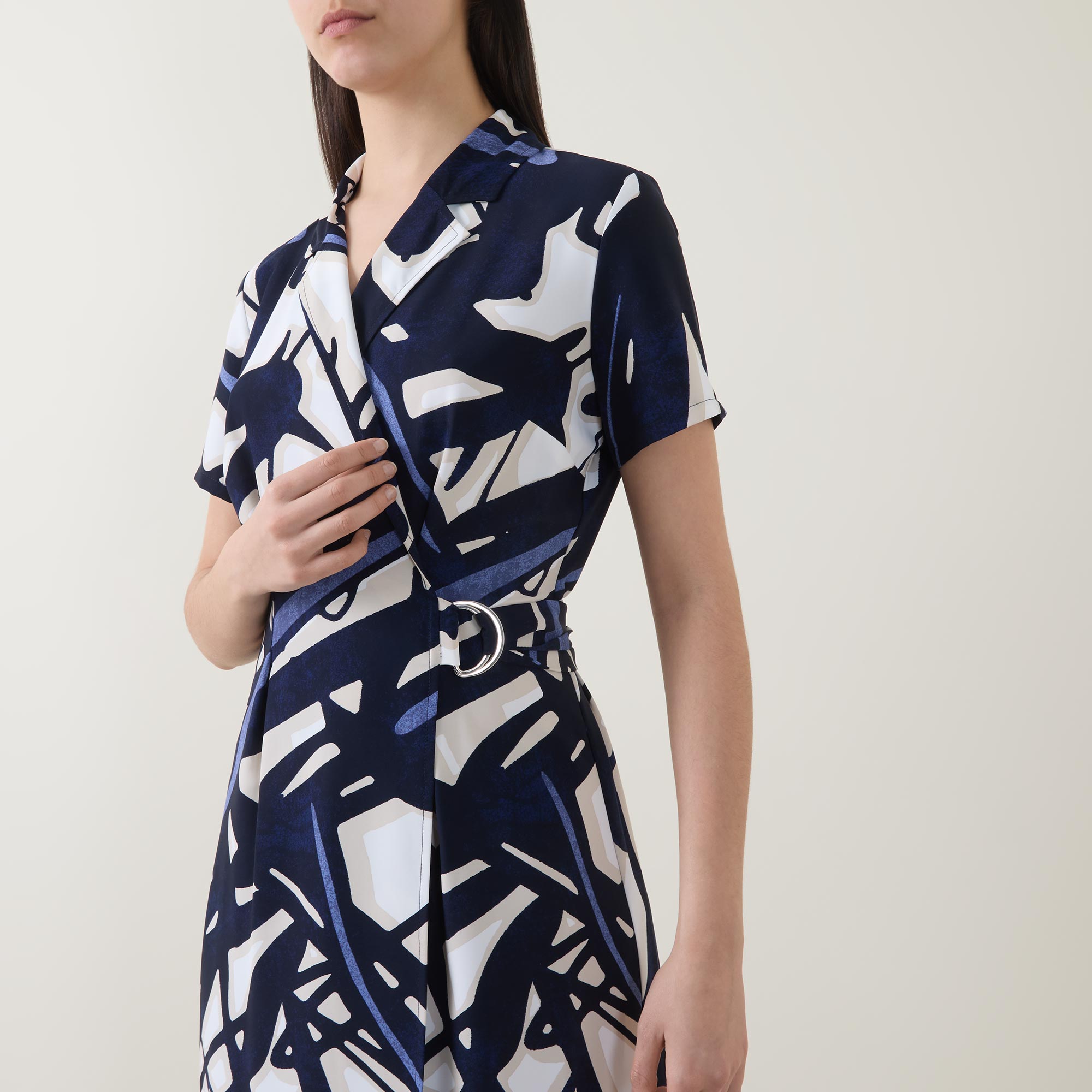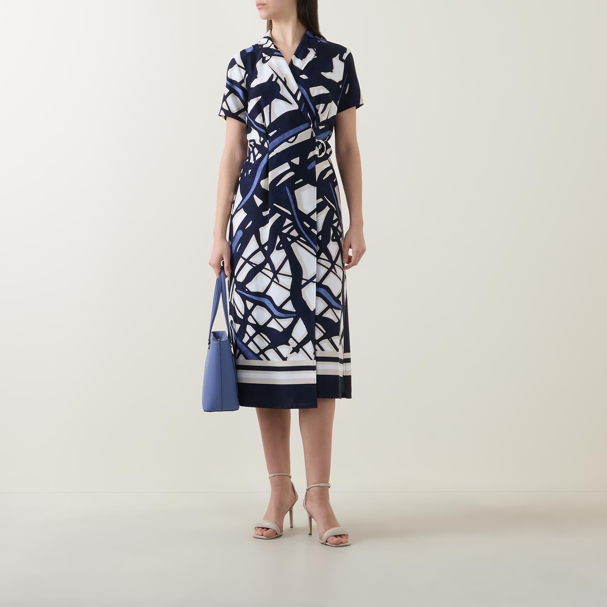 - Abstract print, wrap design, short sleeves, notched collar, D-ring detail, midi length