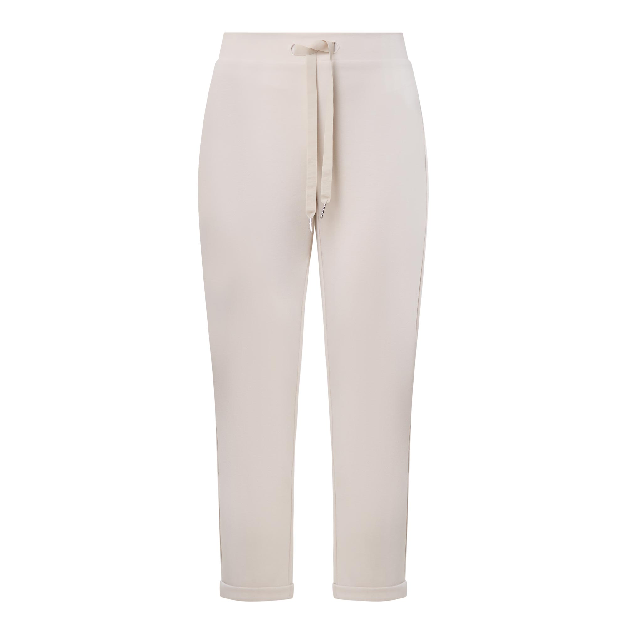 • Mid rise, slim leg, cropped length, covered waistband, adjustable drawstring fastening, turn up hems, logo hardware, smooth finish