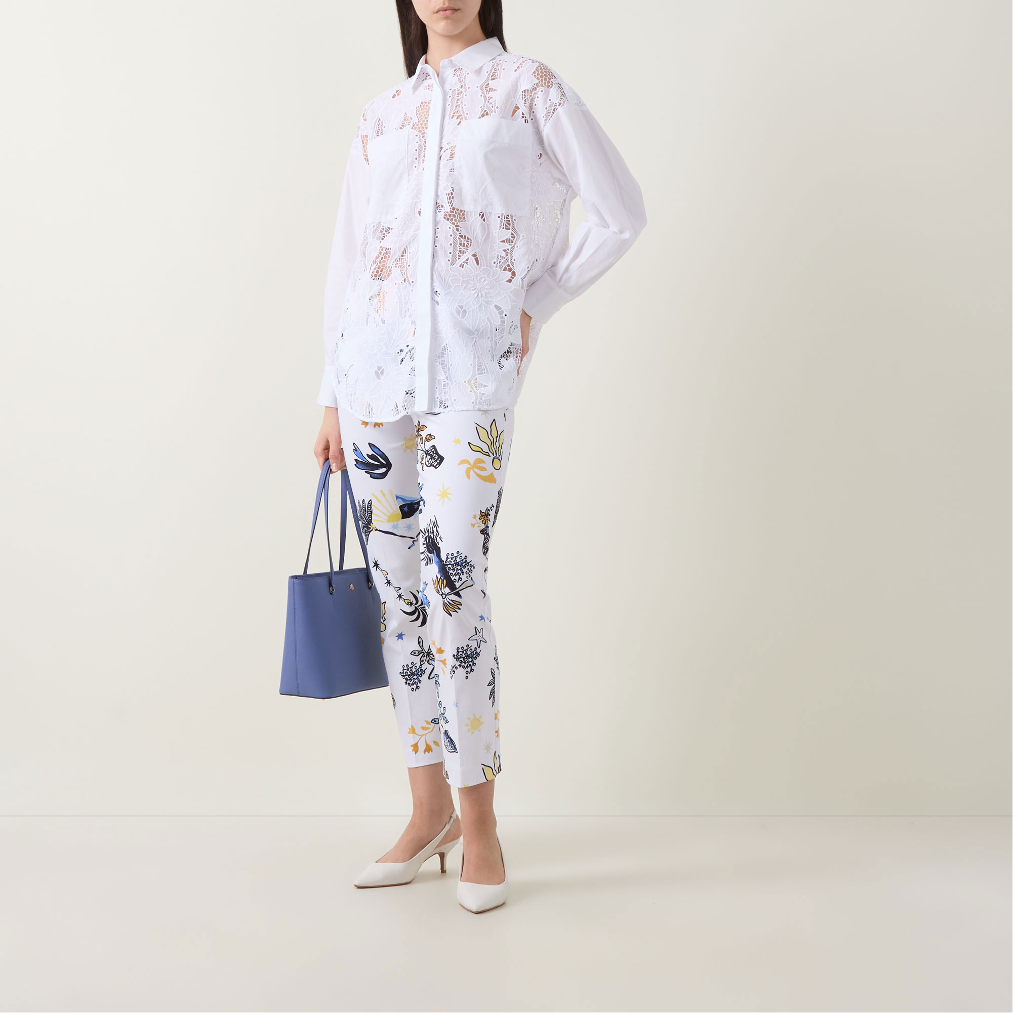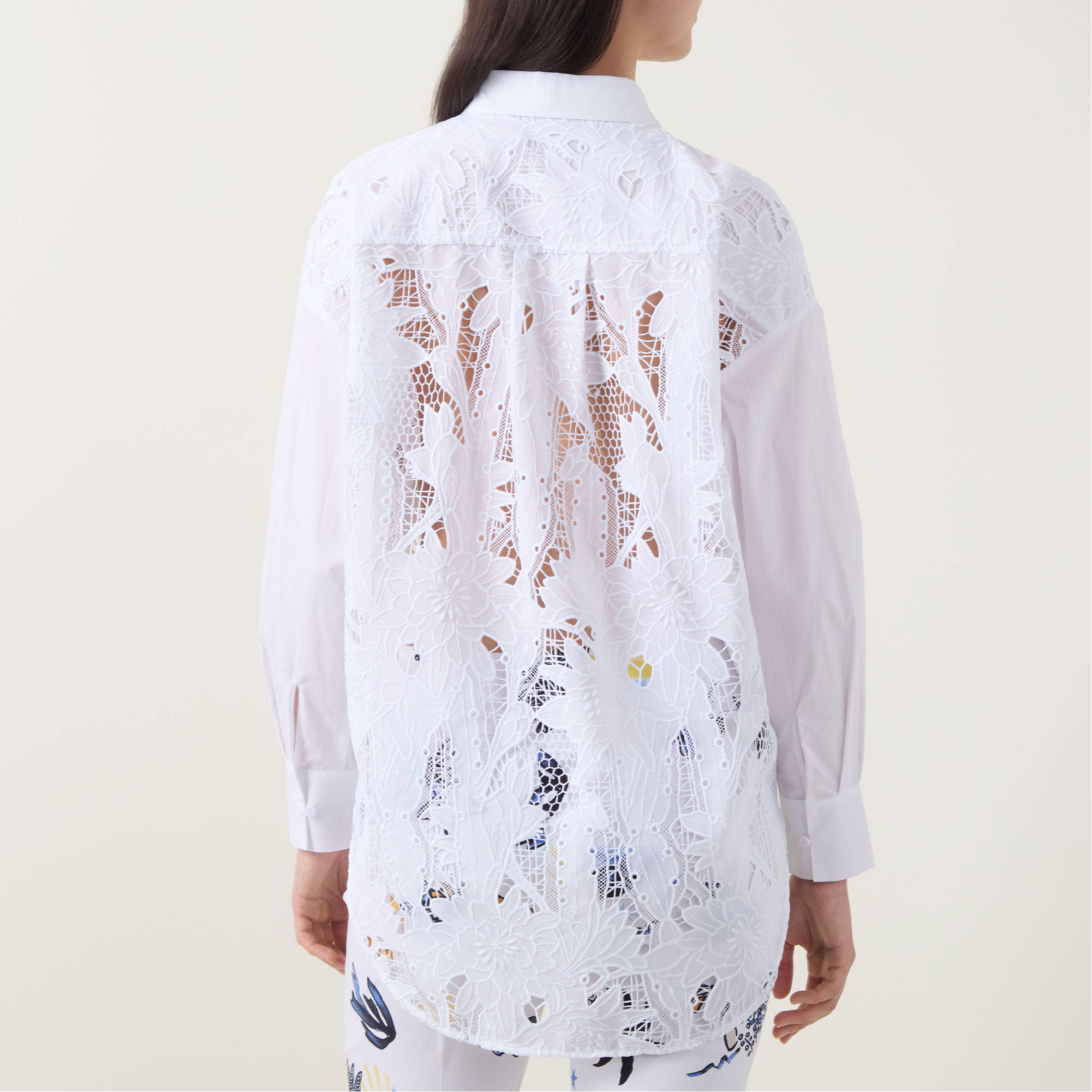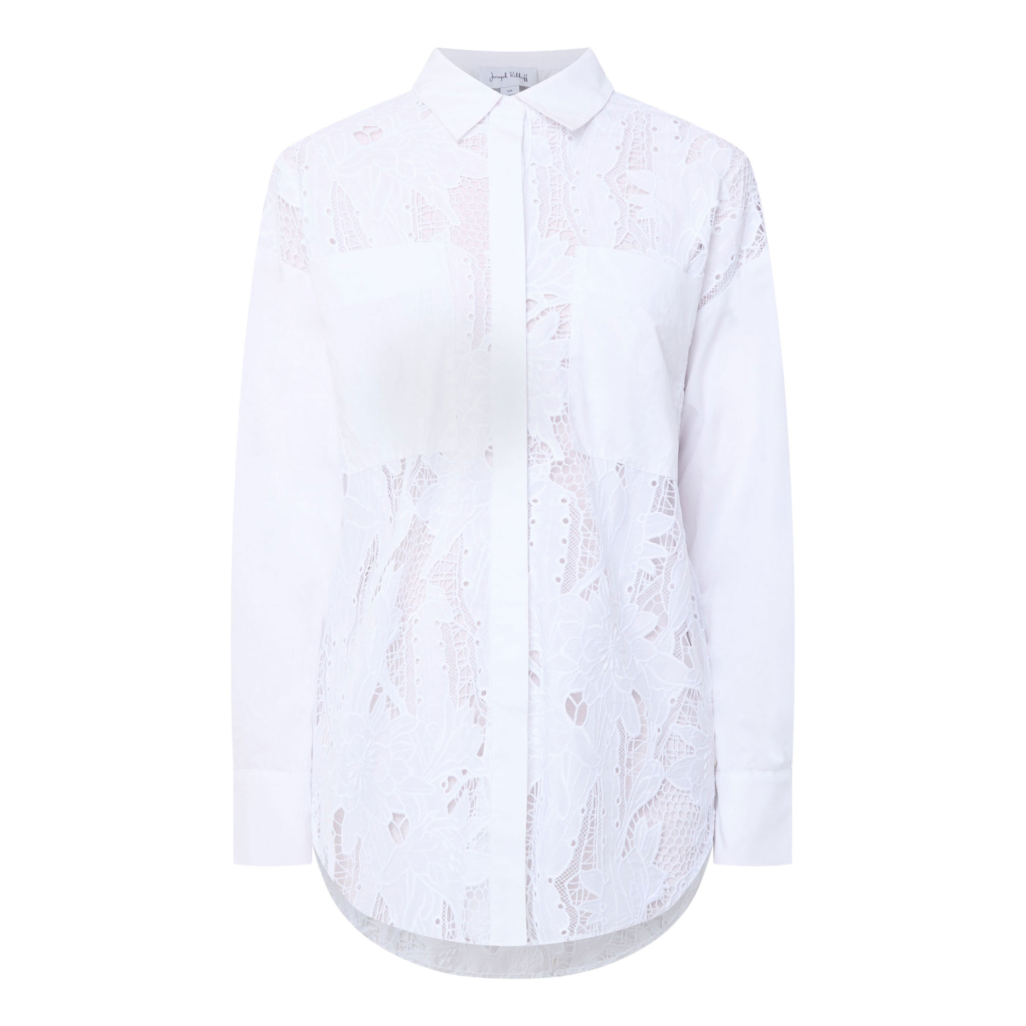 - Classic collar, long sleeves, single-cuffs, curved hemline, concealed button fastening, part-lined, box-pleat to the back, chest patch pockets, floral lace pattern
