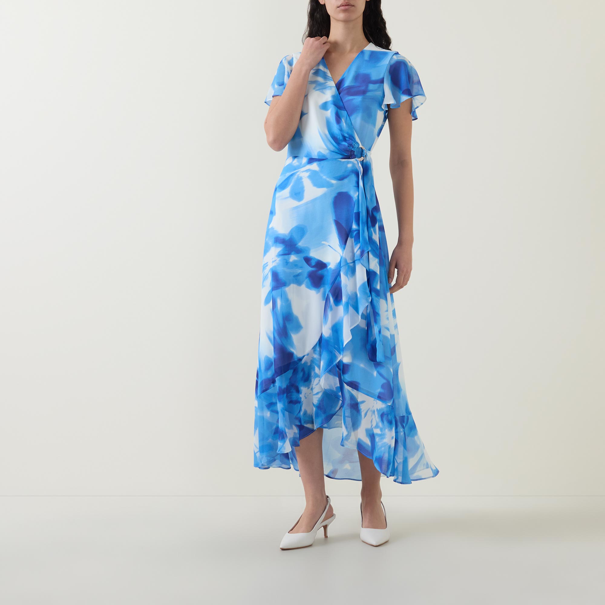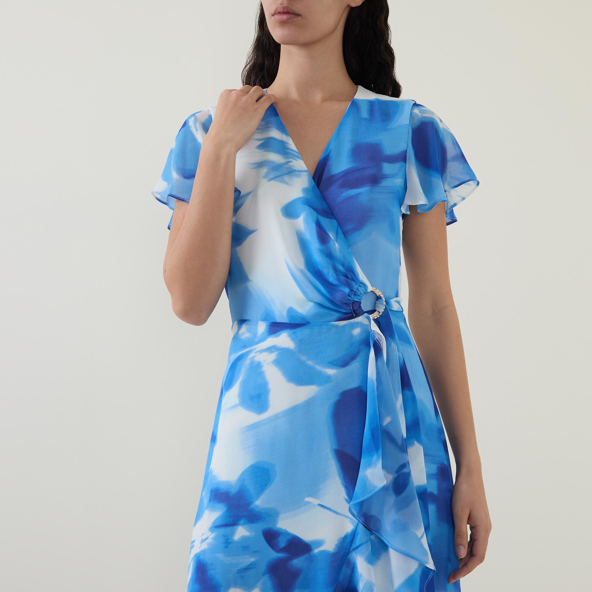- Wrap-style, rhinestone embellished ring detail, sash-tie fastening, ruffle detail at bodice hem, lined, short sleeves, midi length, floral pattern