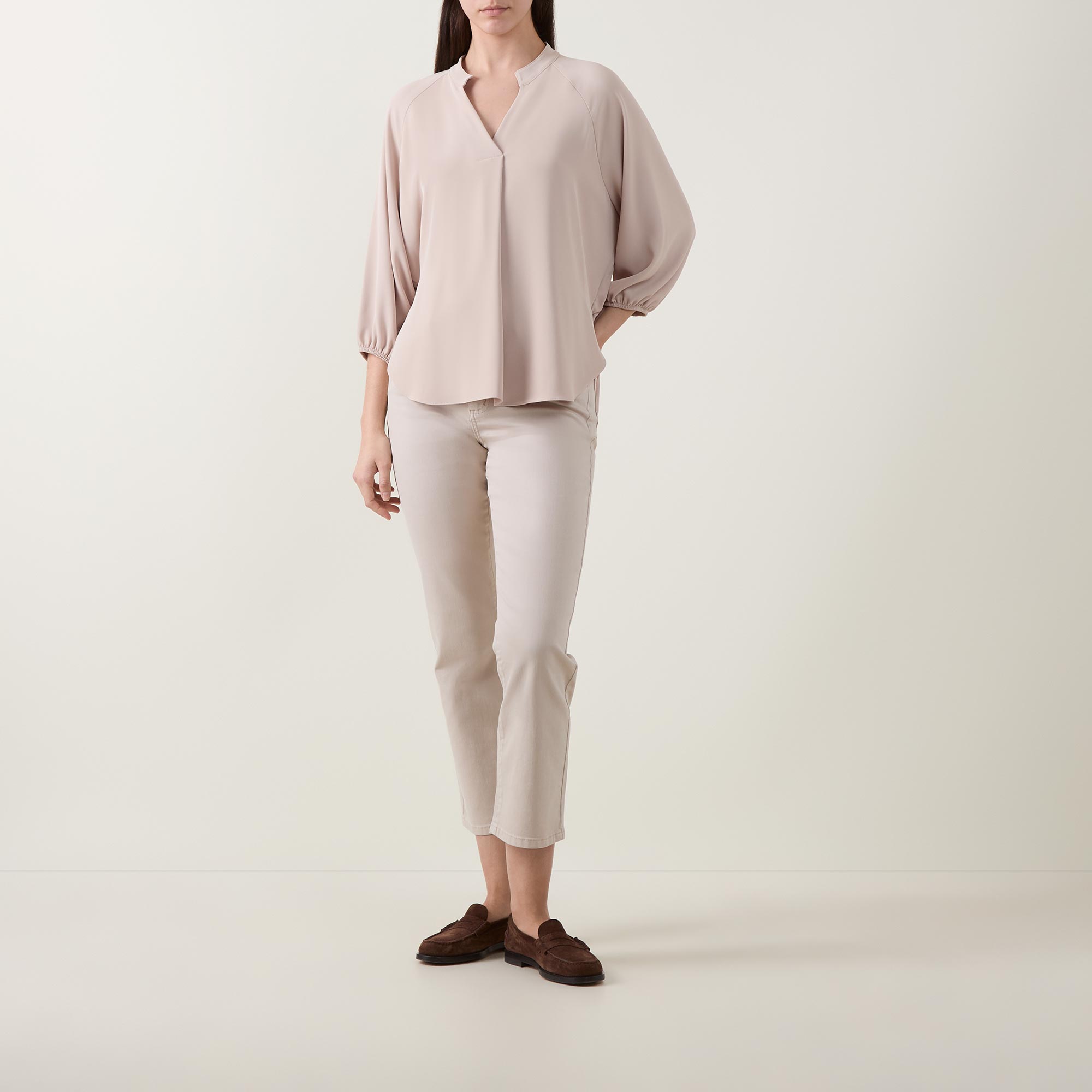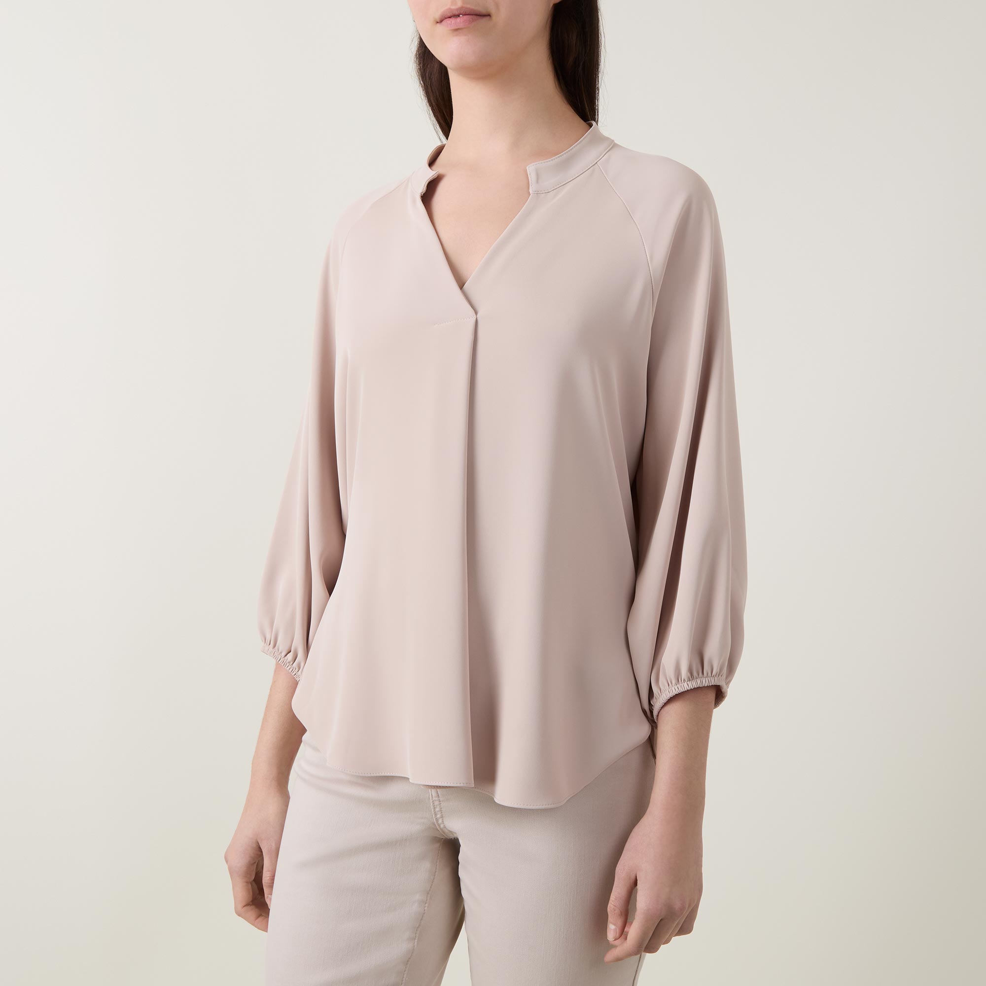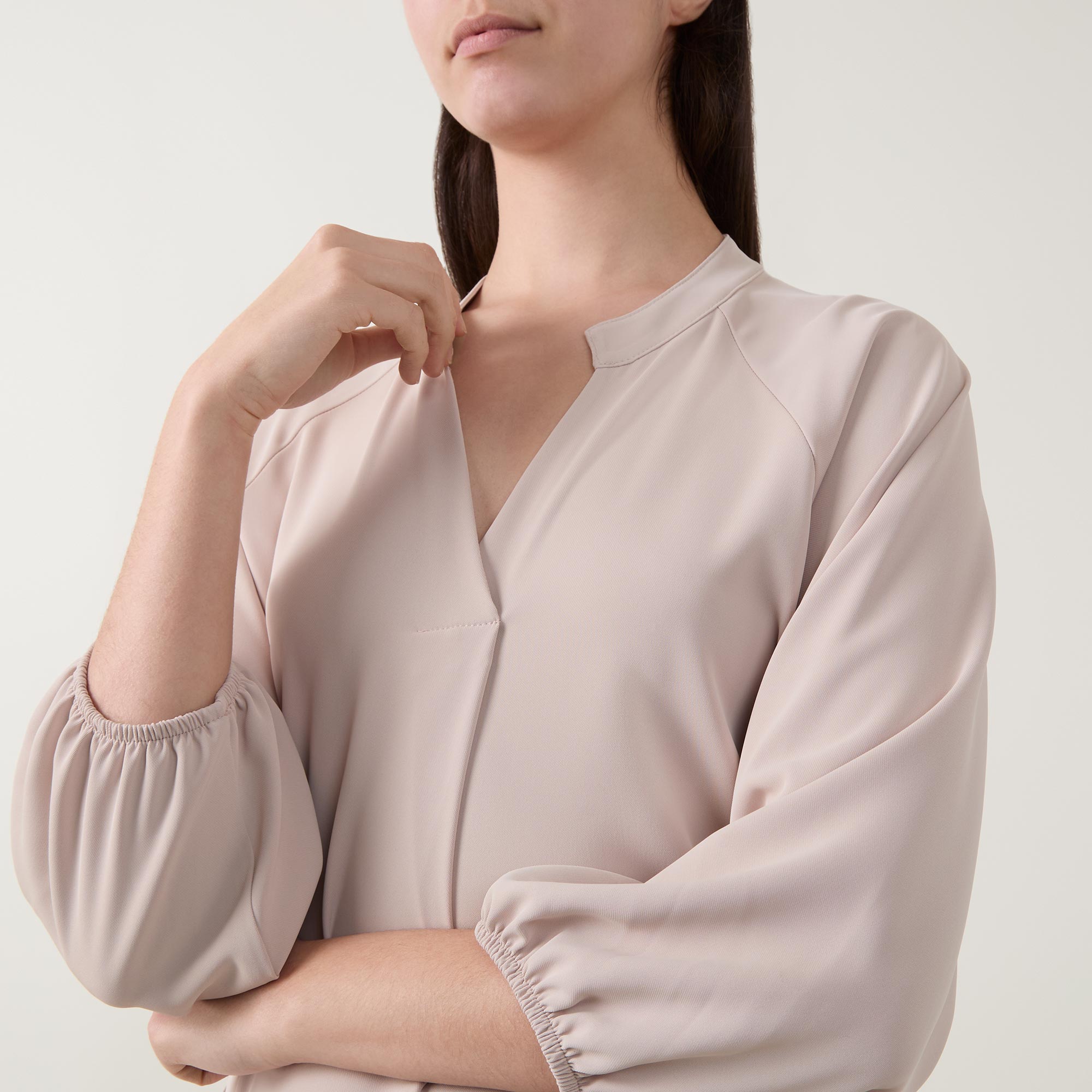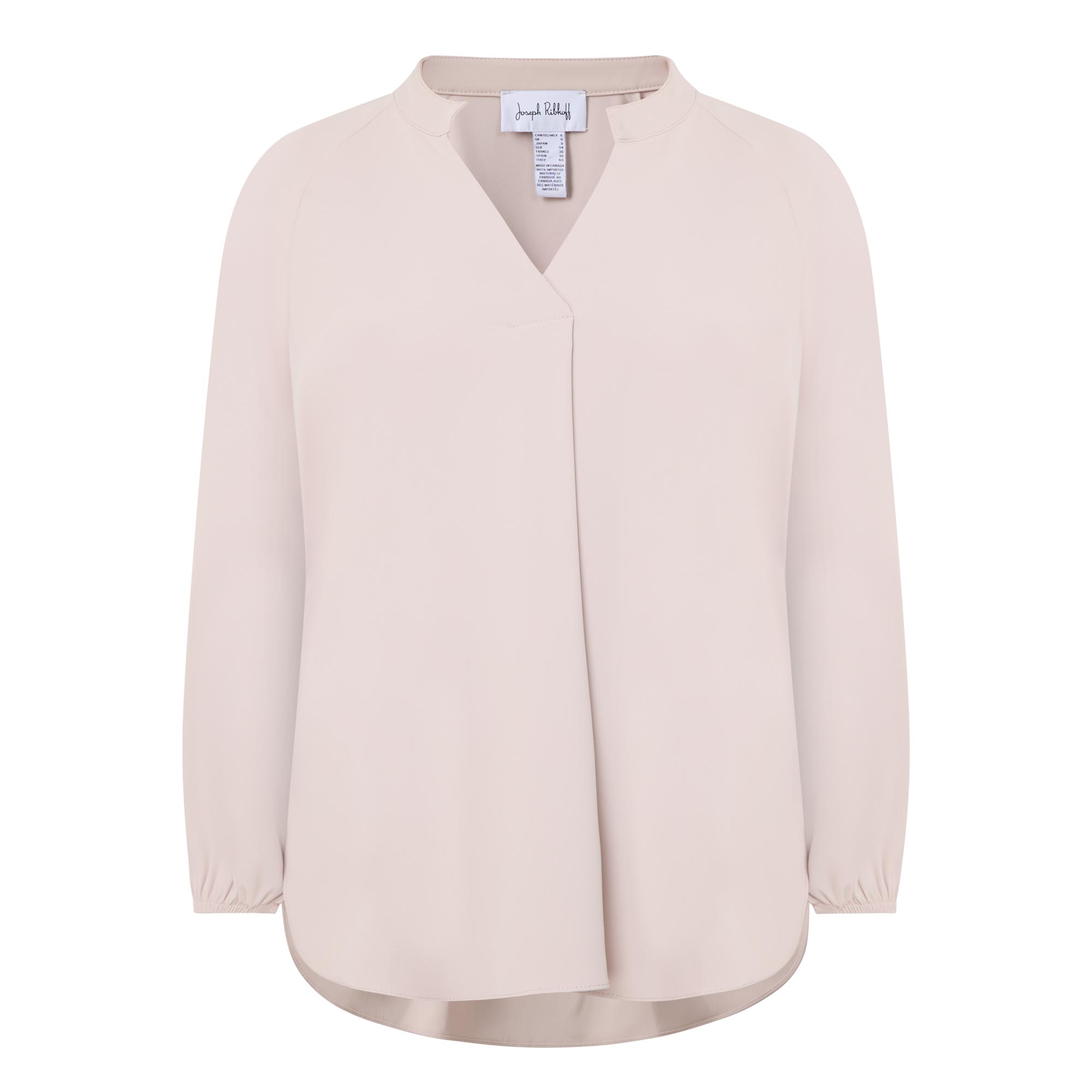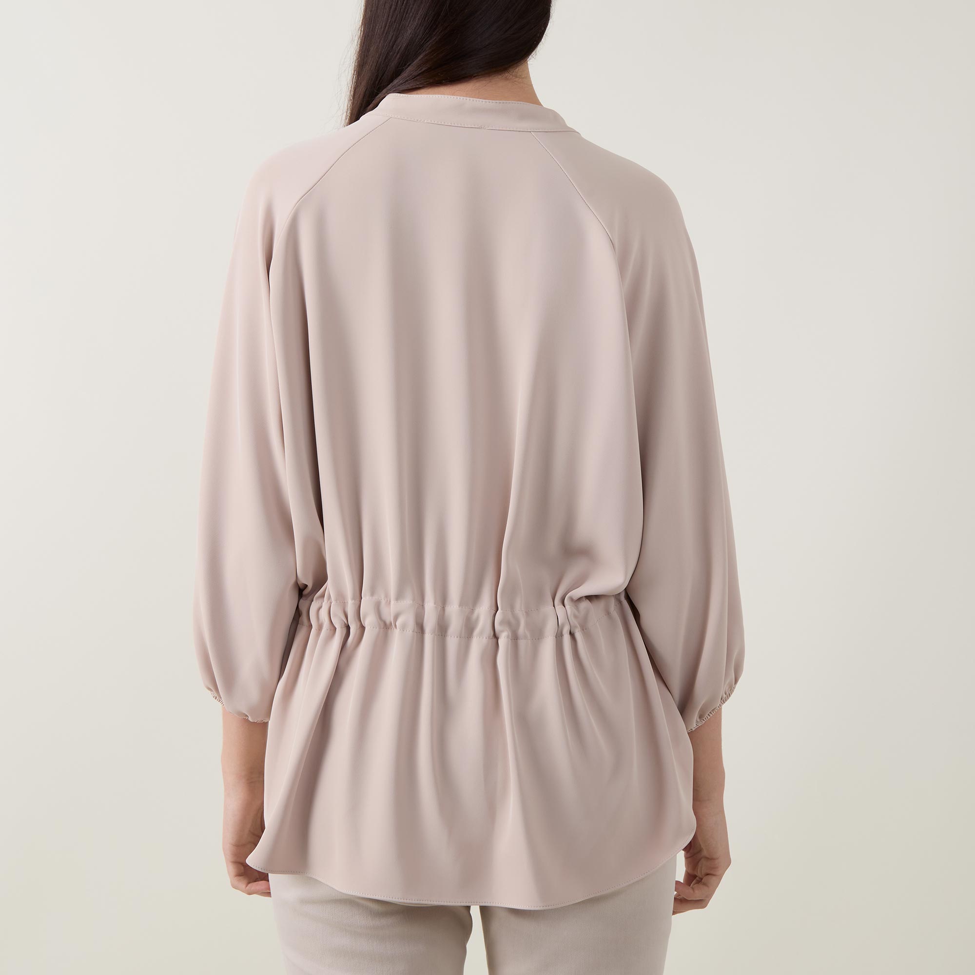 - Mandarin collar, V-neckline, front pleat detailing, three quarter length sleeves, elasticated cuffs, rear ruched elasticated waistband, curved hem, woven construction, smooth finish