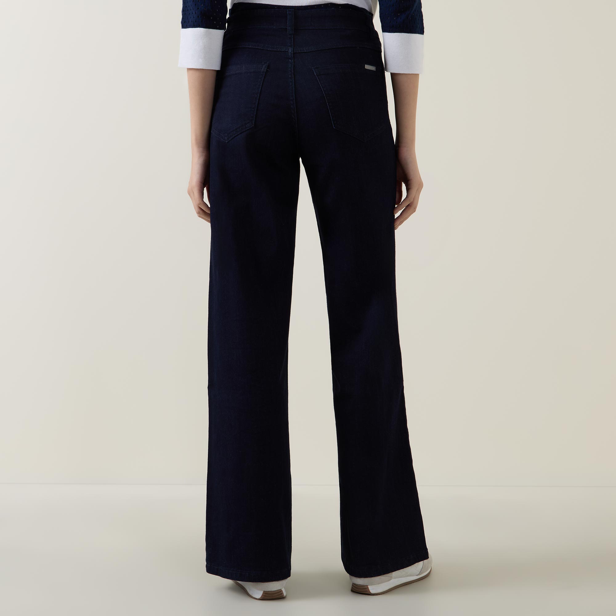 - Five pockets, wide leg, mid-rise, back logo plaque, belt loops