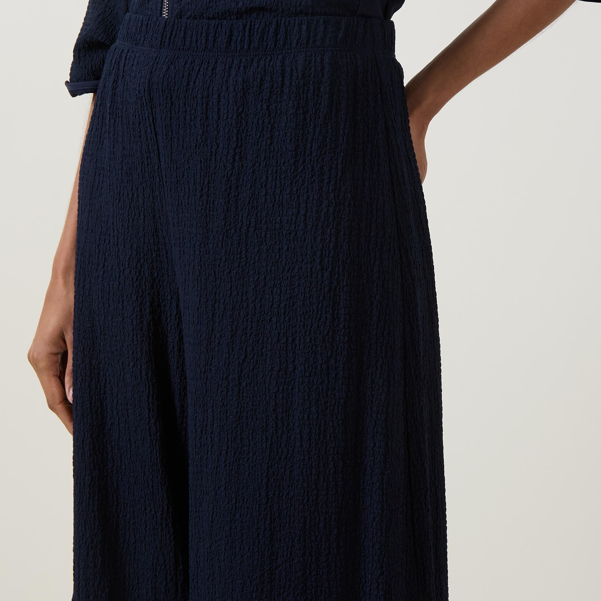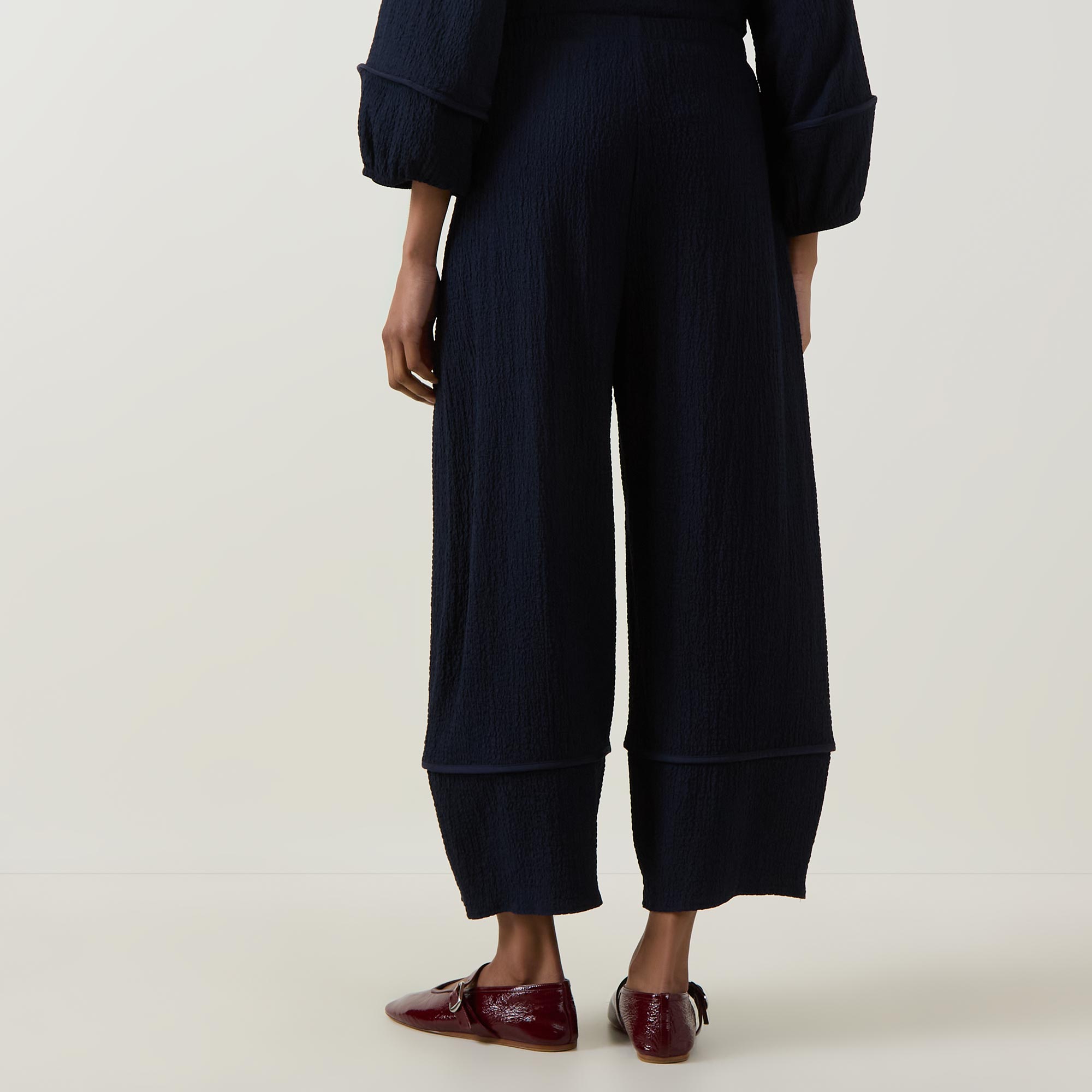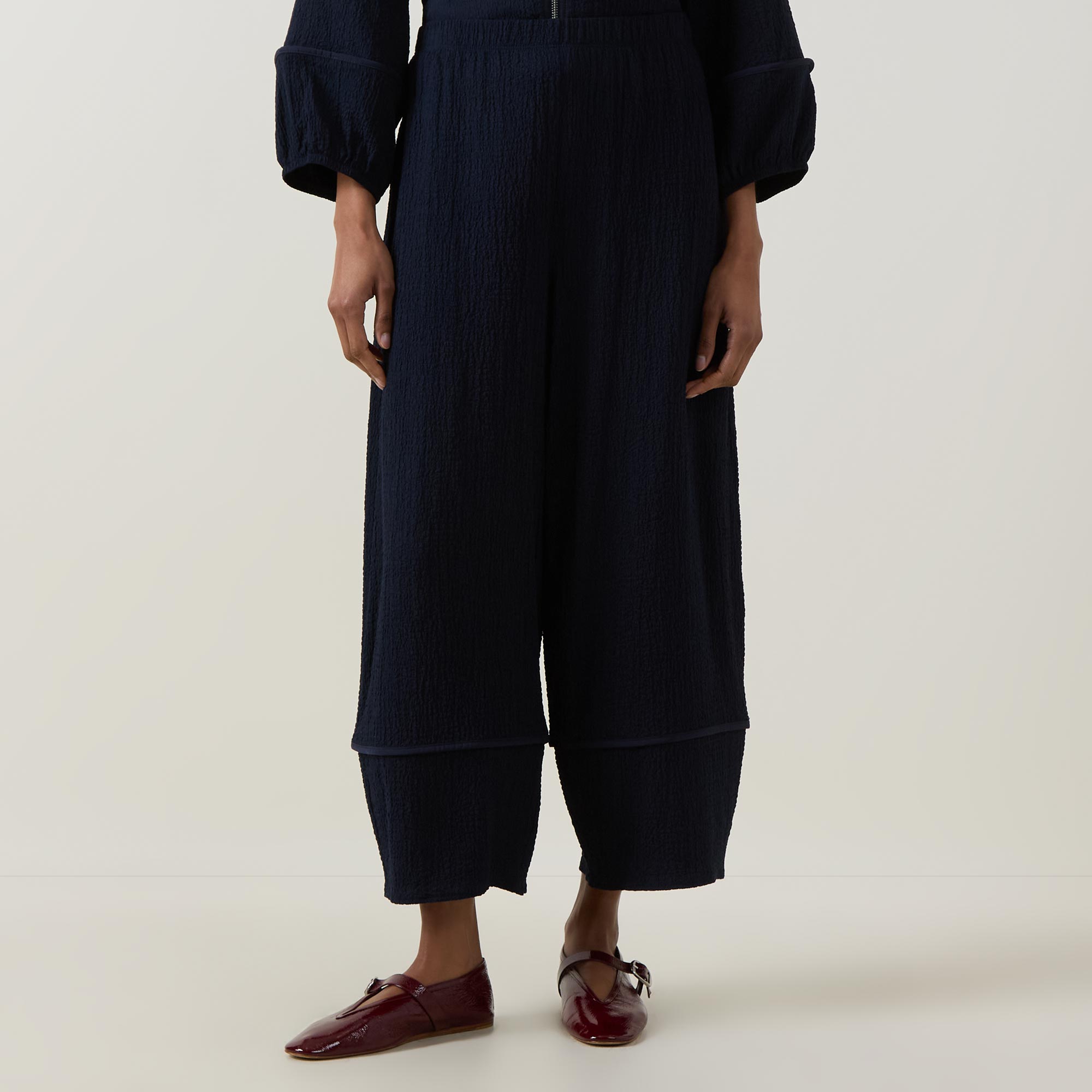 • Elasticated waistband, balloon-style silhouette, seam details, seersucker texture