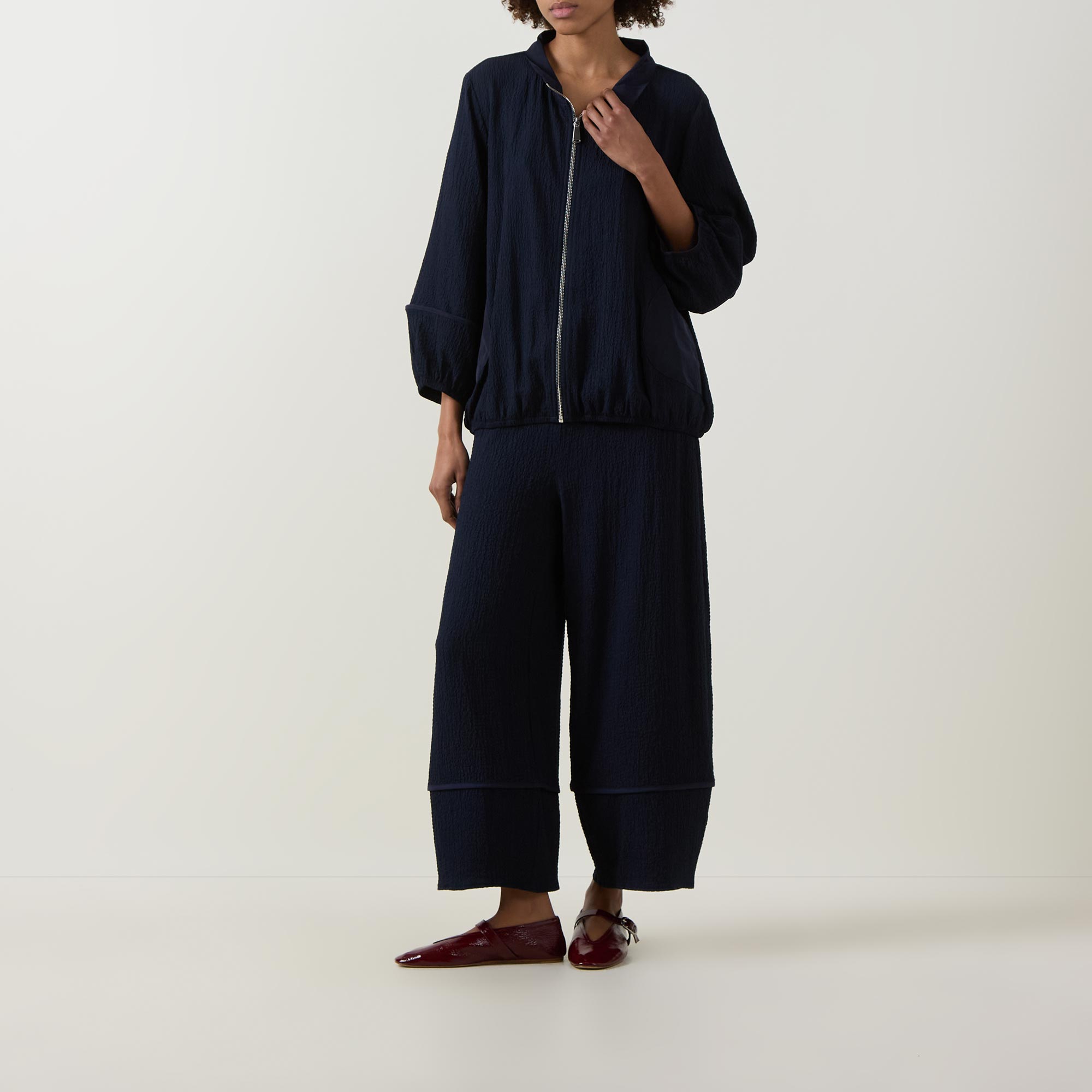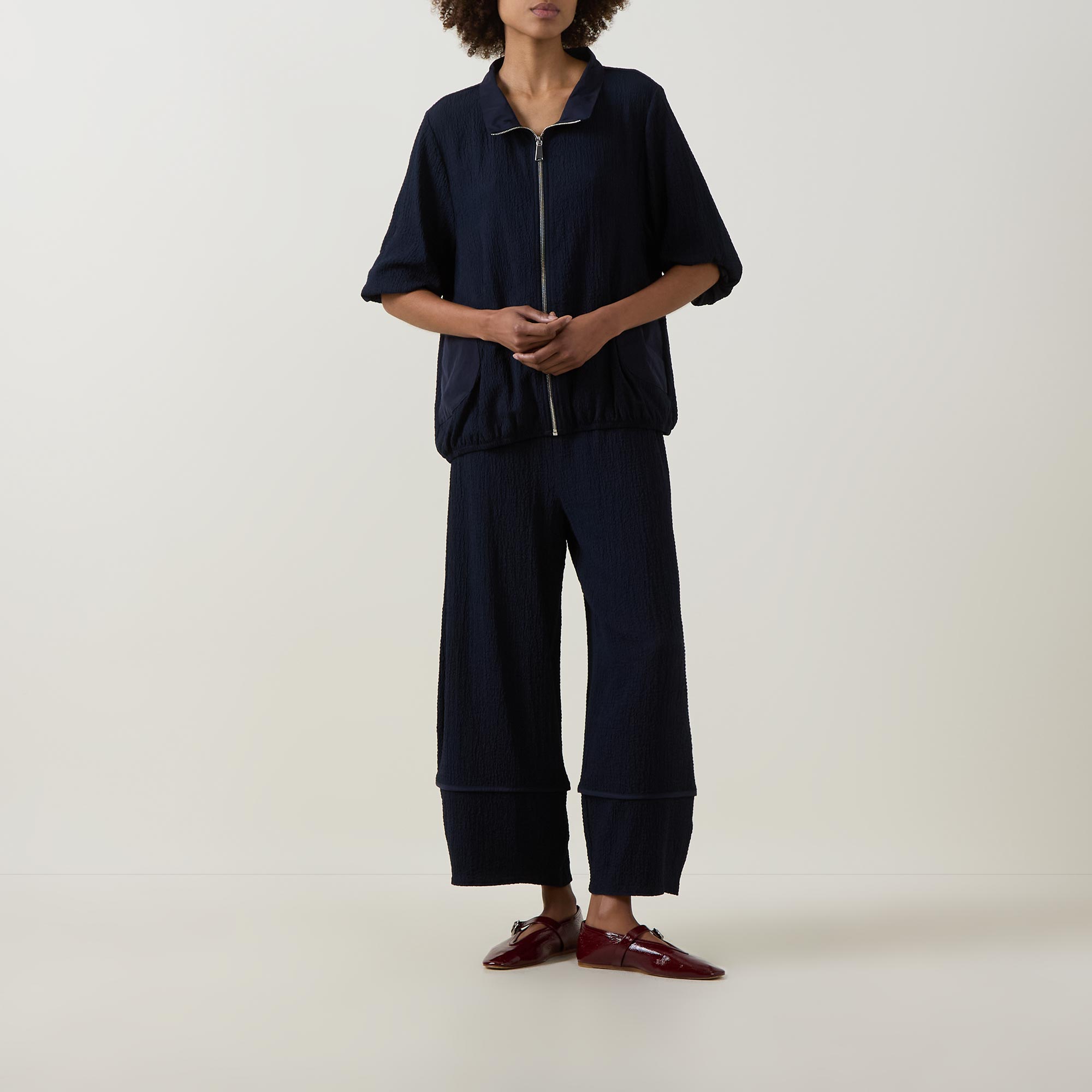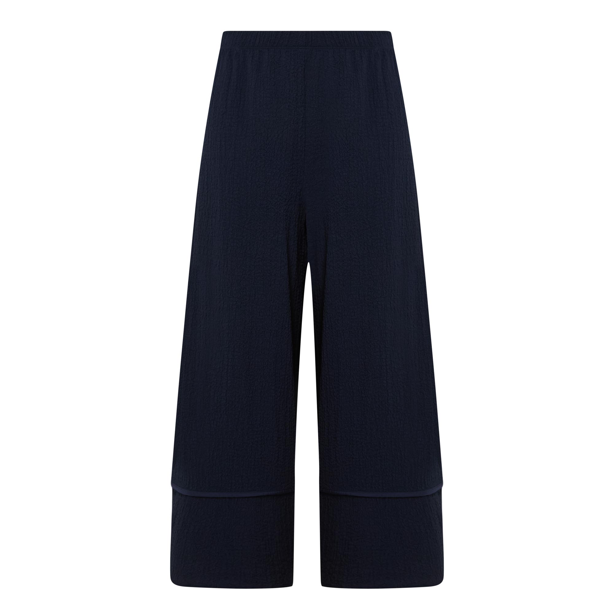 • Elasticated waistband, balloon-style silhouette, seam details, seersucker texture