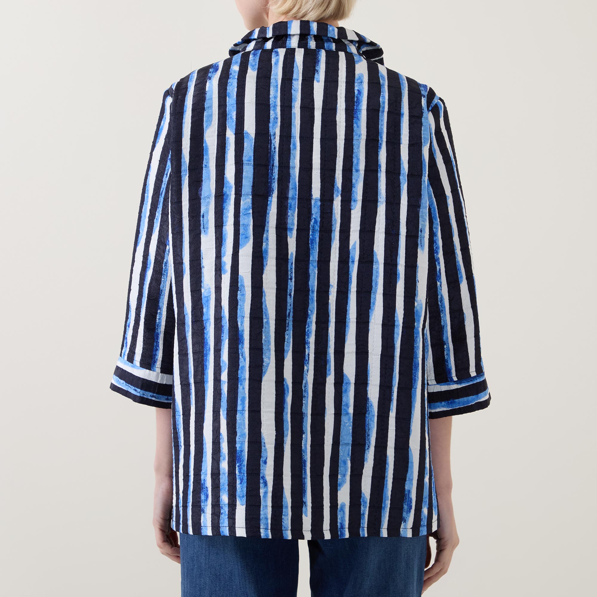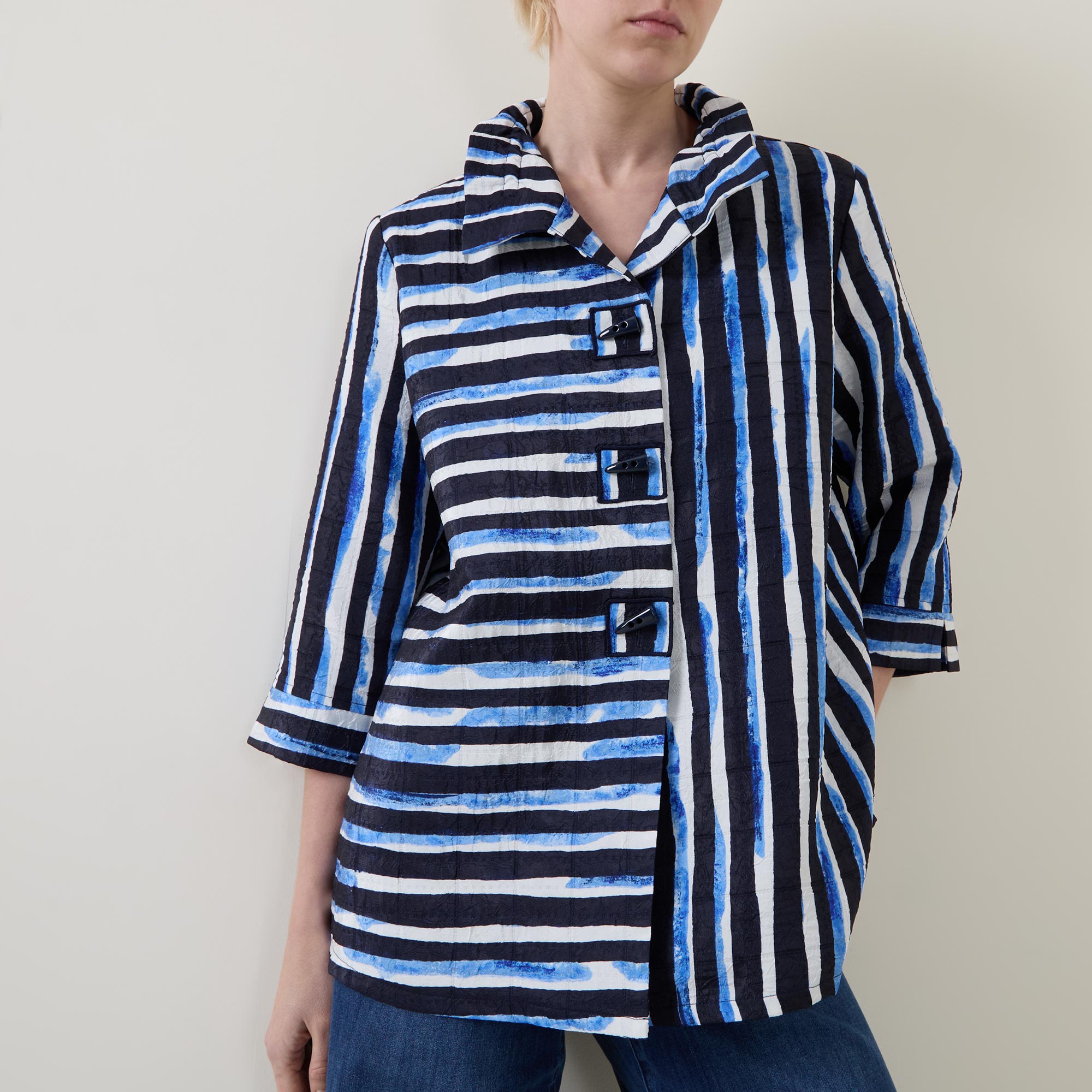 - Fold down collar, three quarter length bell sleeves, front button fastening, straight hem, abstract striped design, lightweight