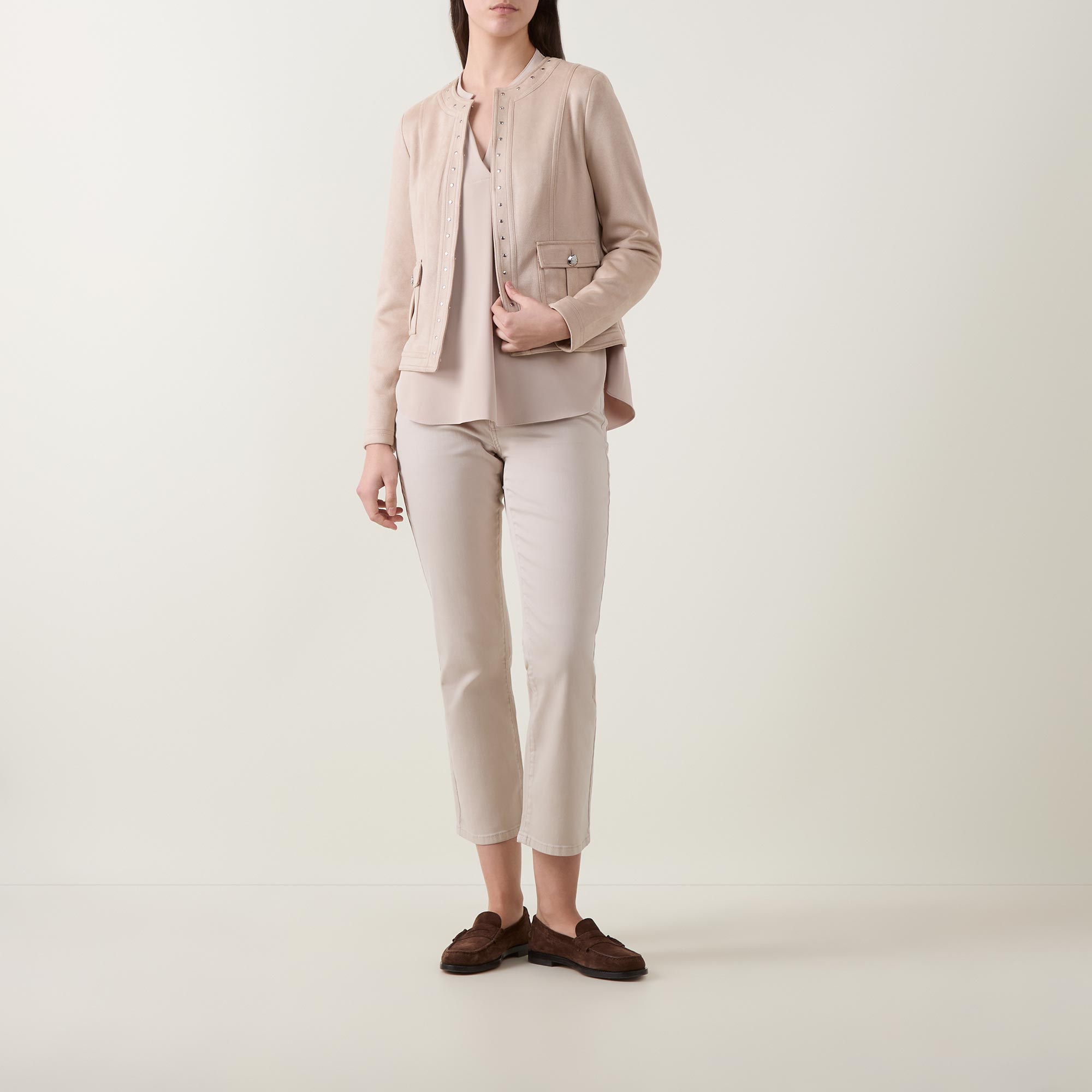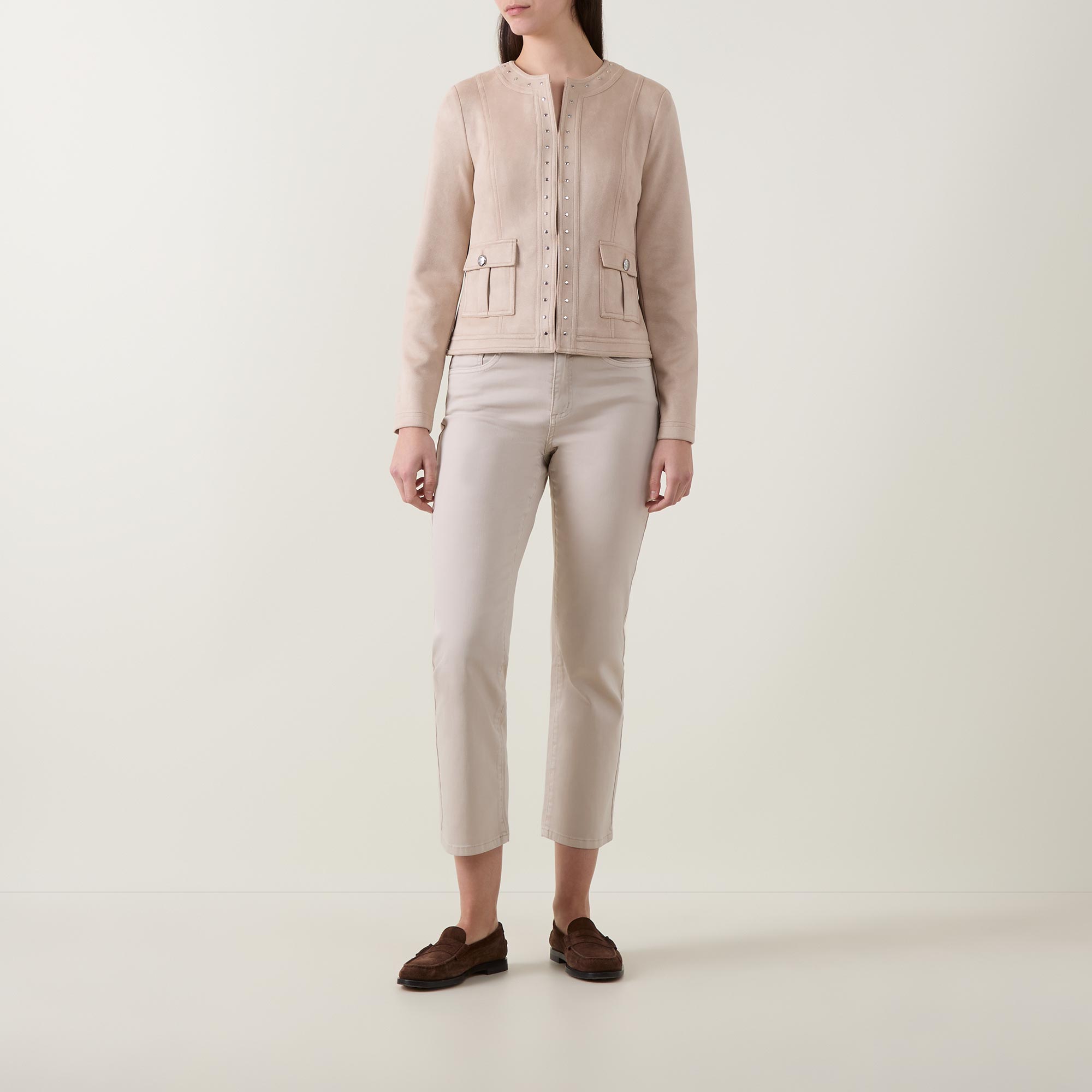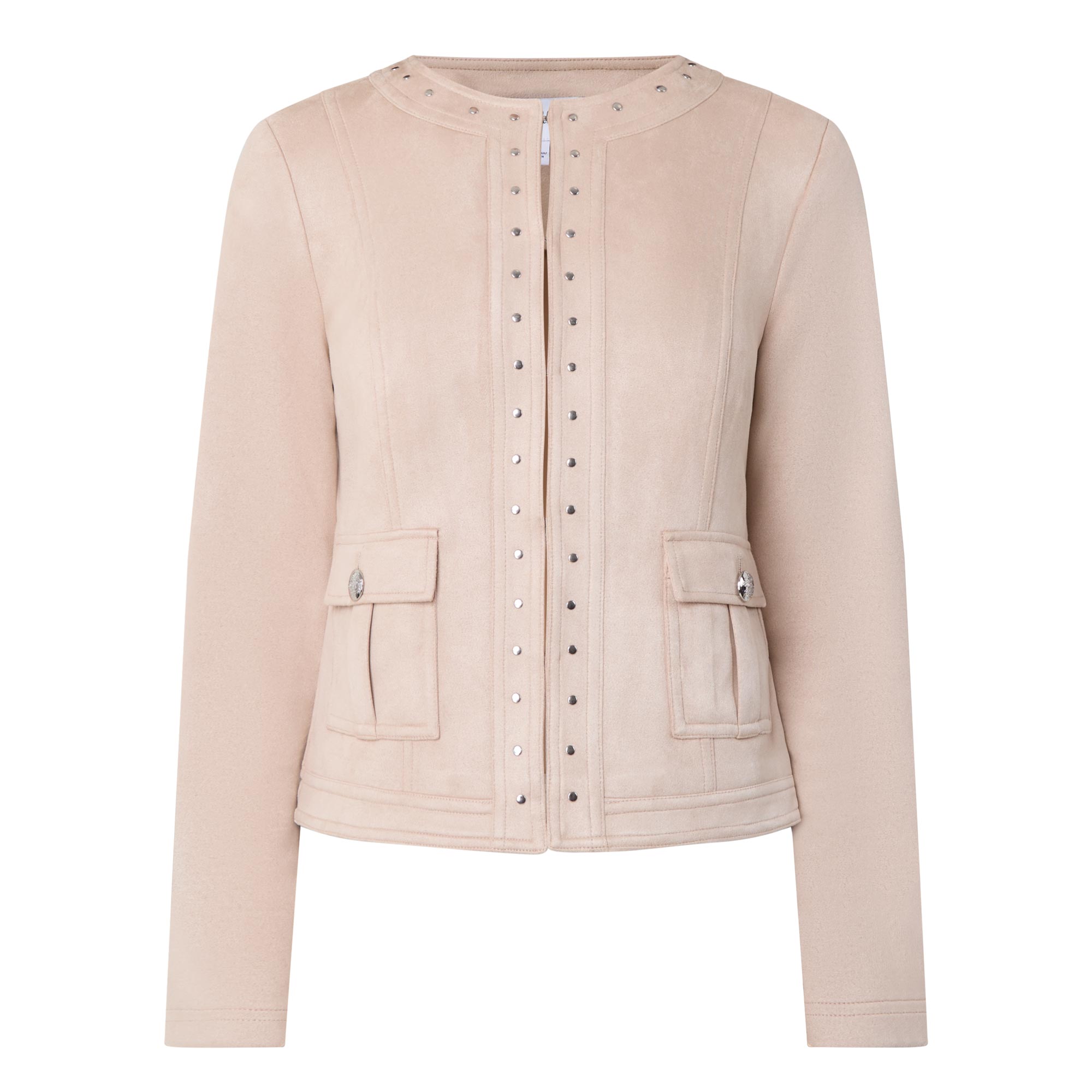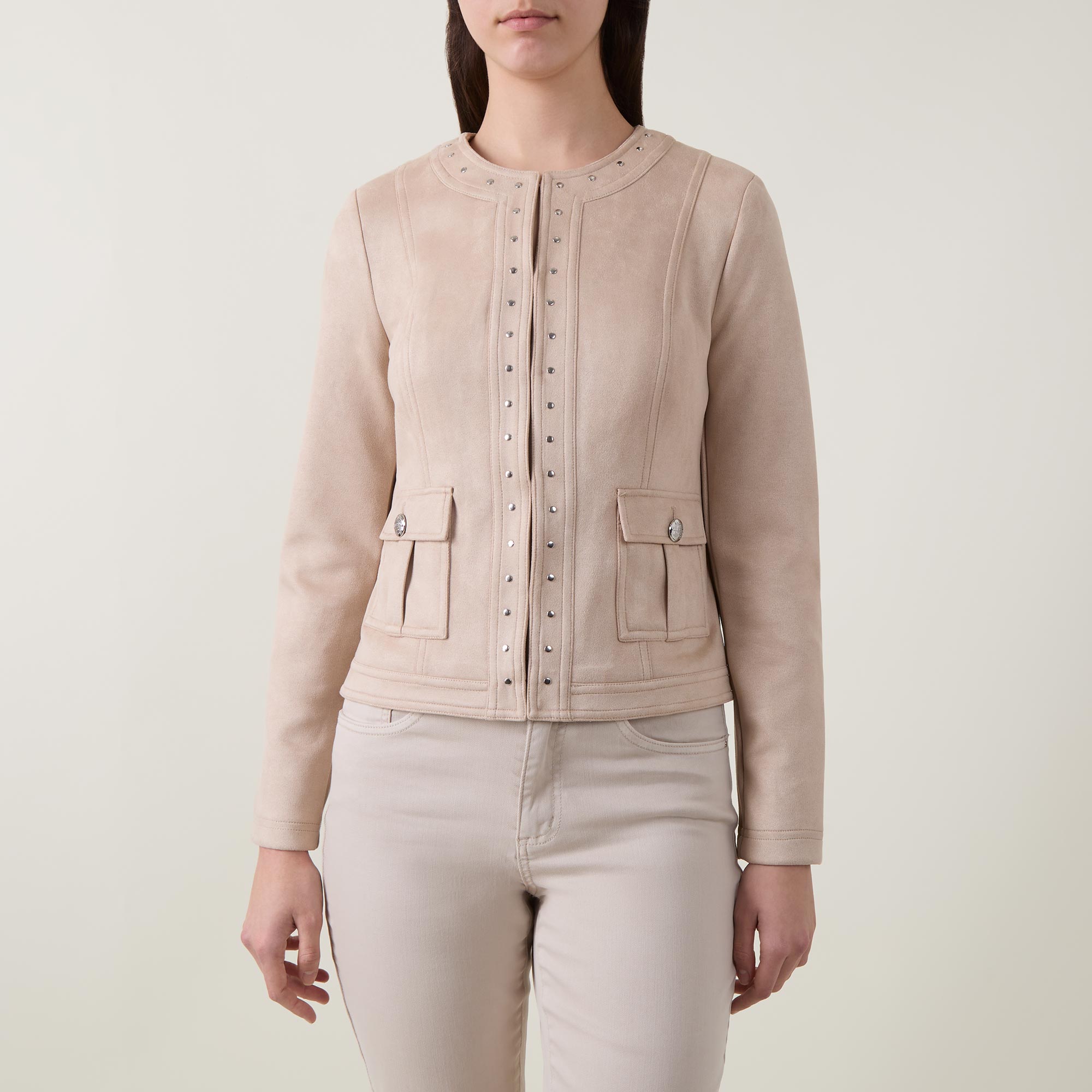 - Collarless, structured shoulders, long sleeves, concealed hook and eye fastening, two front flap pockets with button fastenings, straight hem, cropped length, studded trim detailing, faux suede finish