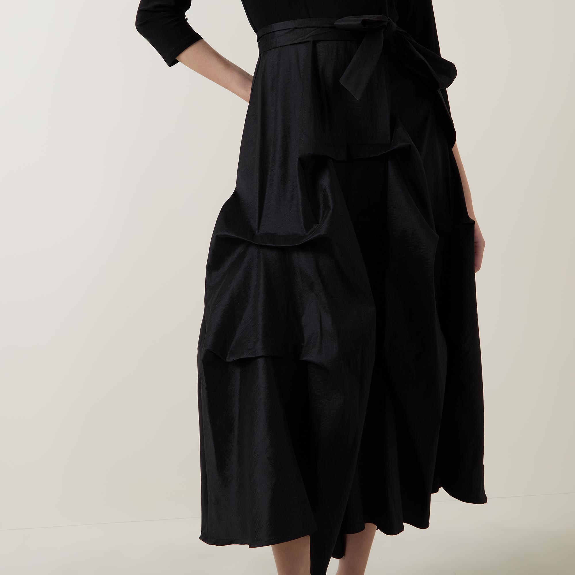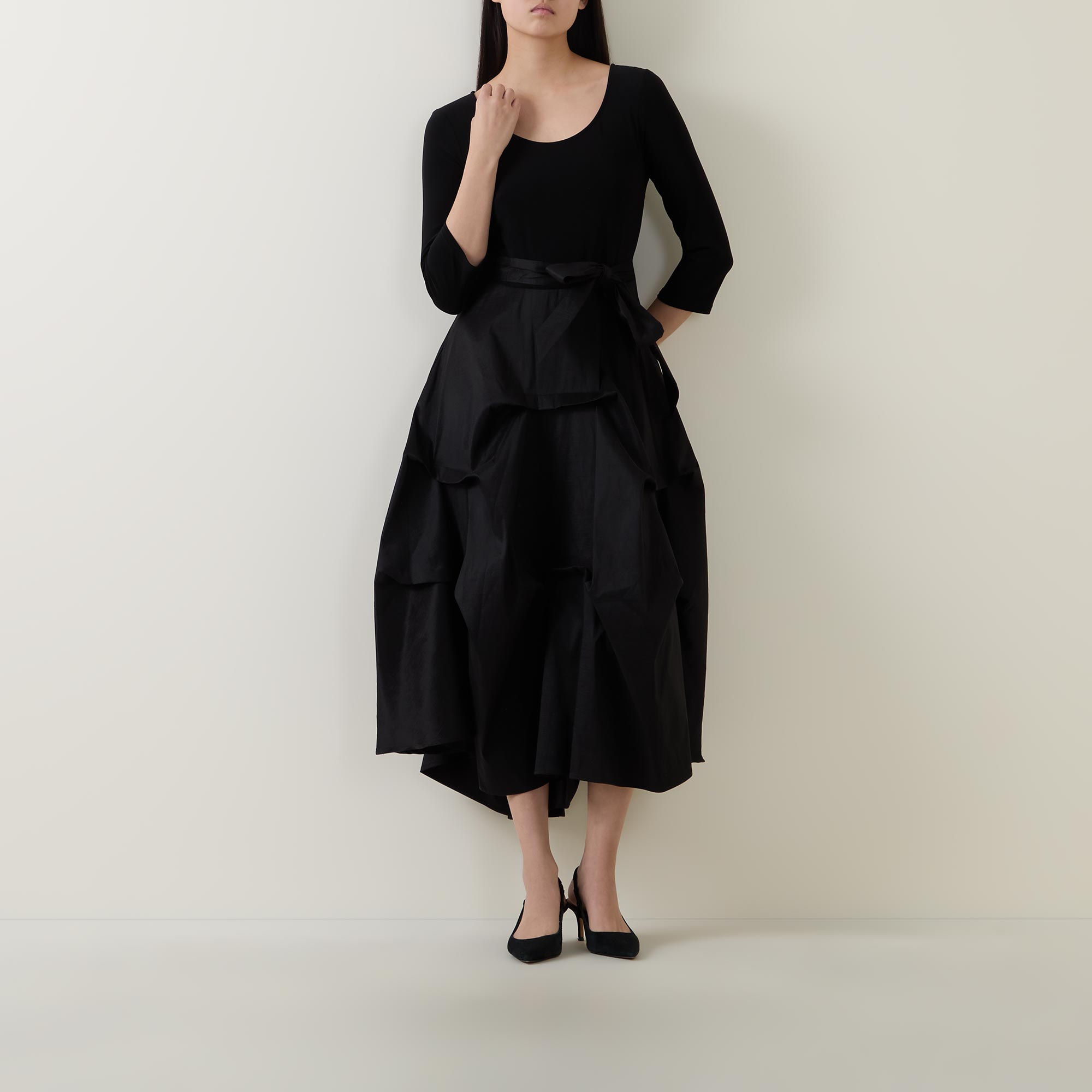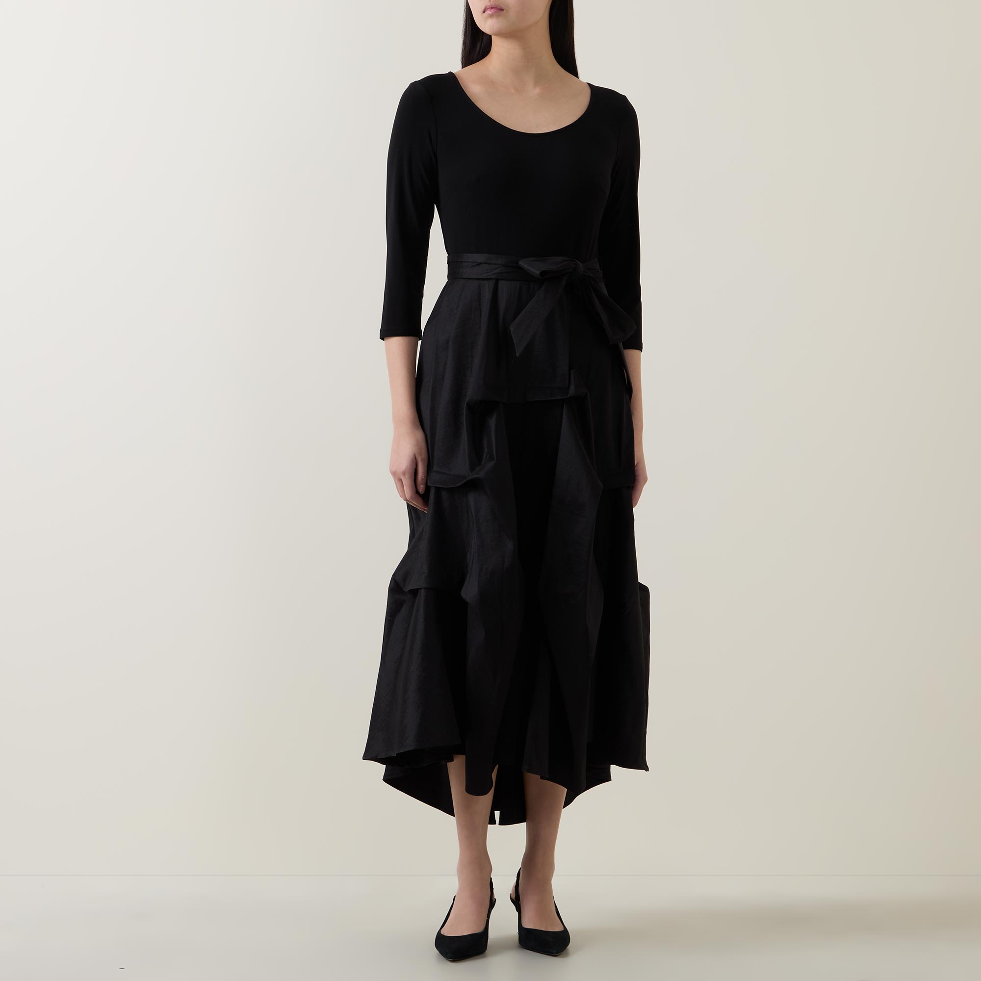 • Pleat-up pleats, midi length, self-tying sash, cropped sleeves, round neck