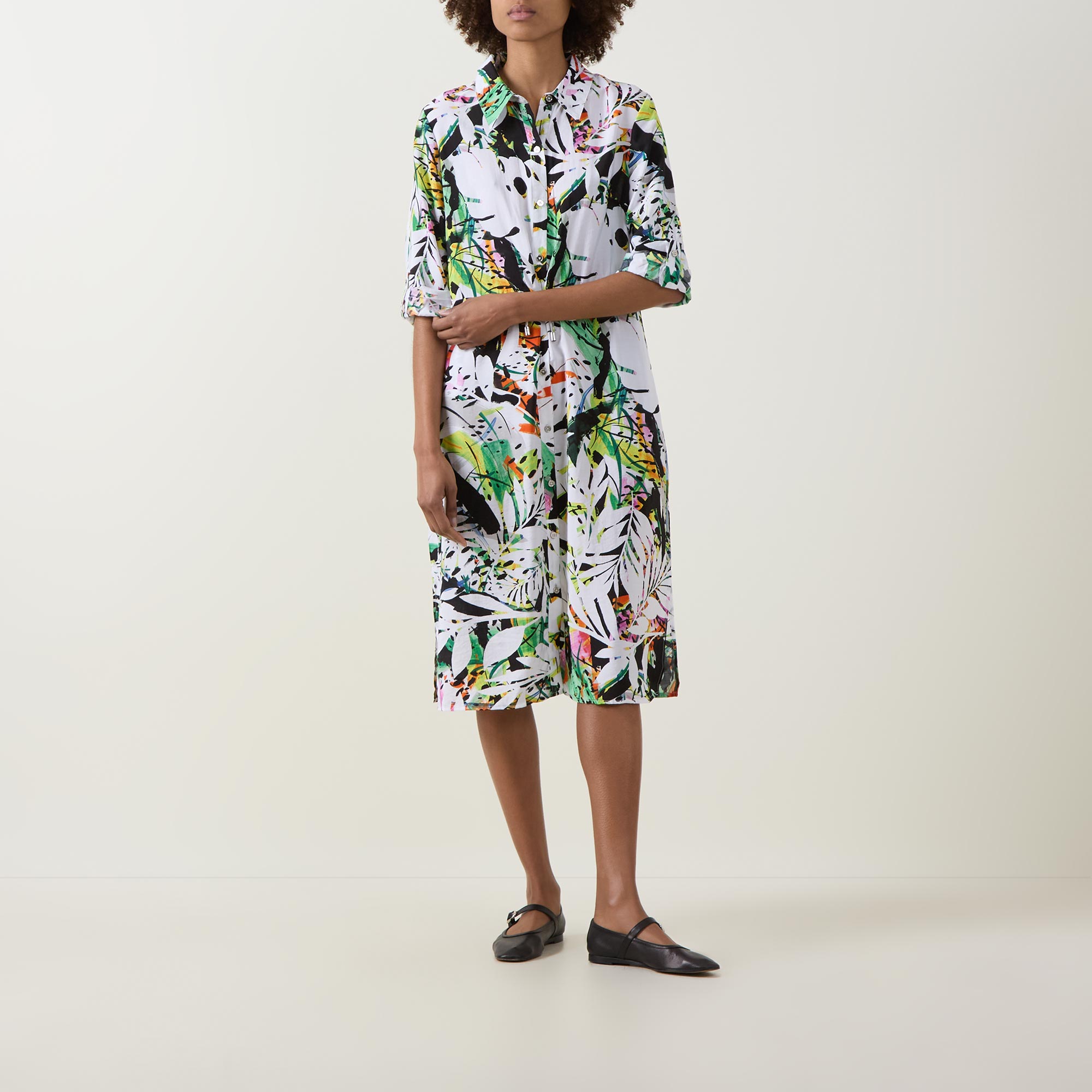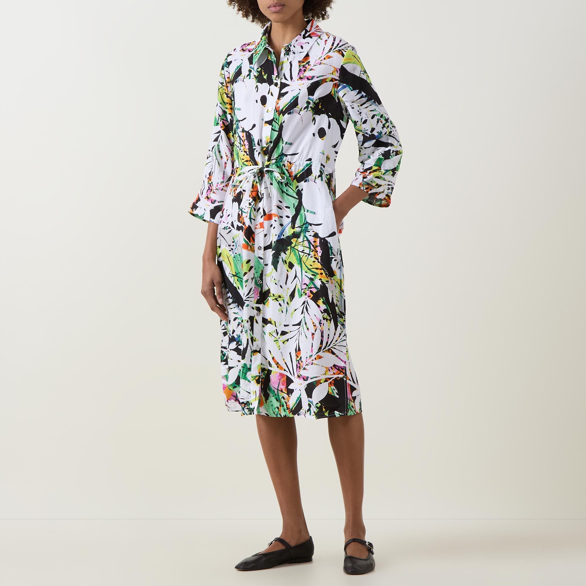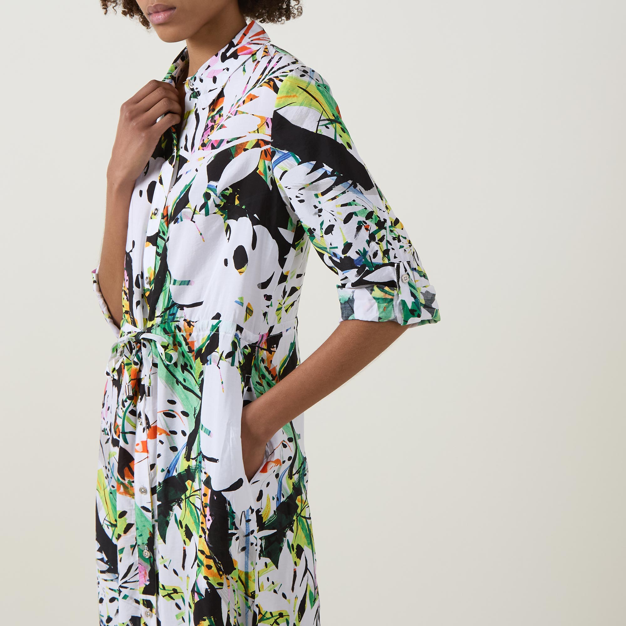 - Collared neckline, button fastening, three-quarter-length sleeves, midi length, side entry pockets, self-tie belt, split side seams, tropical print