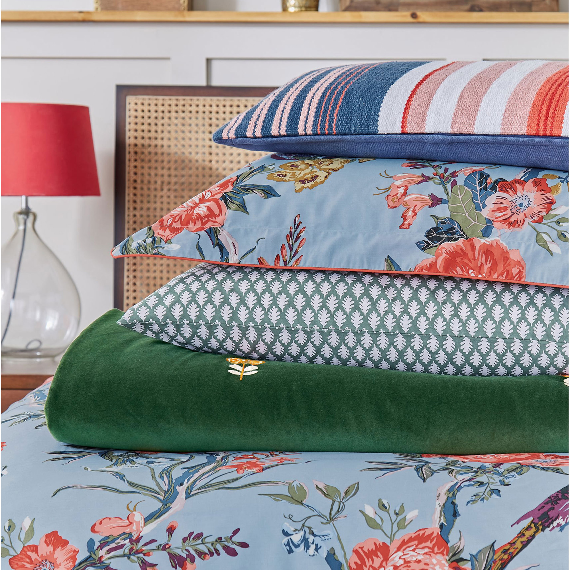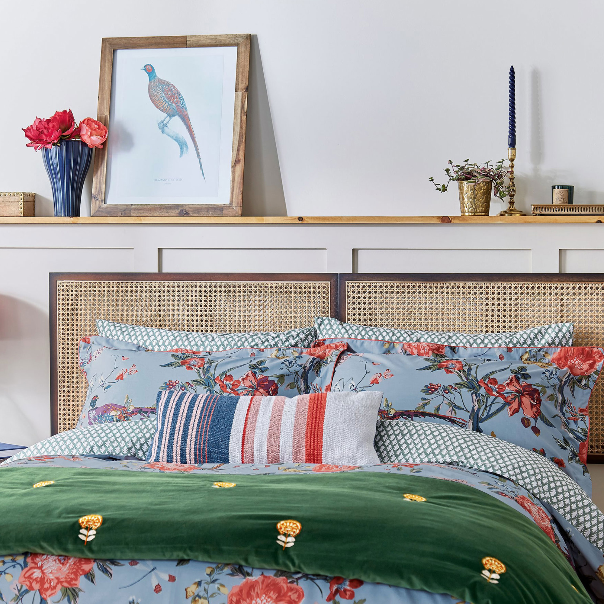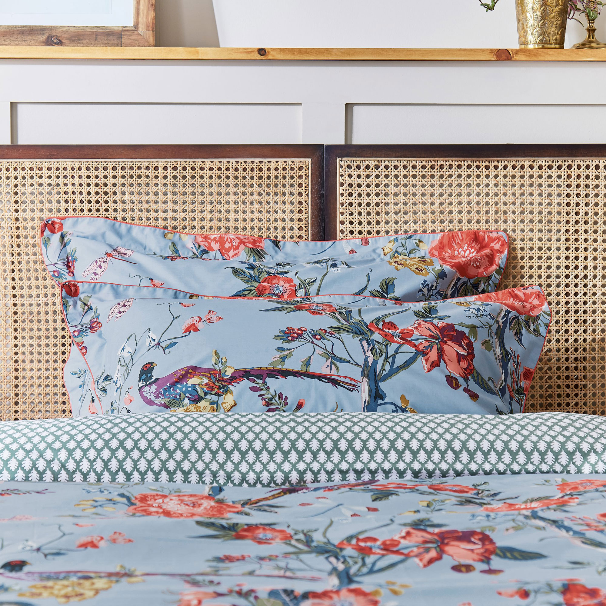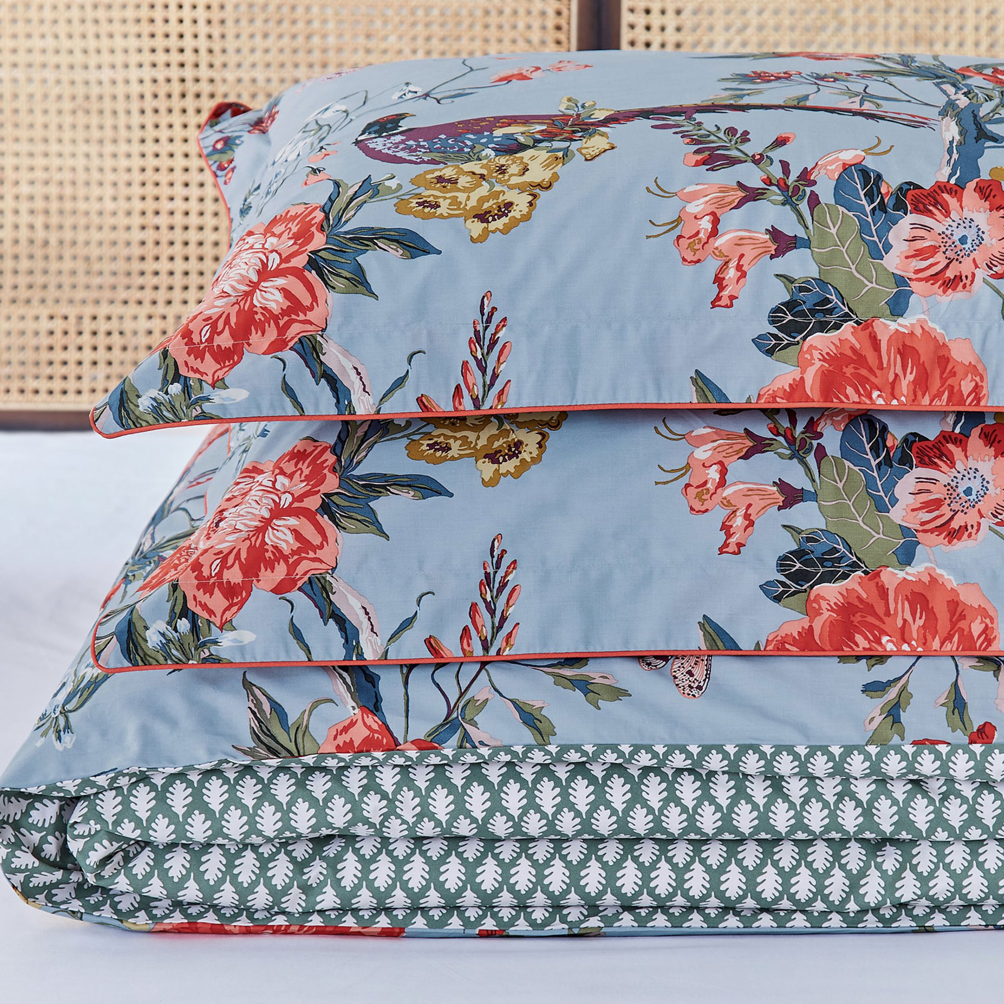 The Chinoise Floral bedding set captures the arrival of autumn in the countryside. It features all the tones of the season, including burnt orange, burgundy and yellow all set against a crisp blue background. The appearance of wildlife, berries and chestnuts add to that autumnal feel. Double-sided, the reverse of the duvet features an oak leaf print in a soft green and crème colour palette. This set comes with two matching Oxford pillowcases (single beds come with one) and can be complemented by additional standard pillowcases sold separately.